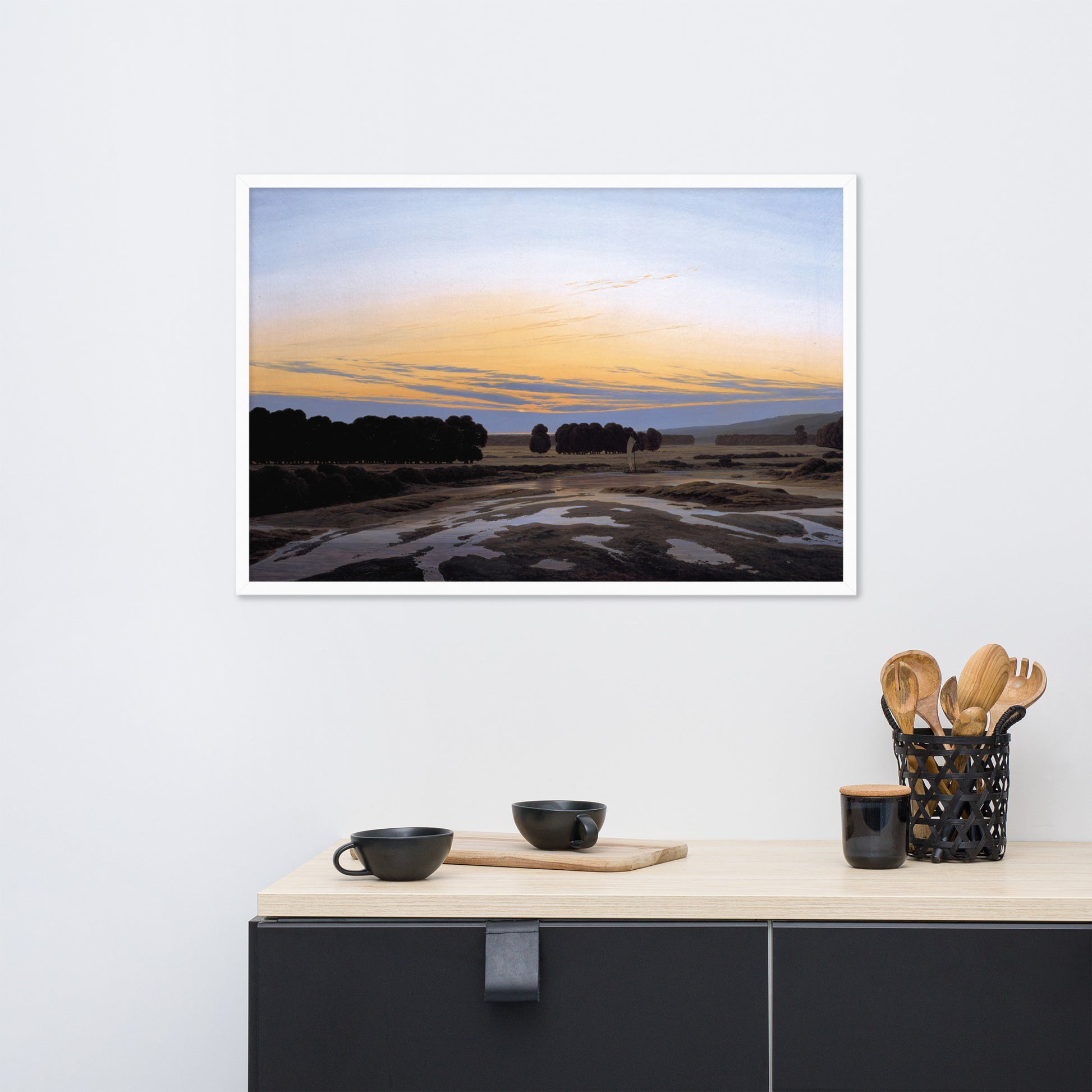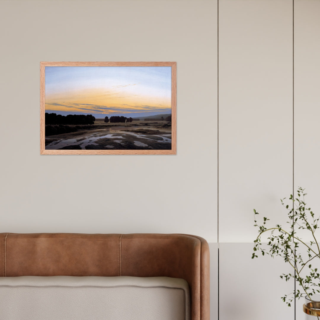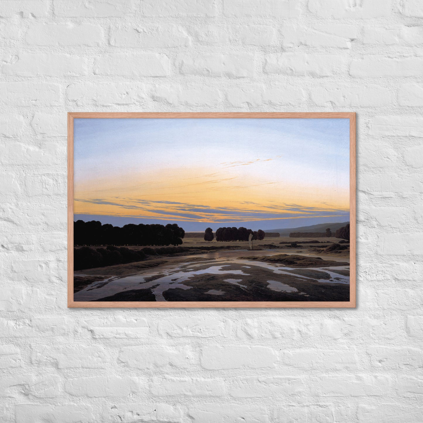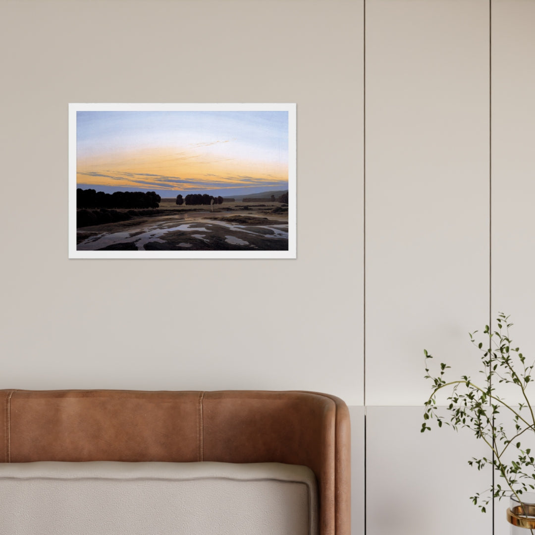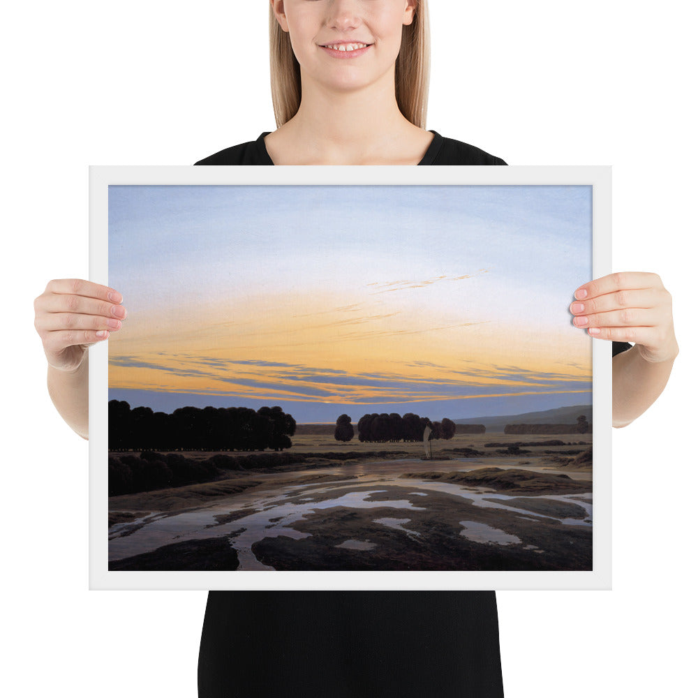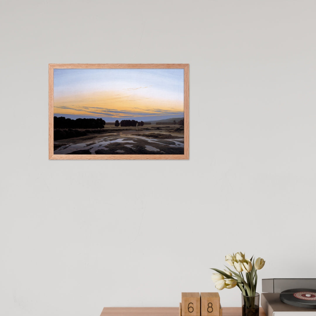 The Great Enclosure by Caspar David Friedrich is a serene meditation on light, solitude, and the passage of time. This Romanticism-era landscape captures the quiet drama of twilight—where silhouetted trees and reflective waters meet a vast, glowing sky. The composition invites viewers into a contemplative space, evoking themes of transience, nature’s grandeur, and emotional stillness.