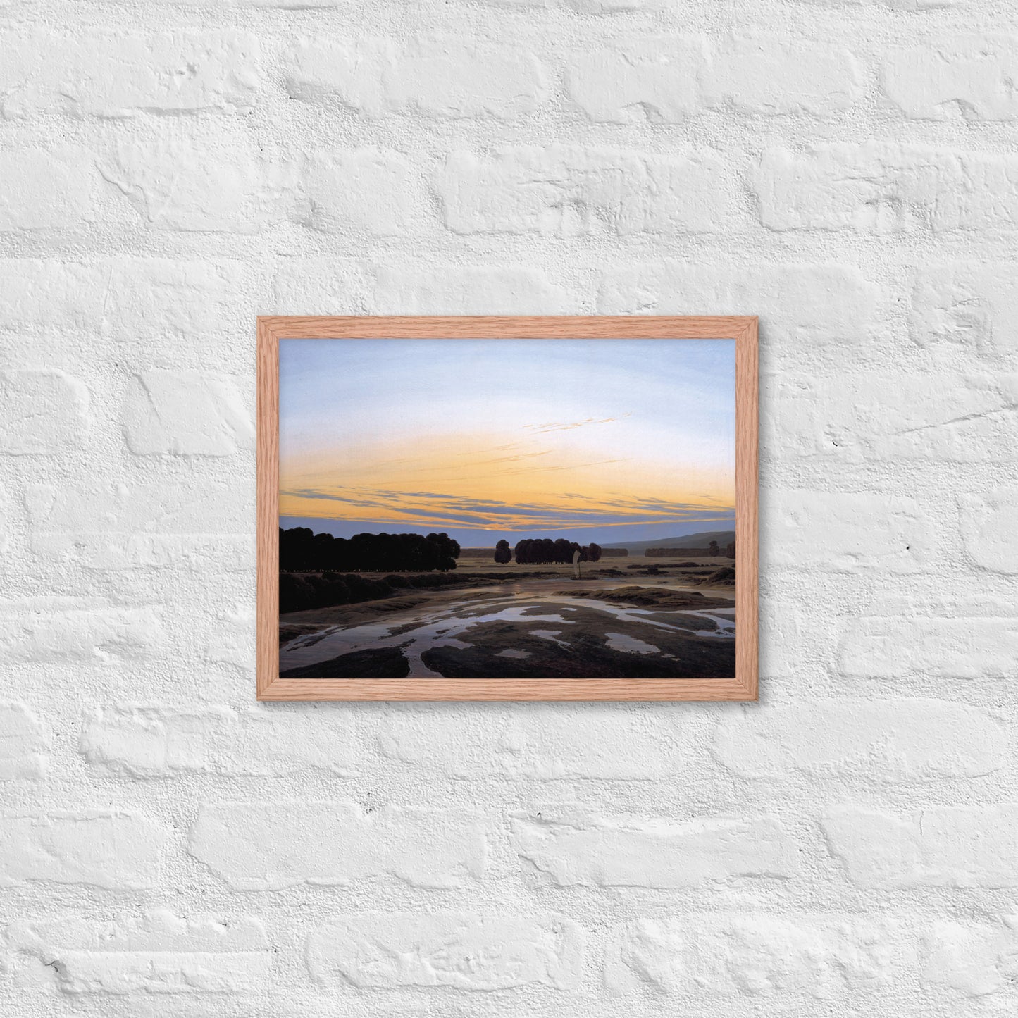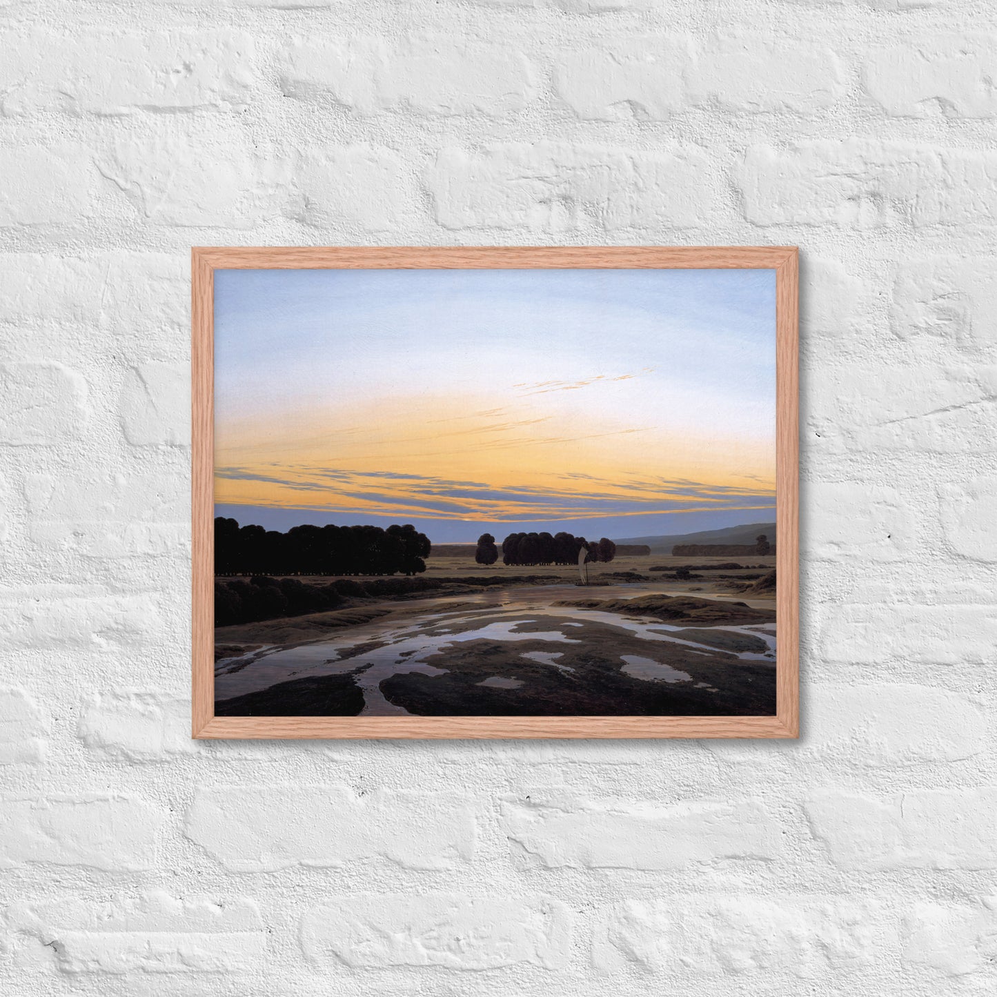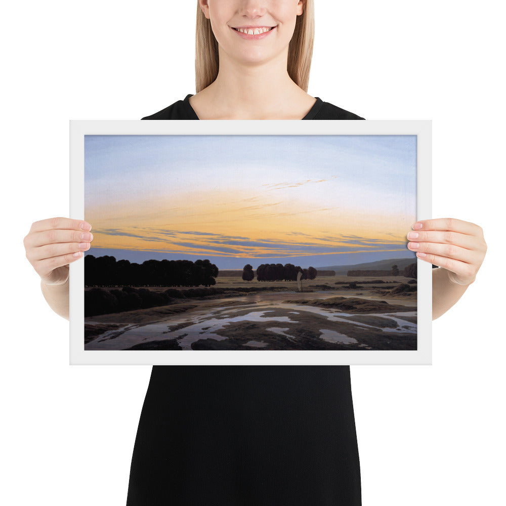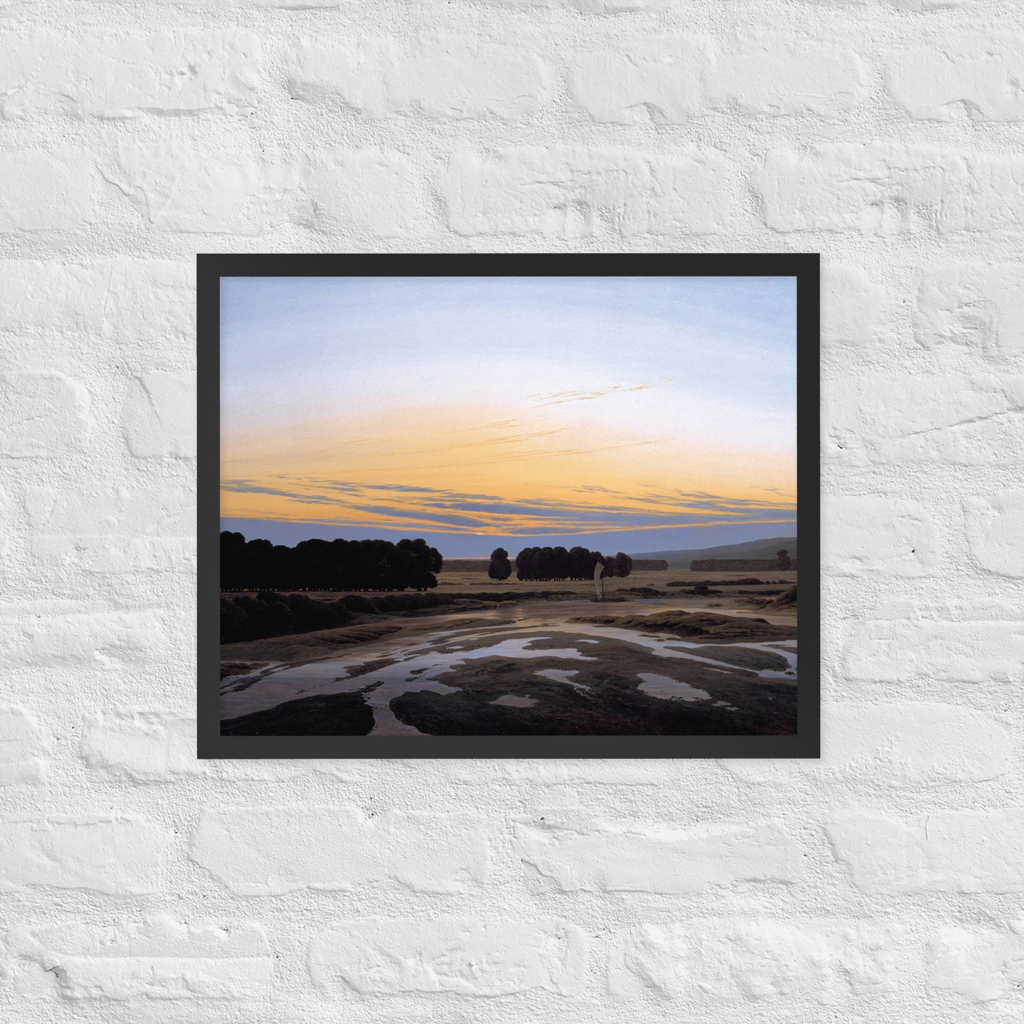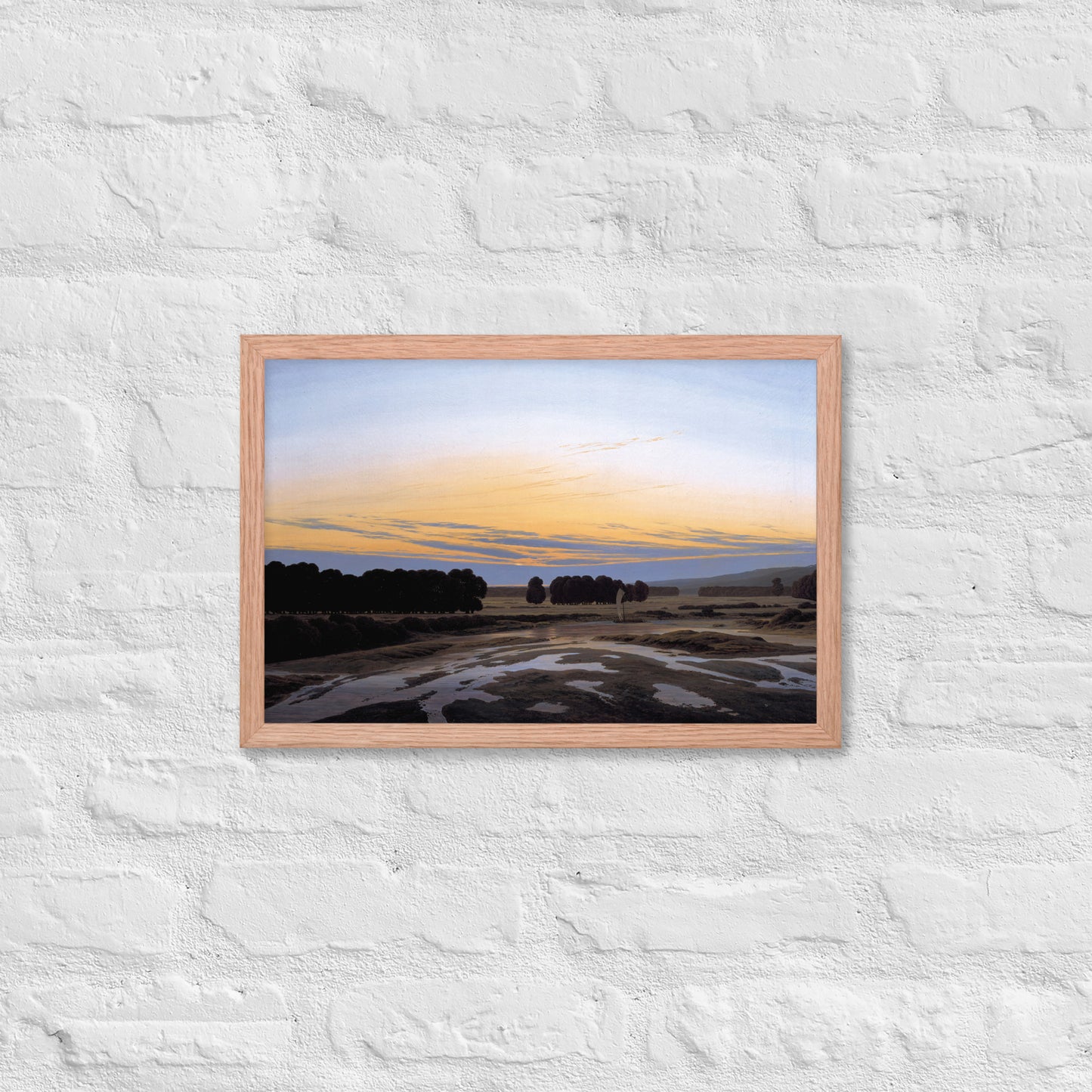 The Great Enclosure by Caspar David Friedrich is a serene meditation on light, solitude, and the passage of time. This Romanticism-era landscape captures the quiet drama of twilight—where silhouetted trees and reflective waters meet a vast, glowing sky. The composition invites viewers into a contemplative space, evoking themes of transience, nature’s grandeur, and emotional stillness.