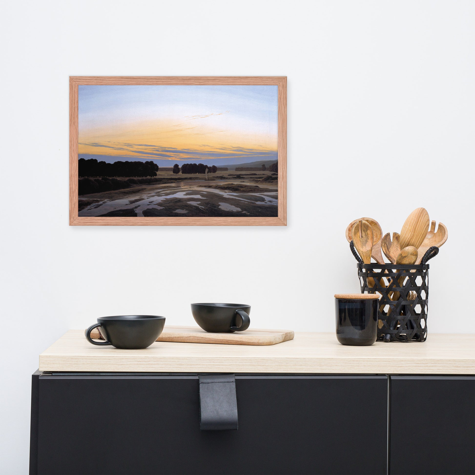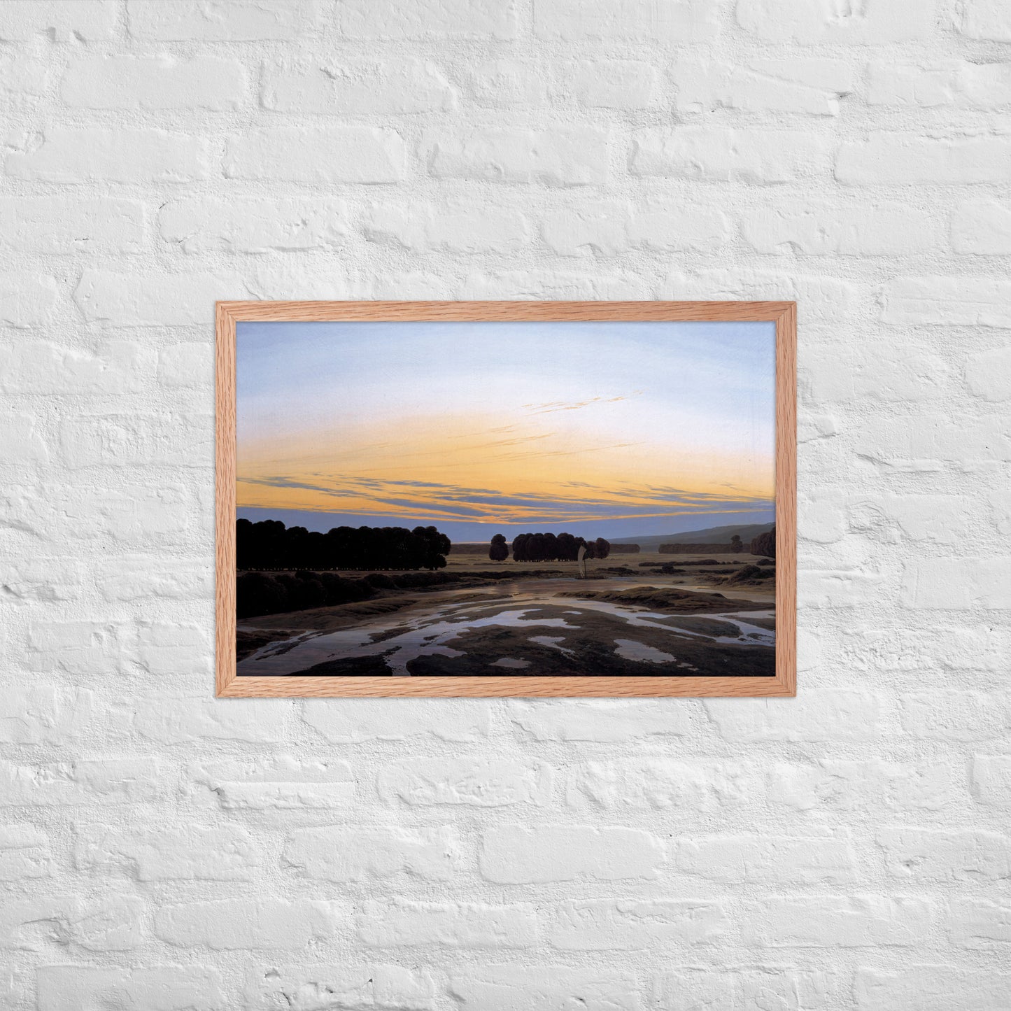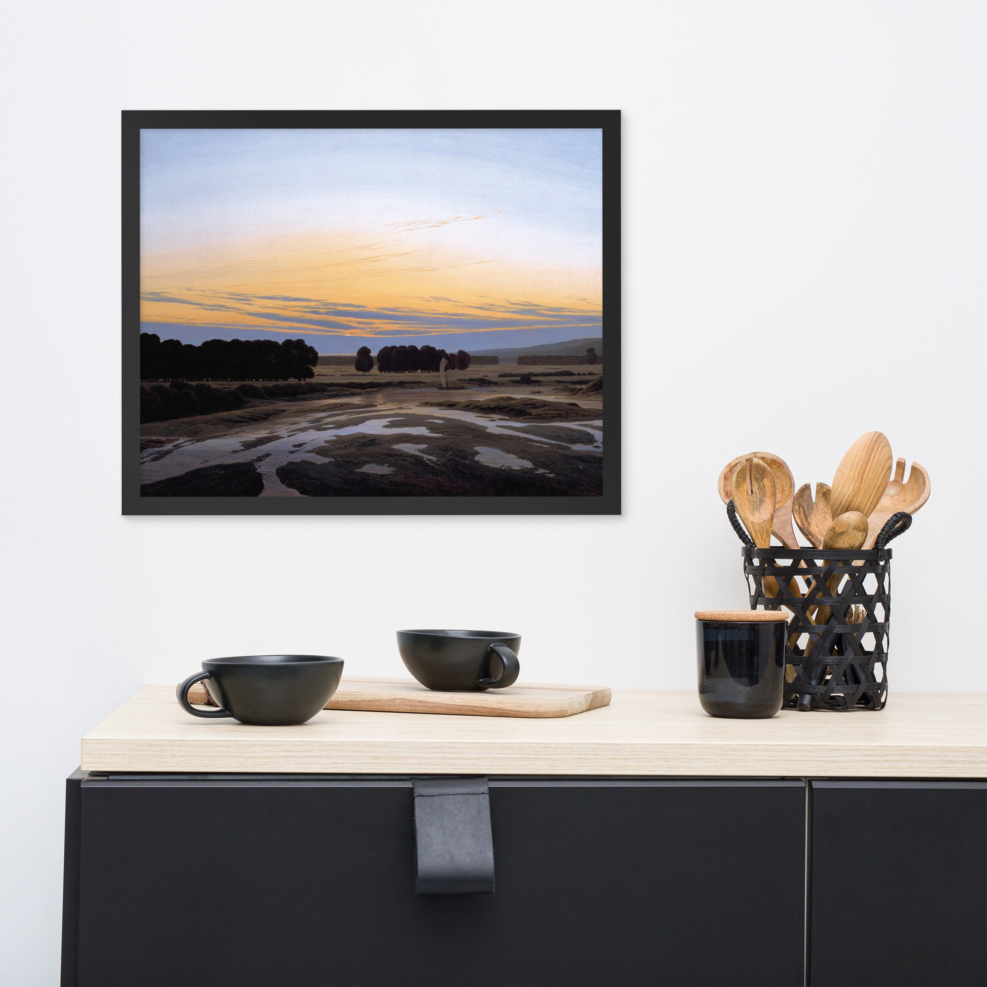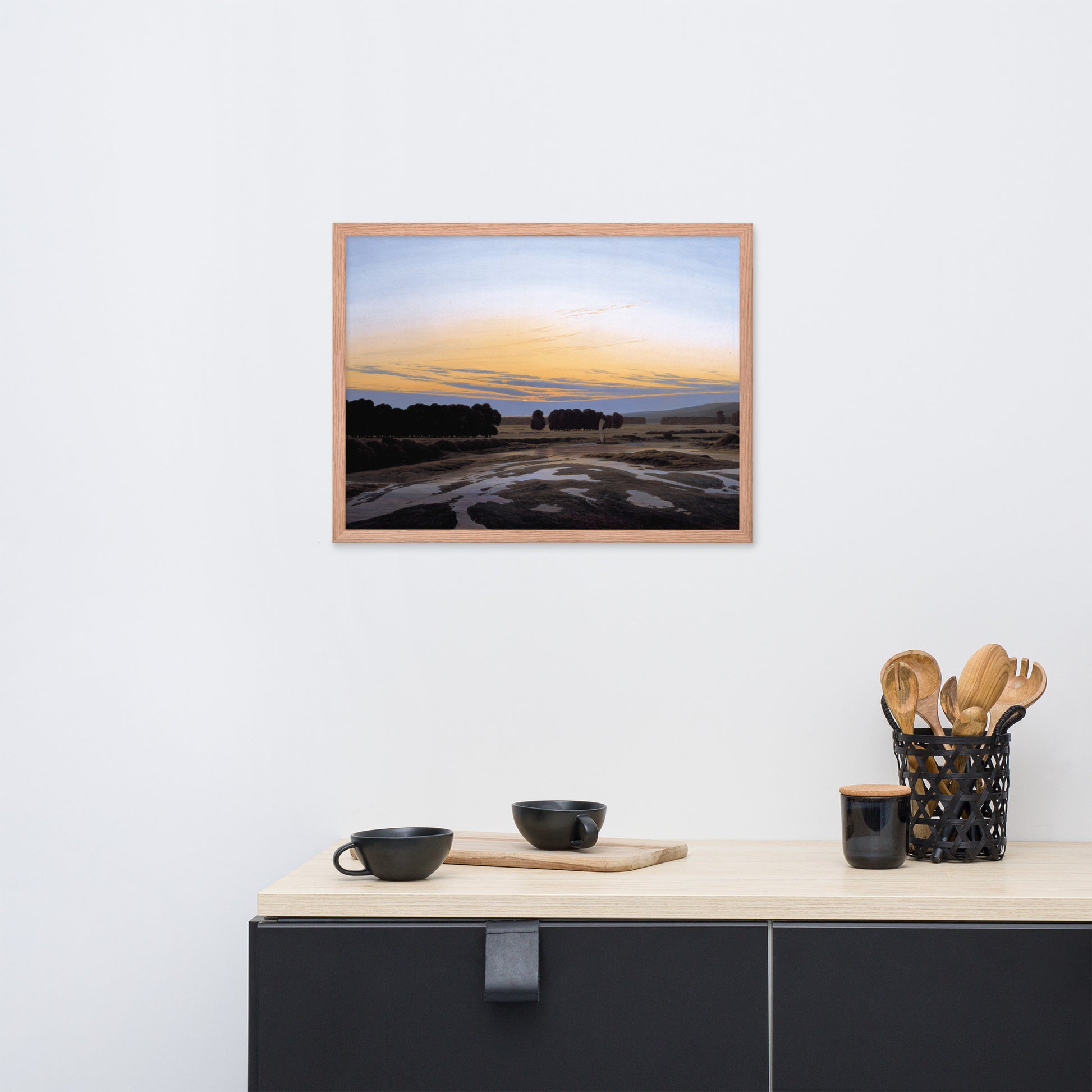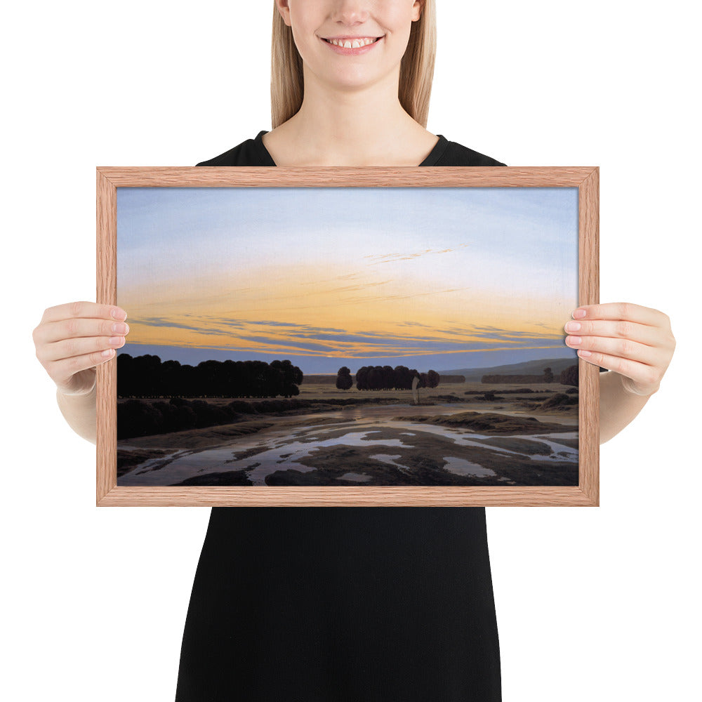 The Great Enclosure by Caspar David Friedrich is a serene meditation on light, solitude, and the passage of time. This Romanticism-era landscape captures the quiet drama of twilight—where silhouetted trees and reflective waters meet a vast, glowing sky. The composition invites viewers into a contemplative space, evoking themes of transience, nature’s grandeur, and emotional stillness.