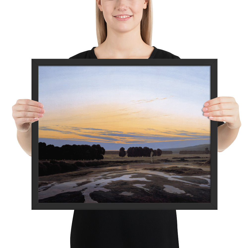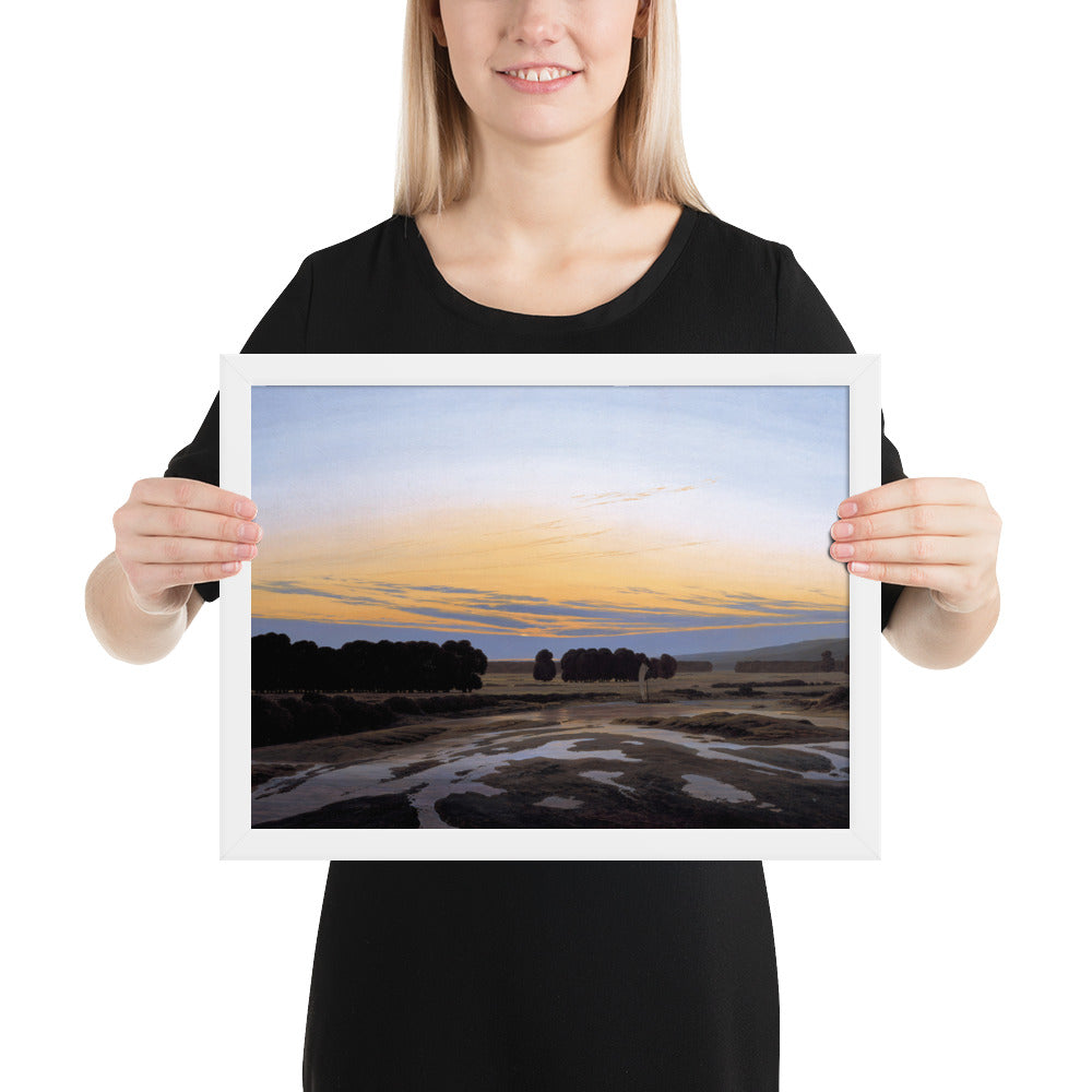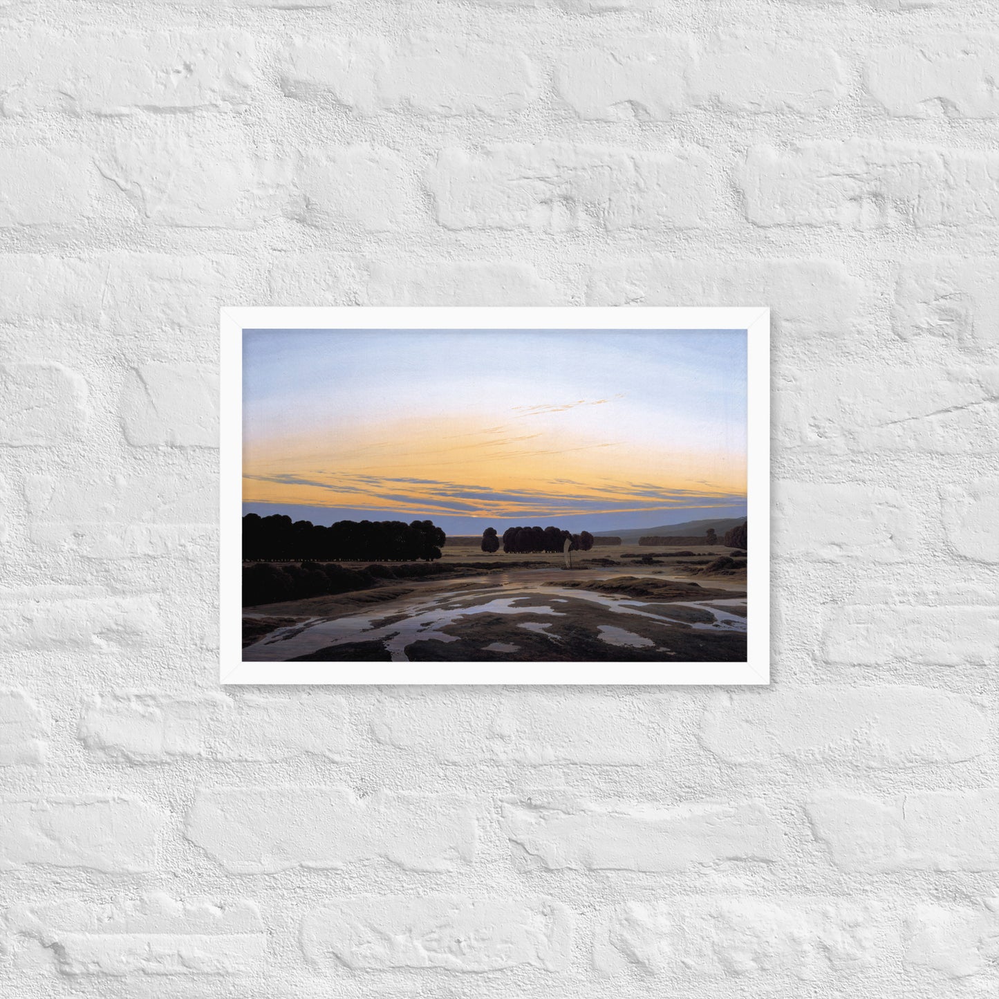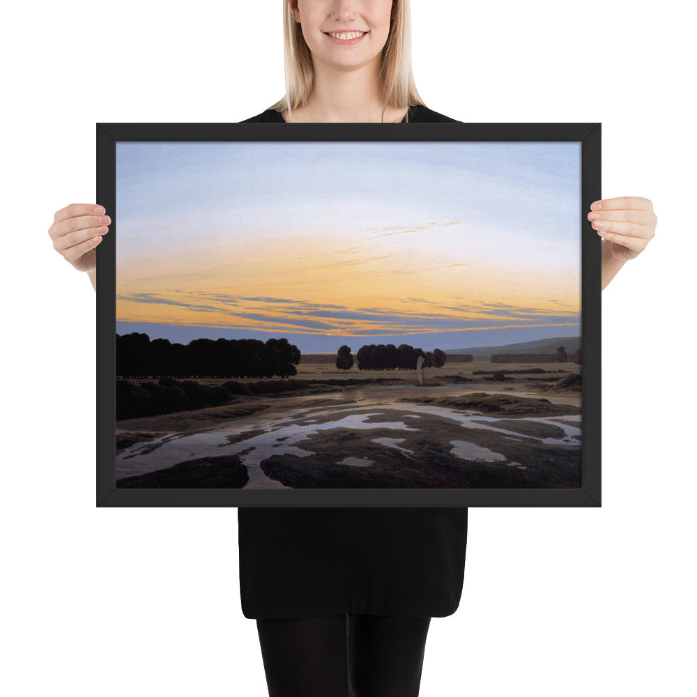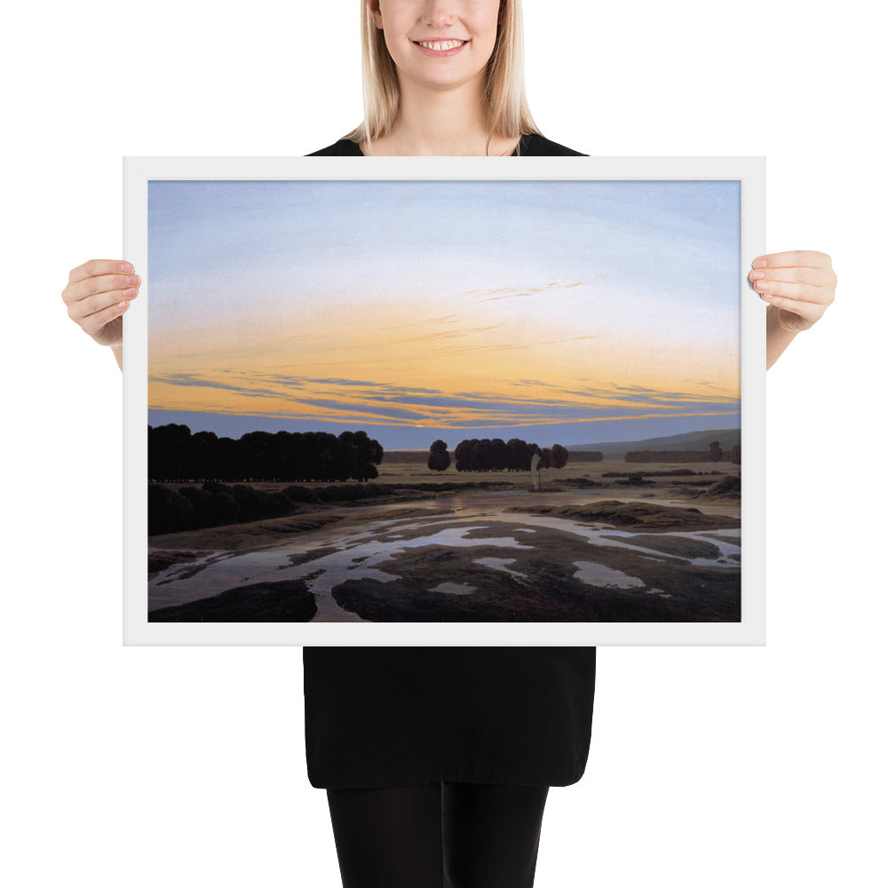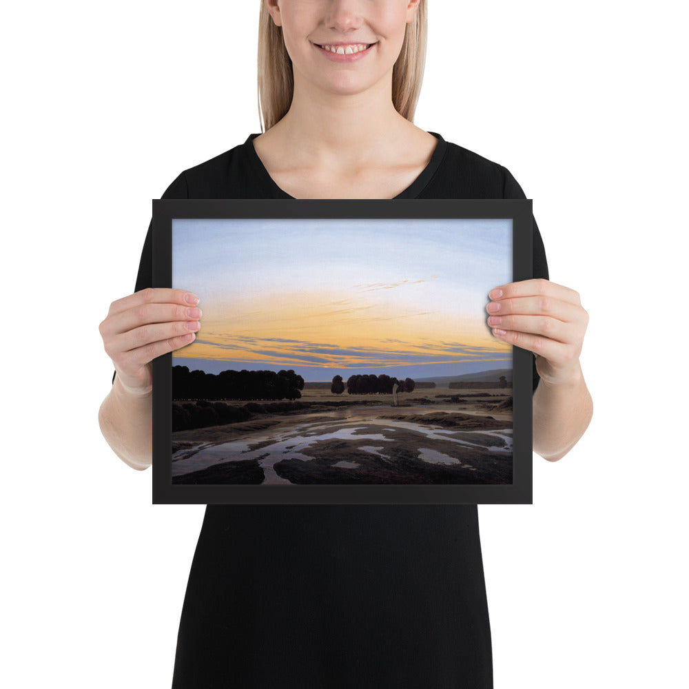 The Great Enclosure by Caspar David Friedrich is a serene meditation on light, solitude, and the passage of time. This Romanticism-era landscape captures the quiet drama of twilight—where silhouetted trees and reflective waters meet a vast, glowing sky. The composition invites viewers into a contemplative space, evoking themes of transience, nature’s grandeur, and emotional stillness.