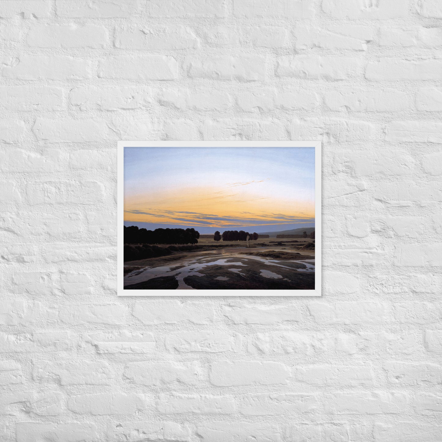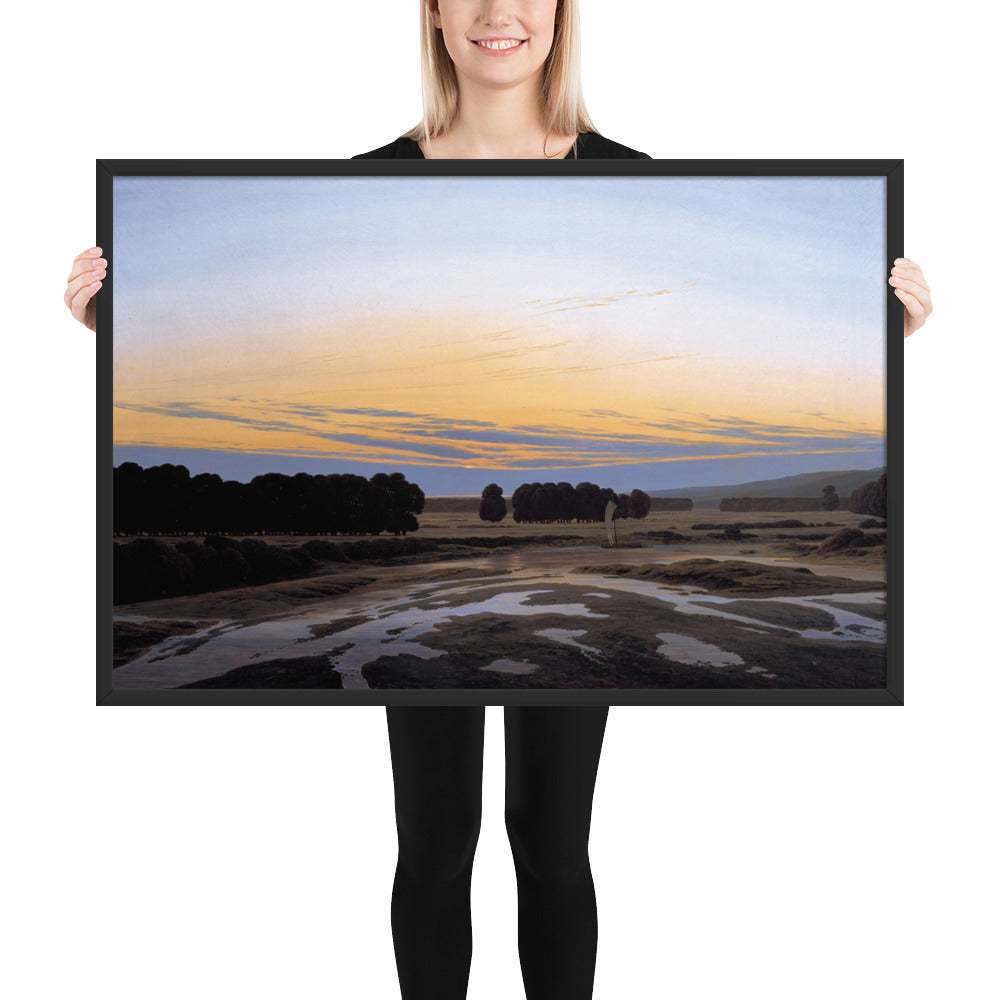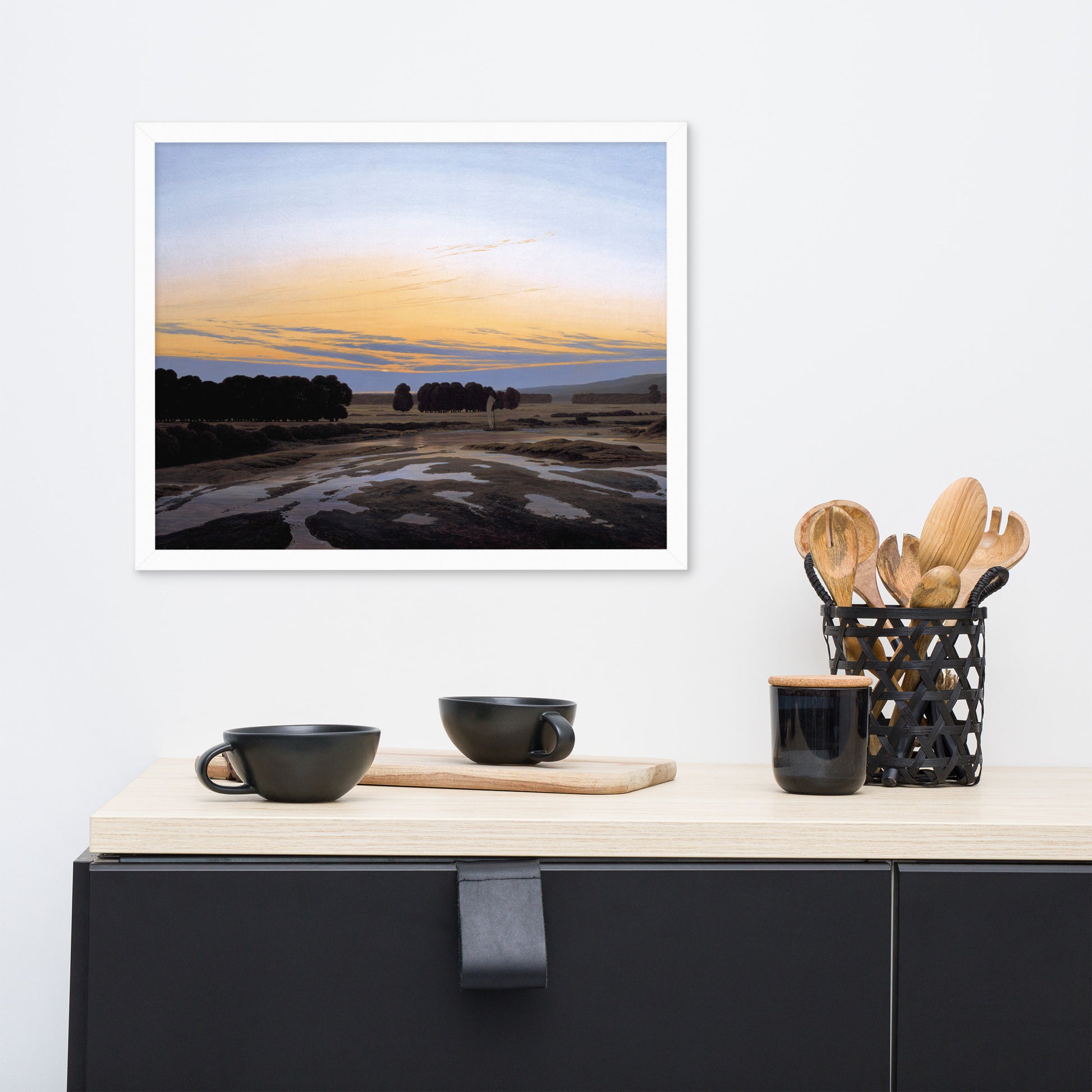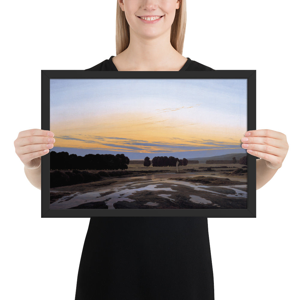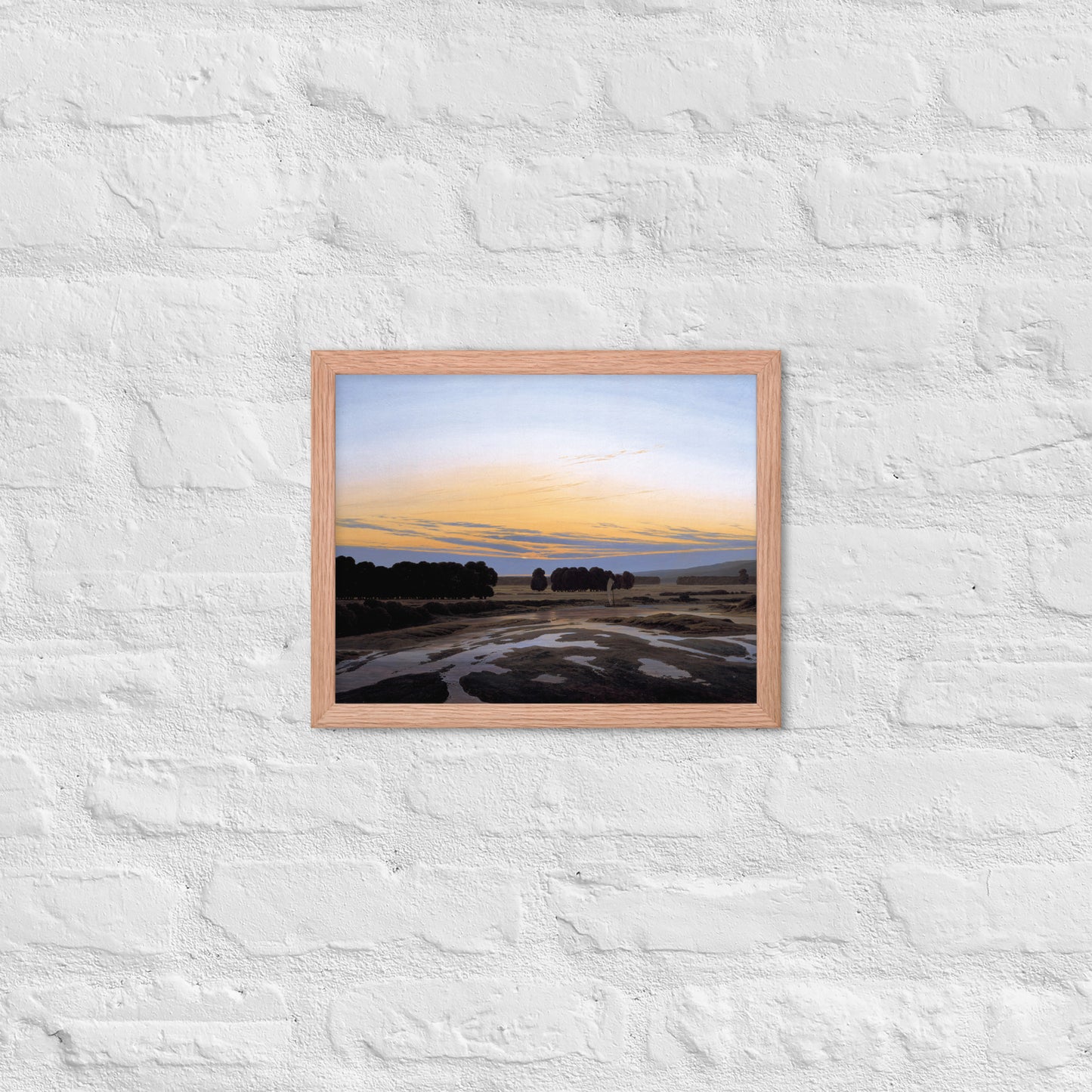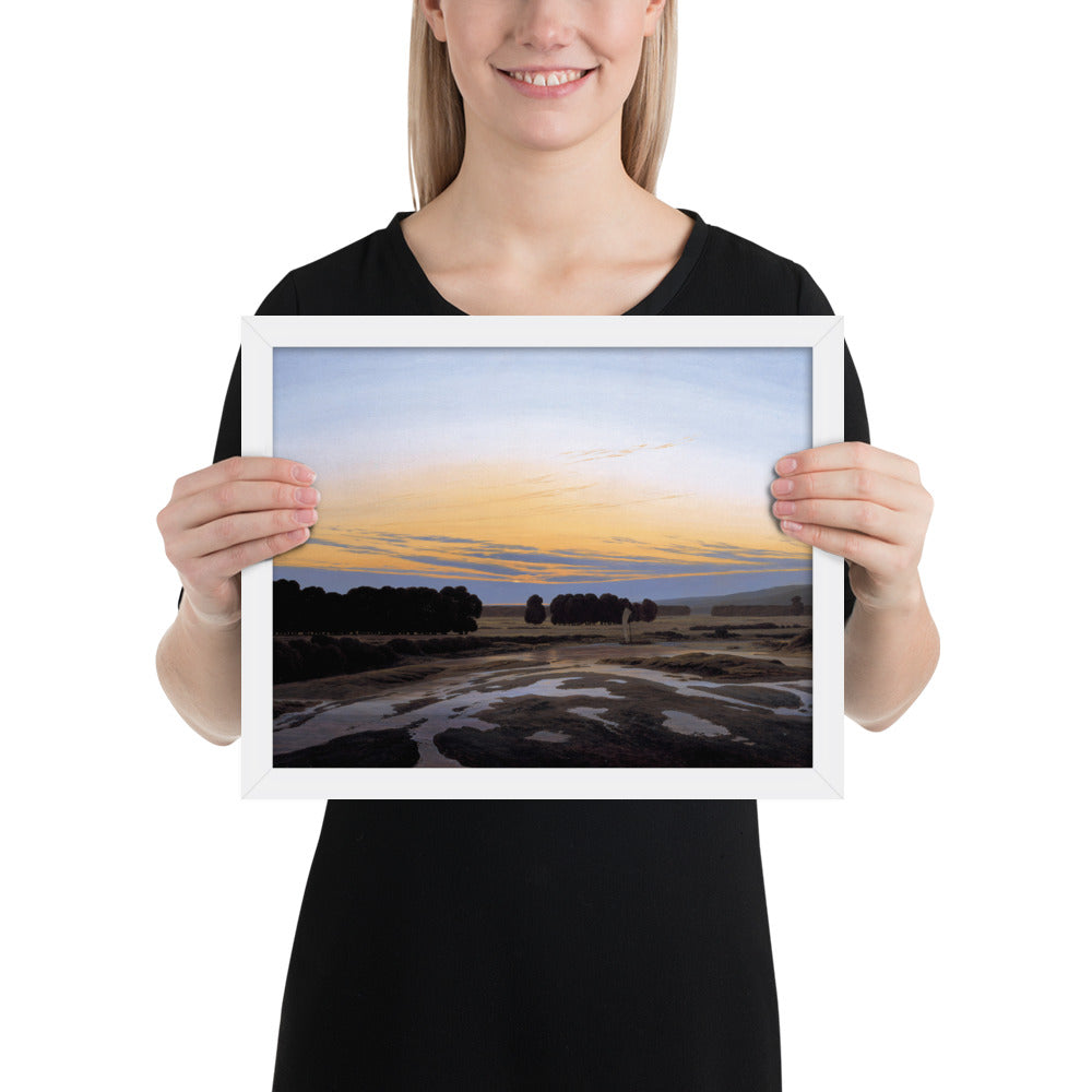 The Great Enclosure by Caspar David Friedrich is a serene meditation on light, solitude, and the passage of time. This Romanticism-era landscape captures the quiet drama of twilight—where silhouetted trees and reflective waters meet a vast, glowing sky. The composition invites viewers into a contemplative space, evoking themes of transience, nature’s grandeur, and emotional stillness.