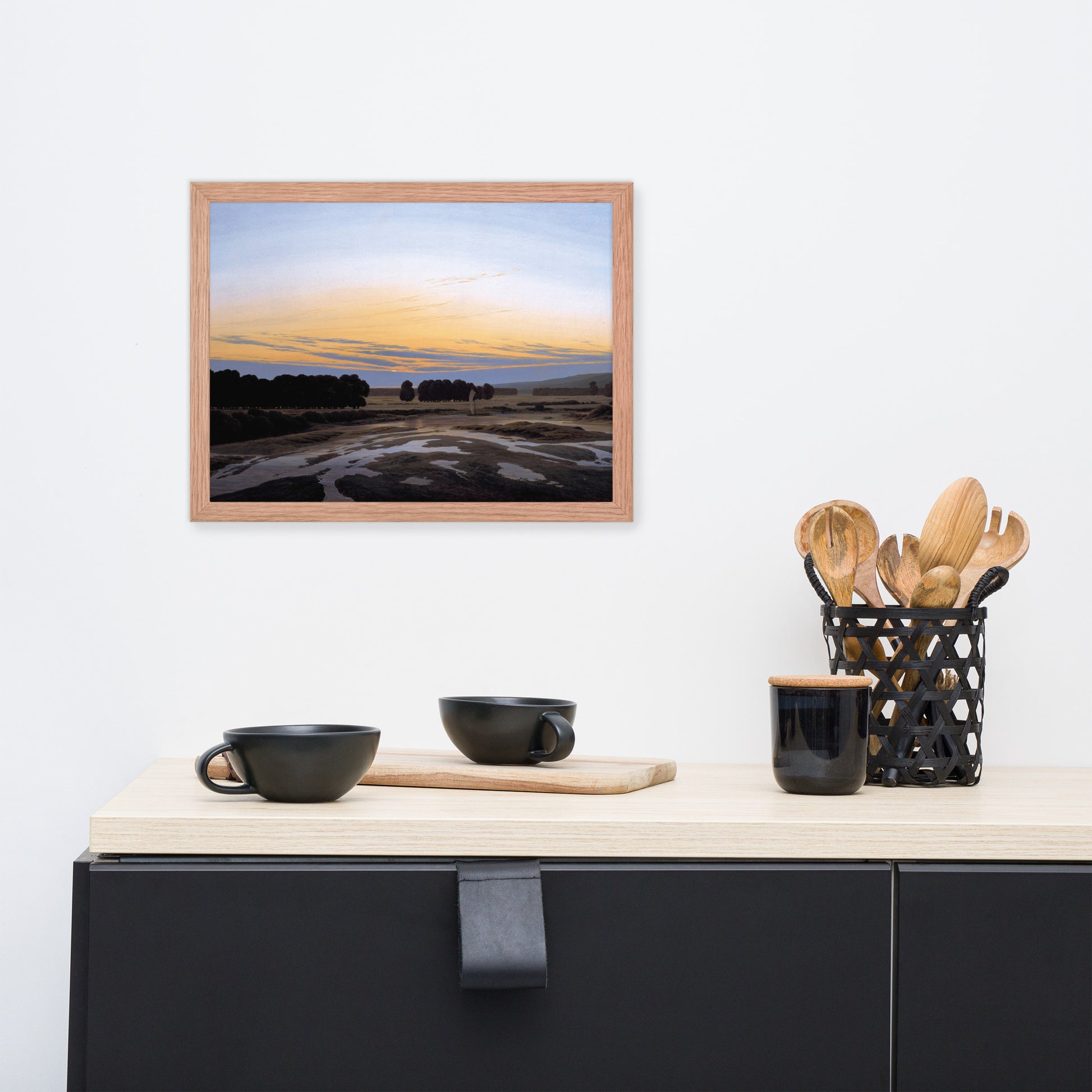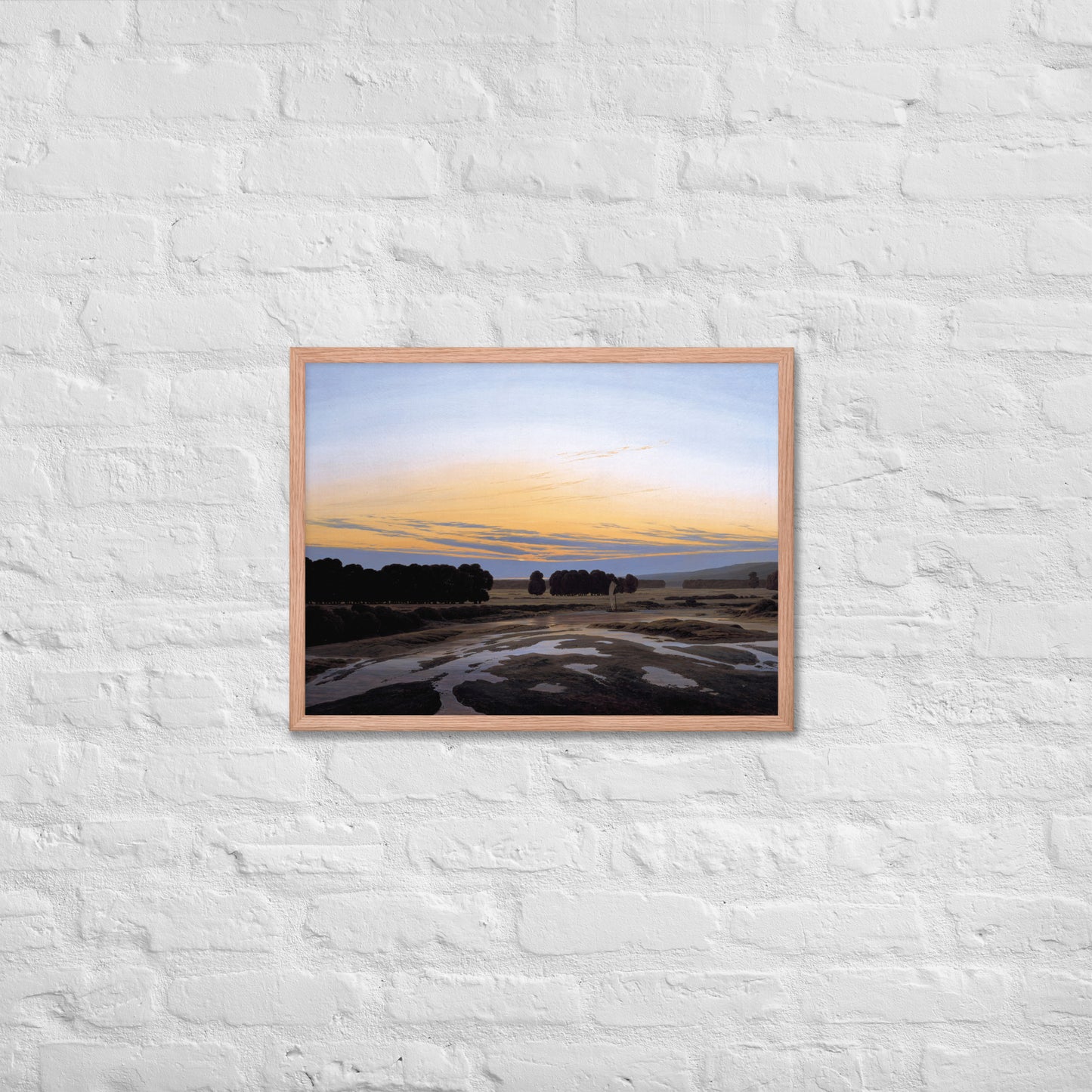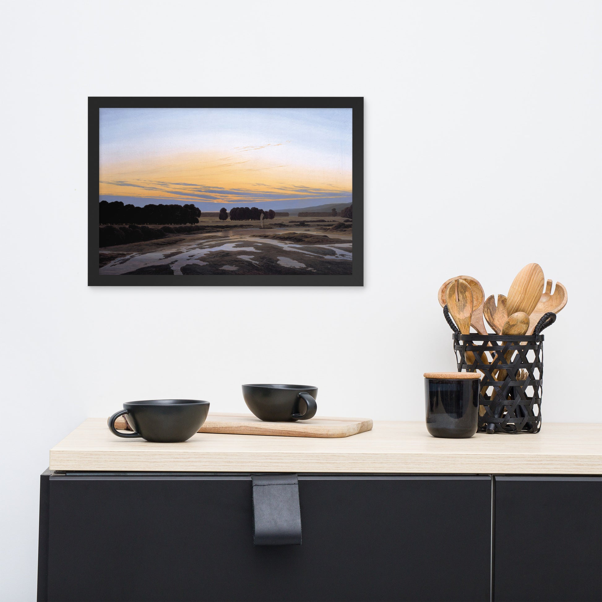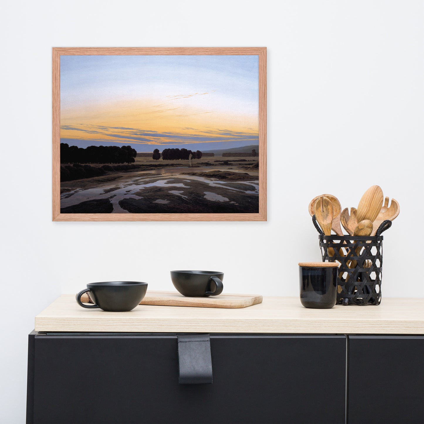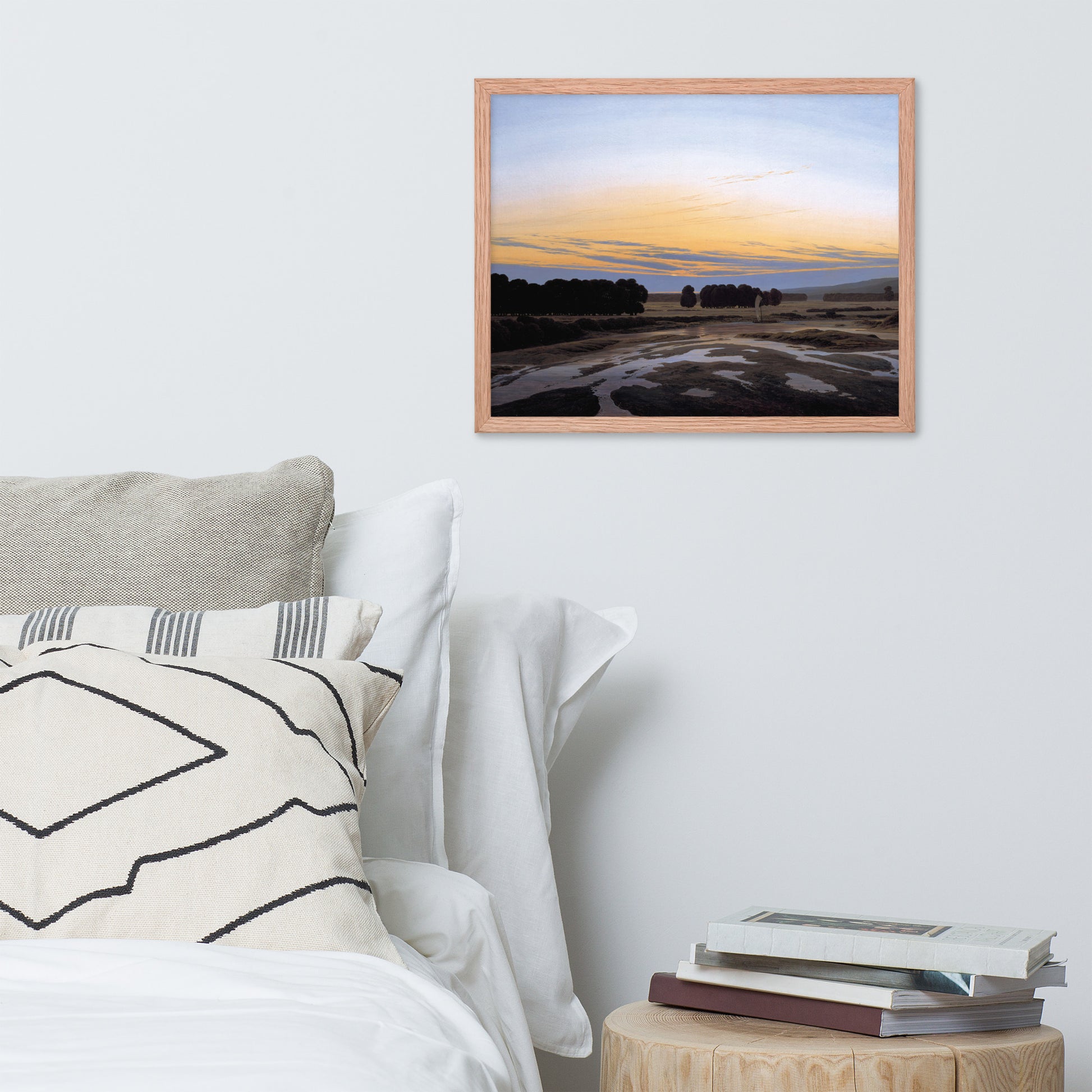 The Great Enclosure by Caspar David Friedrich is a serene meditation on light, solitude, and the passage of time. This Romanticism-era landscape captures the quiet drama of twilight—where silhouetted trees and reflective waters meet a vast, glowing sky. The composition invites viewers into a contemplative space, evoking themes of transience, nature’s grandeur, and emotional stillness.
