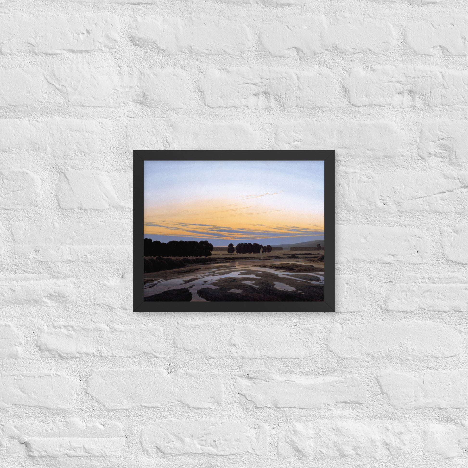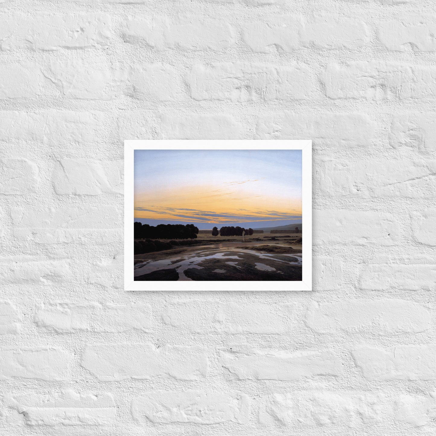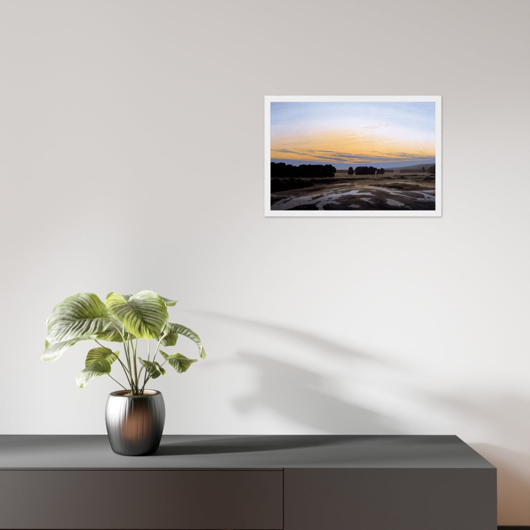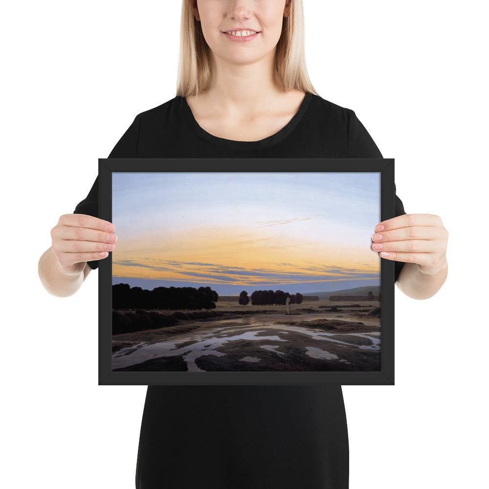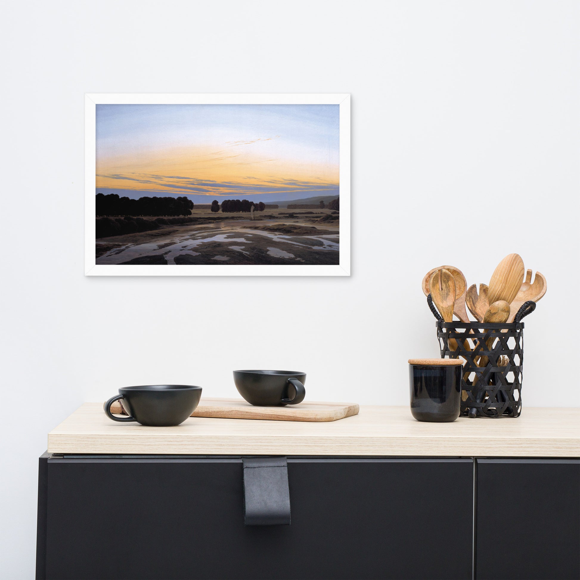 The Great Enclosure by Caspar David Friedrich is a serene meditation on light, solitude, and the passage of time. This Romanticism-era landscape captures the quiet drama of twilight—where silhouetted trees and reflective waters meet a vast, glowing sky. The composition invites viewers into a contemplative space, evoking themes of transience, nature’s grandeur, and emotional stillness.
