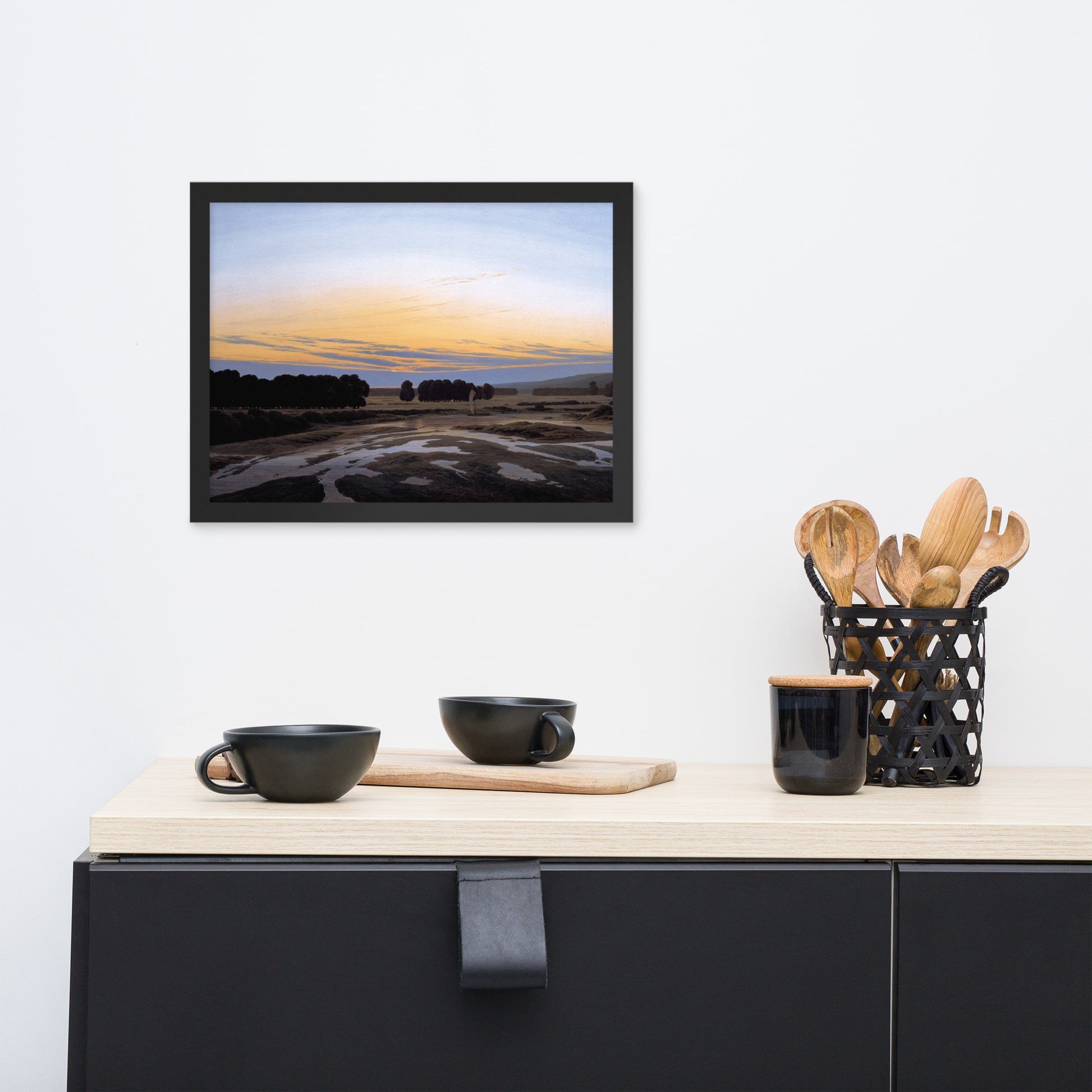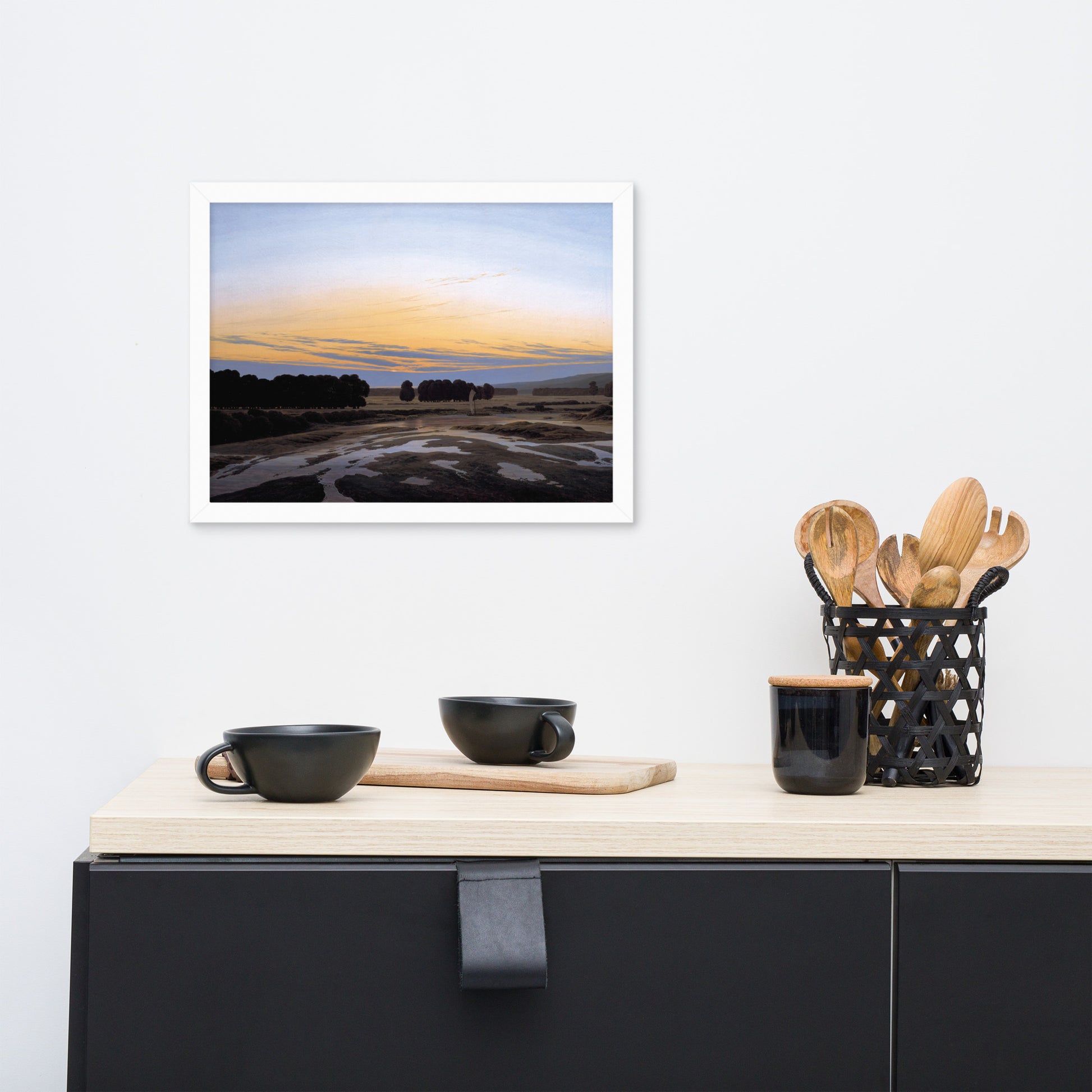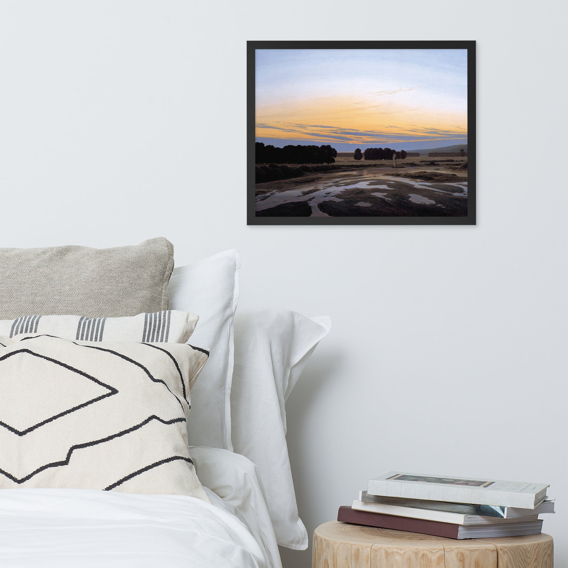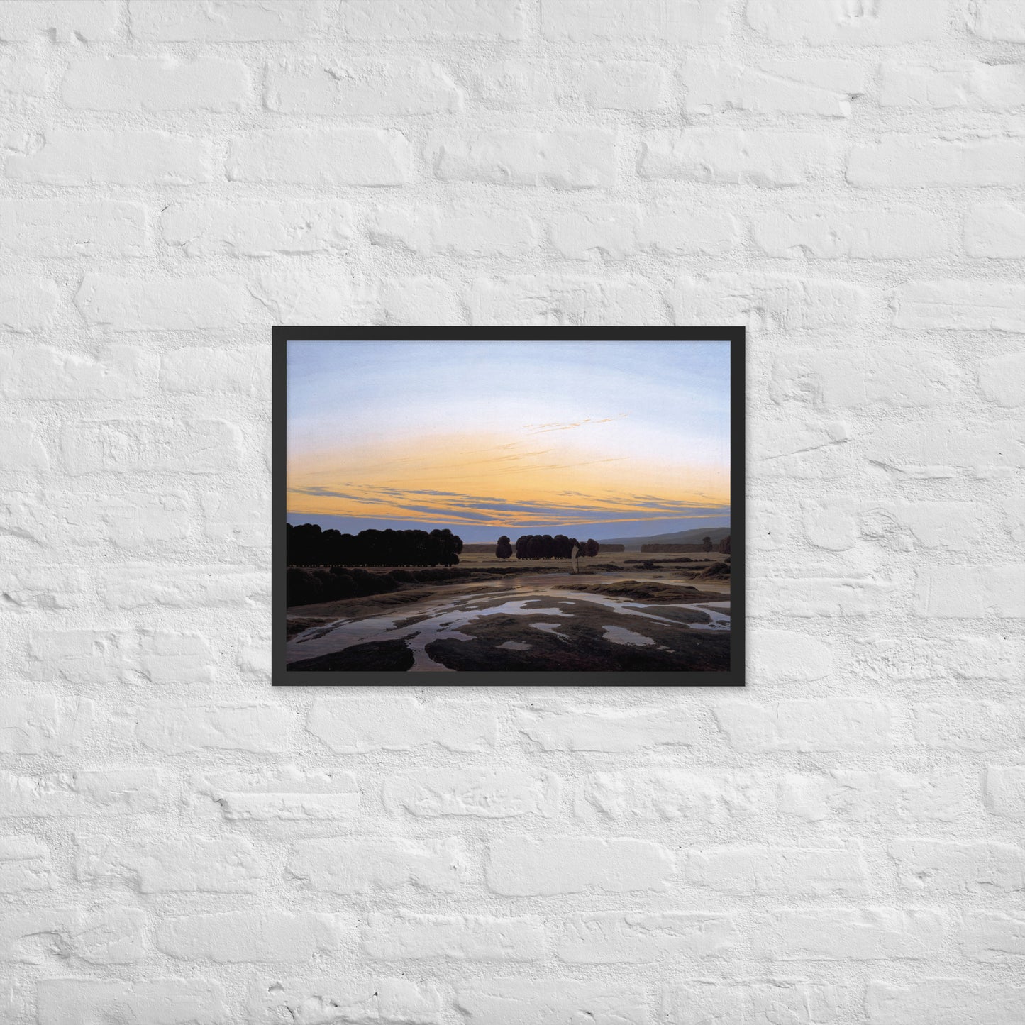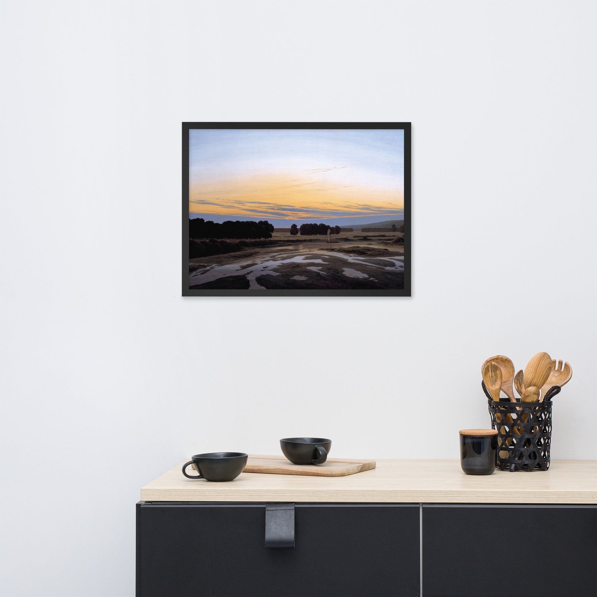 The Great Enclosure by Caspar David Friedrich is a serene meditation on light, solitude, and the passage of time. This Romanticism-era landscape captures the quiet drama of twilight—where silhouetted trees and reflective waters meet a vast, glowing sky. The composition invites viewers into a contemplative space, evoking themes of transience, nature’s grandeur, and emotional stillness.