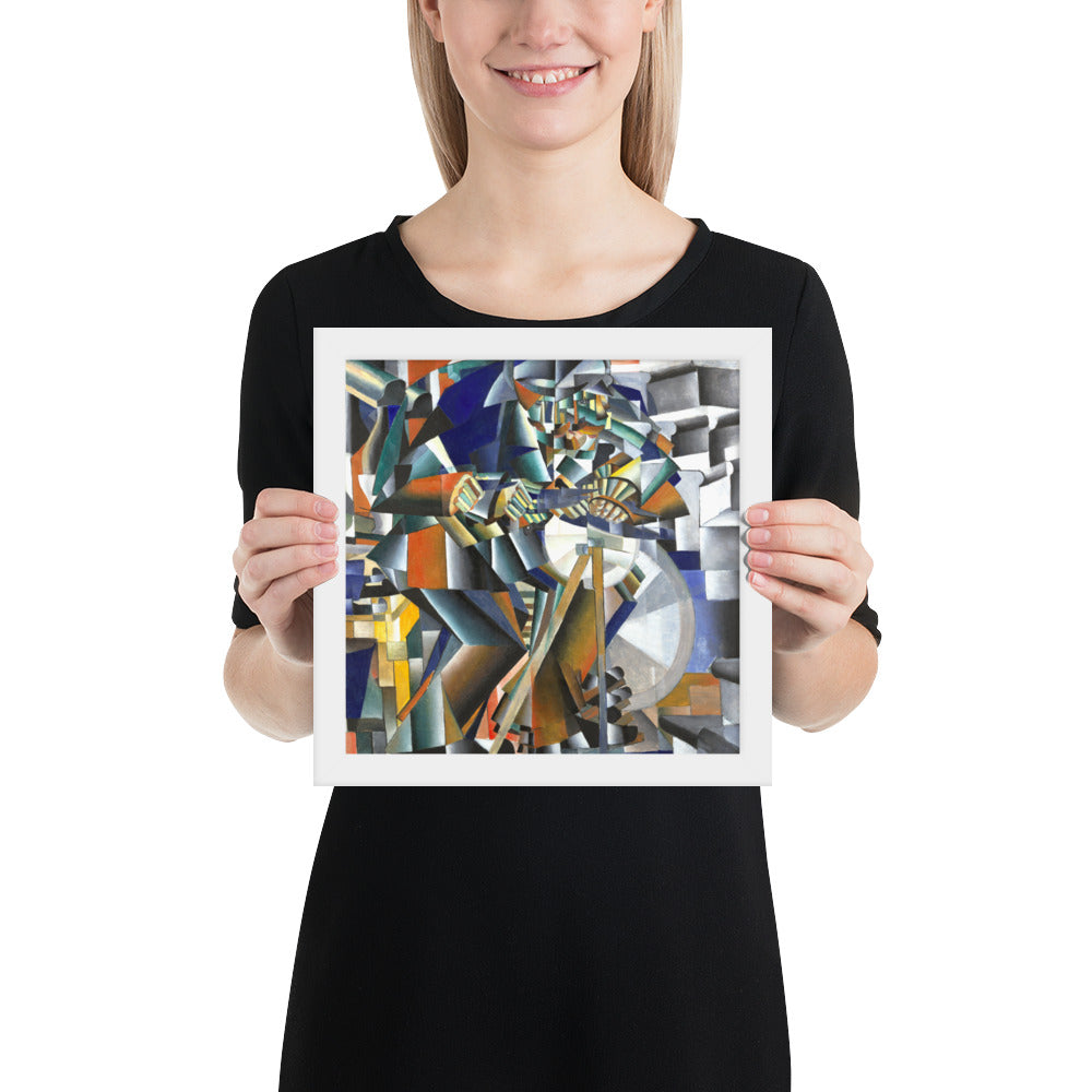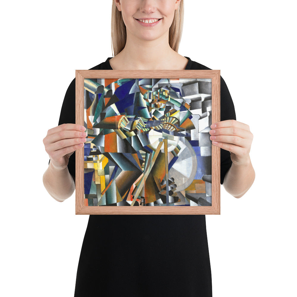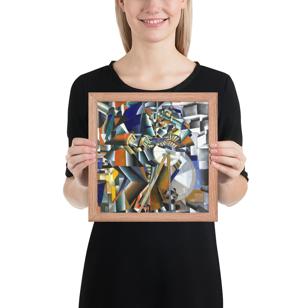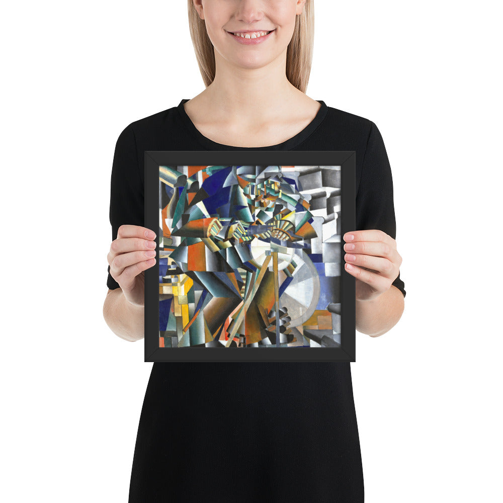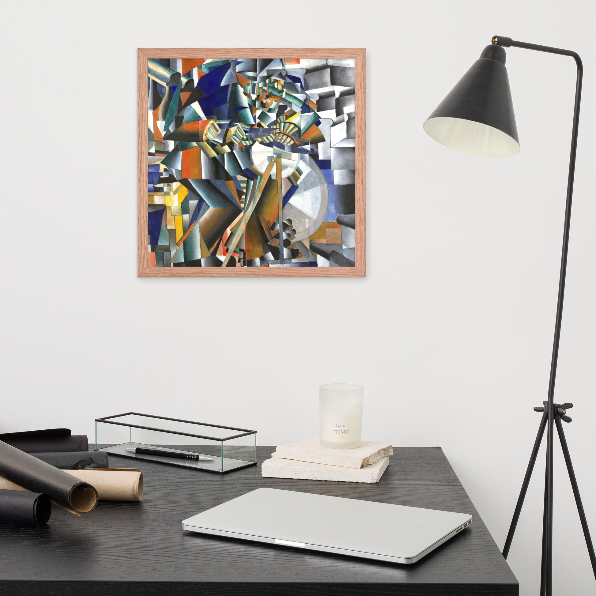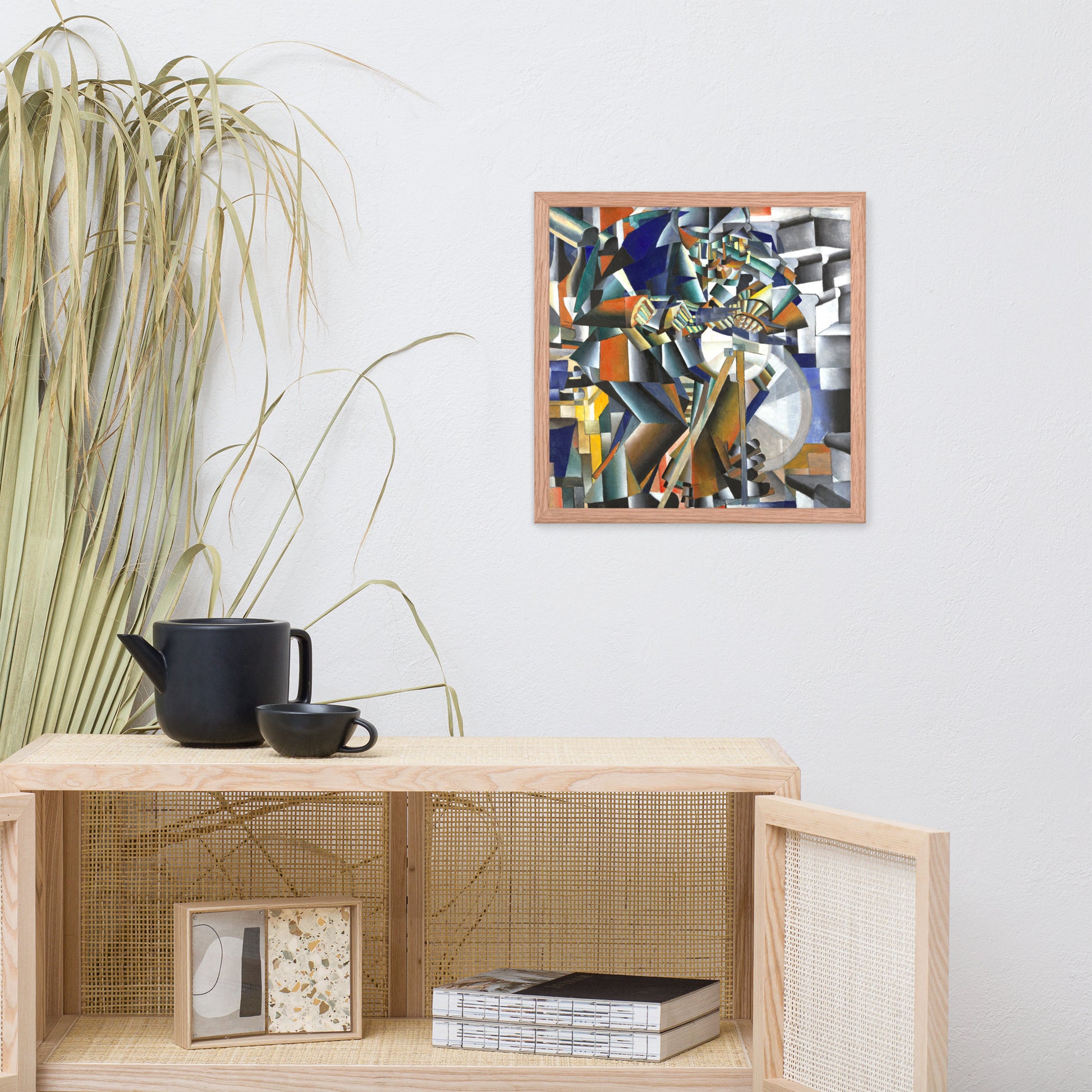 The Knife Grinder by Kazimir Malevich is a bold celebration of motion, form, and modernist abstraction. This framed wall print captures the rhythmic energy of a solitary figure at work—fragmented into angular planes and geometric layers that pulse with Cubist intensity. Malevich’s composition breaks traditional perspective, offering a kaleidoscopic view of labor, sound, and structure through a palette of blues, greens, oranges, and grays.