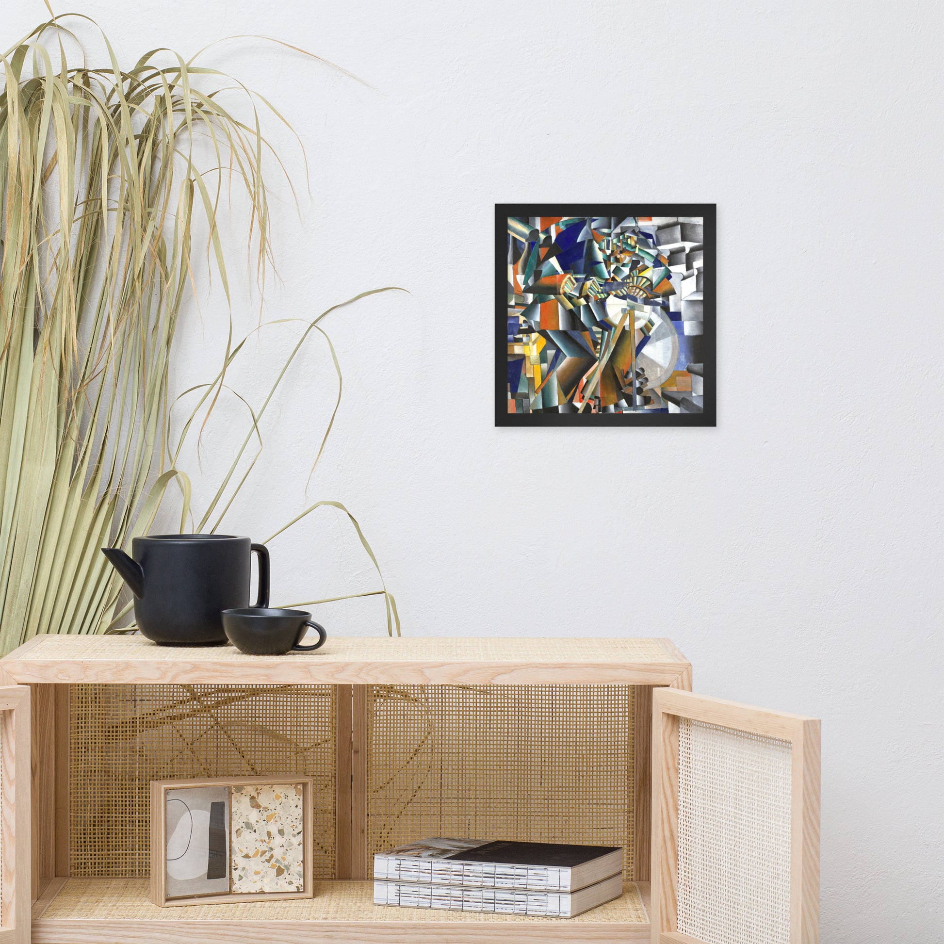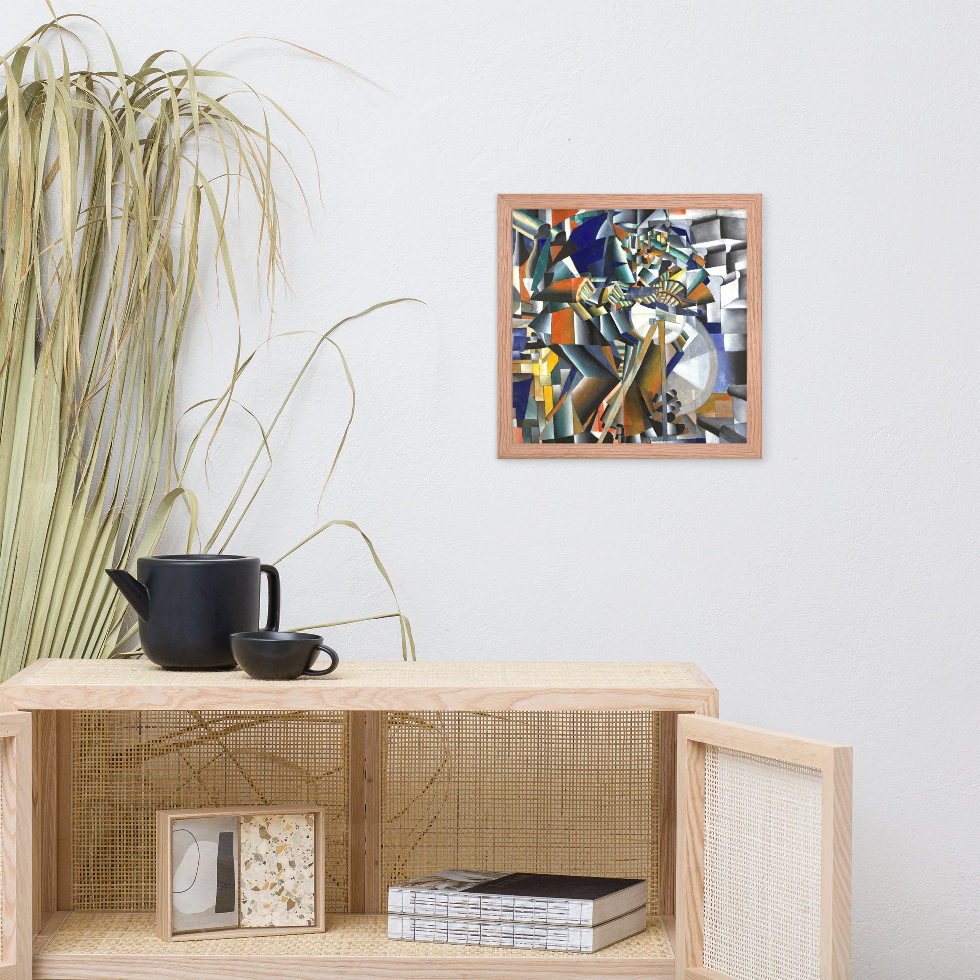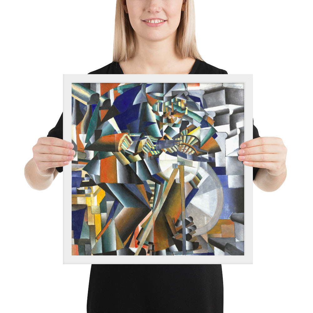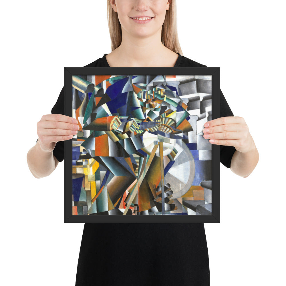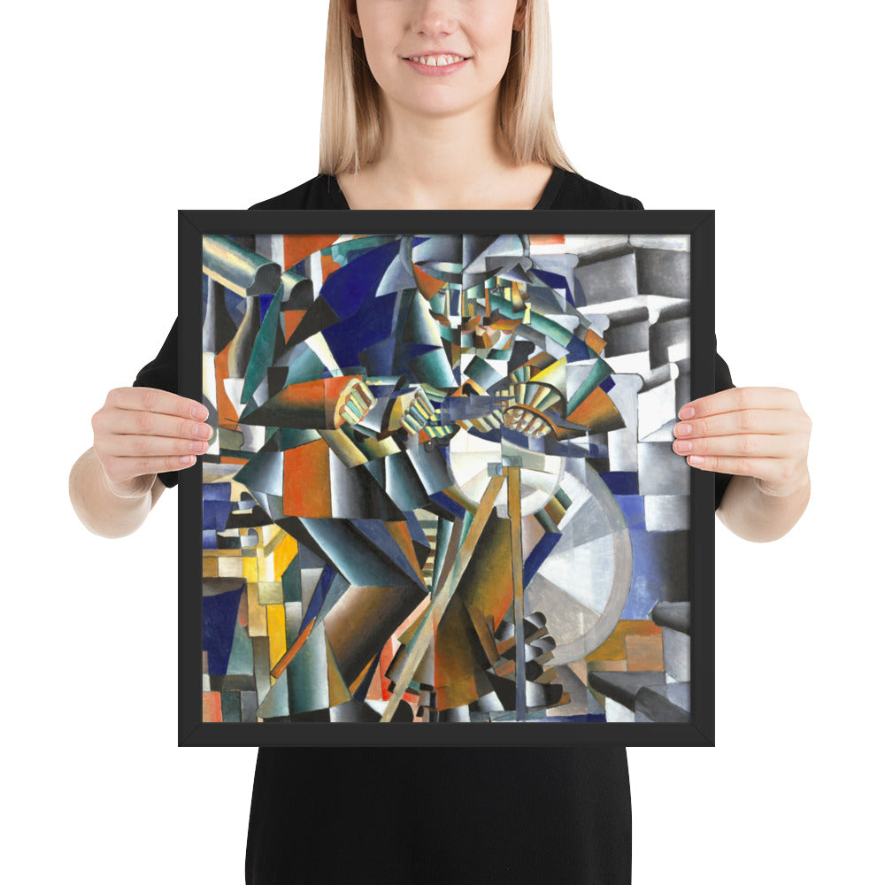 The Knife Grinder by Kazimir Malevich is a bold celebration of motion, form, and modernist abstraction. This framed wall print captures the rhythmic energy of a solitary figure at work—fragmented into angular planes and geometric layers that pulse with Cubist intensity. Malevich’s composition breaks traditional perspective, offering a kaleidoscopic view of labor, sound, and structure through a palette of blues, greens, oranges, and grays.