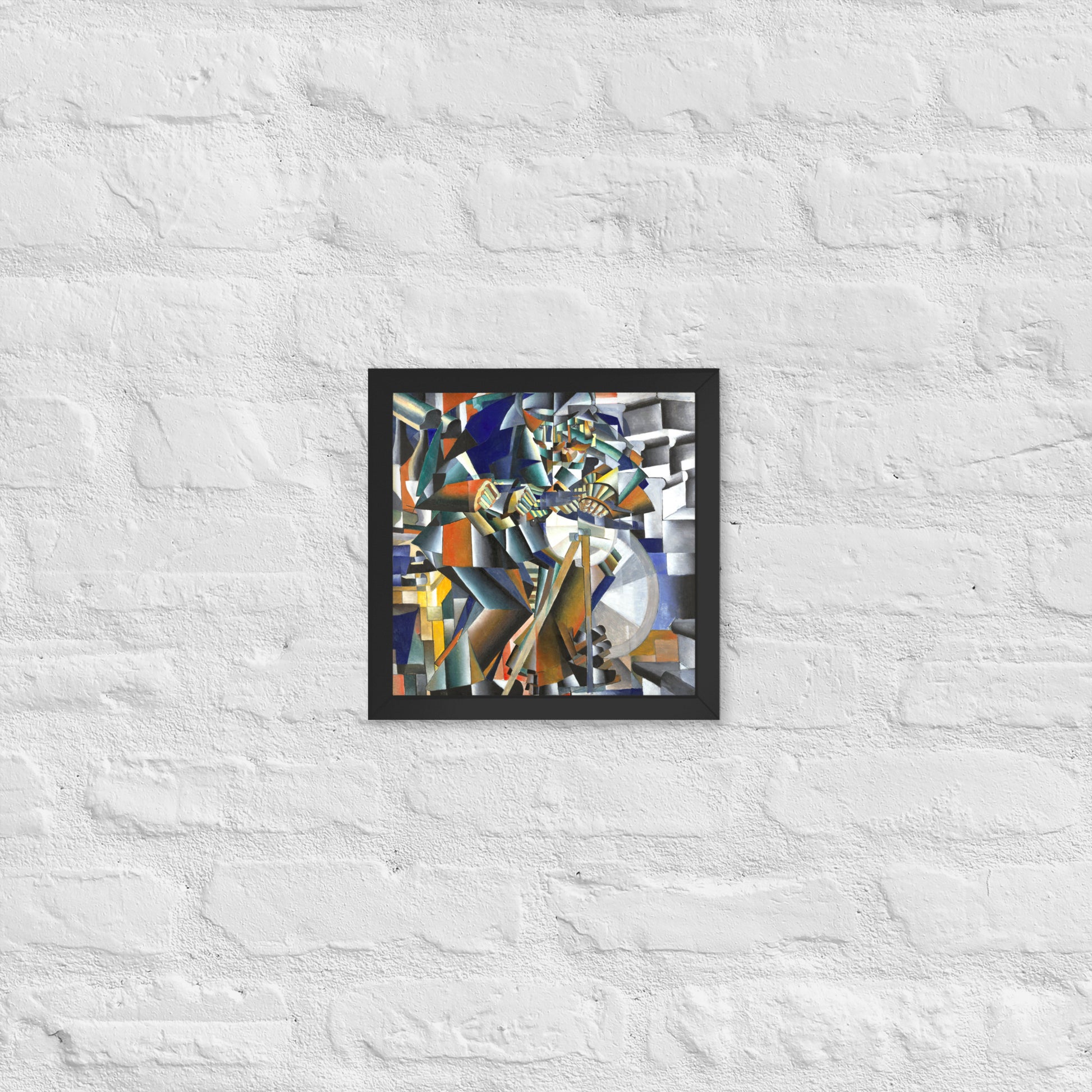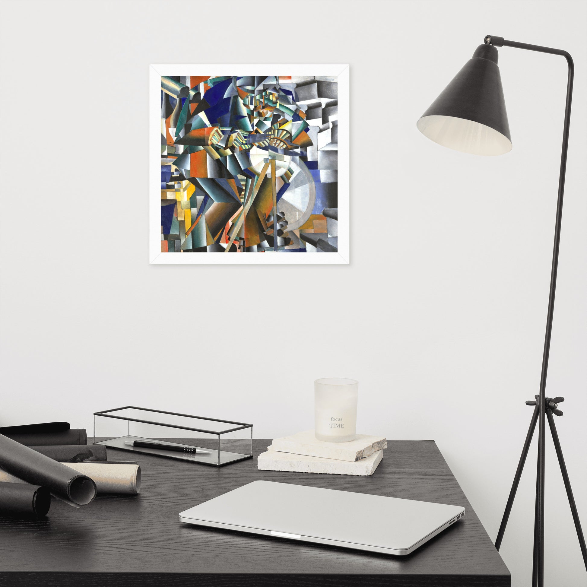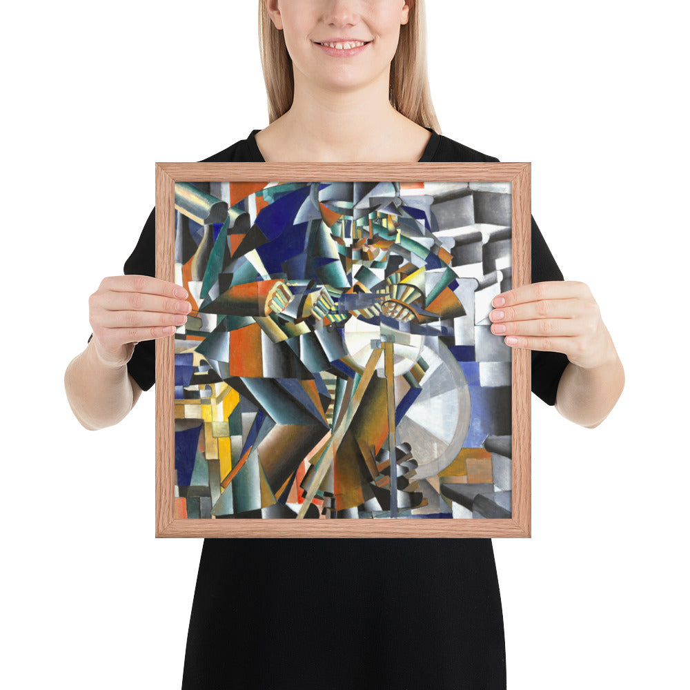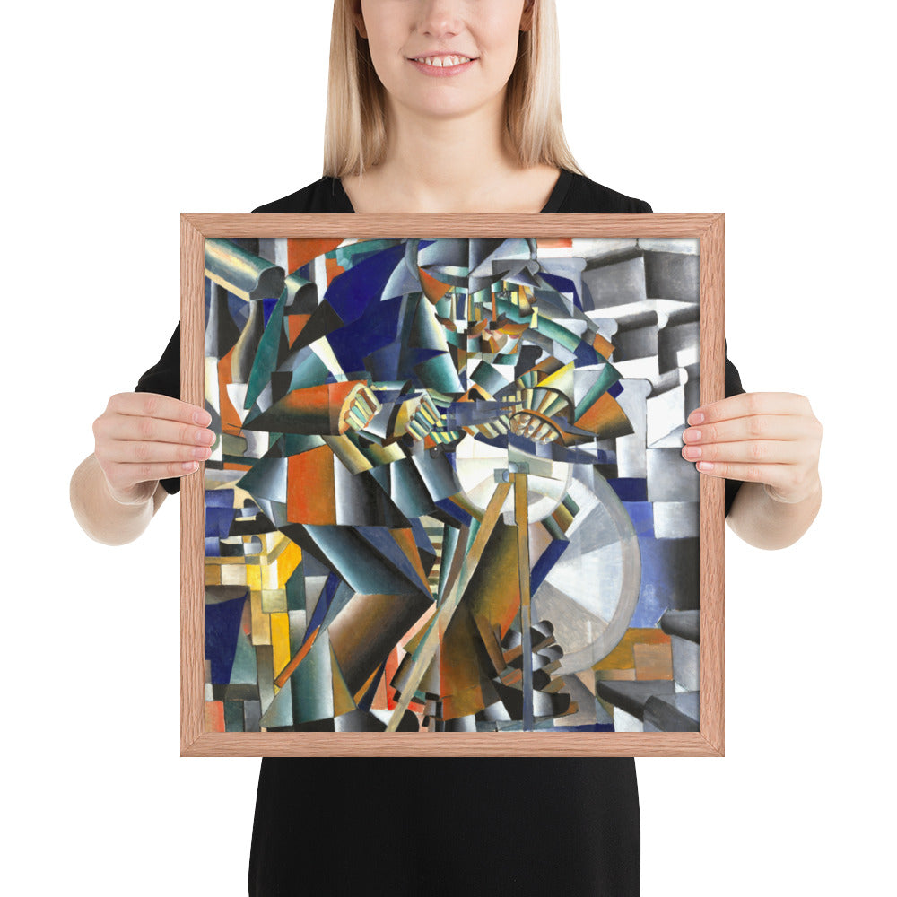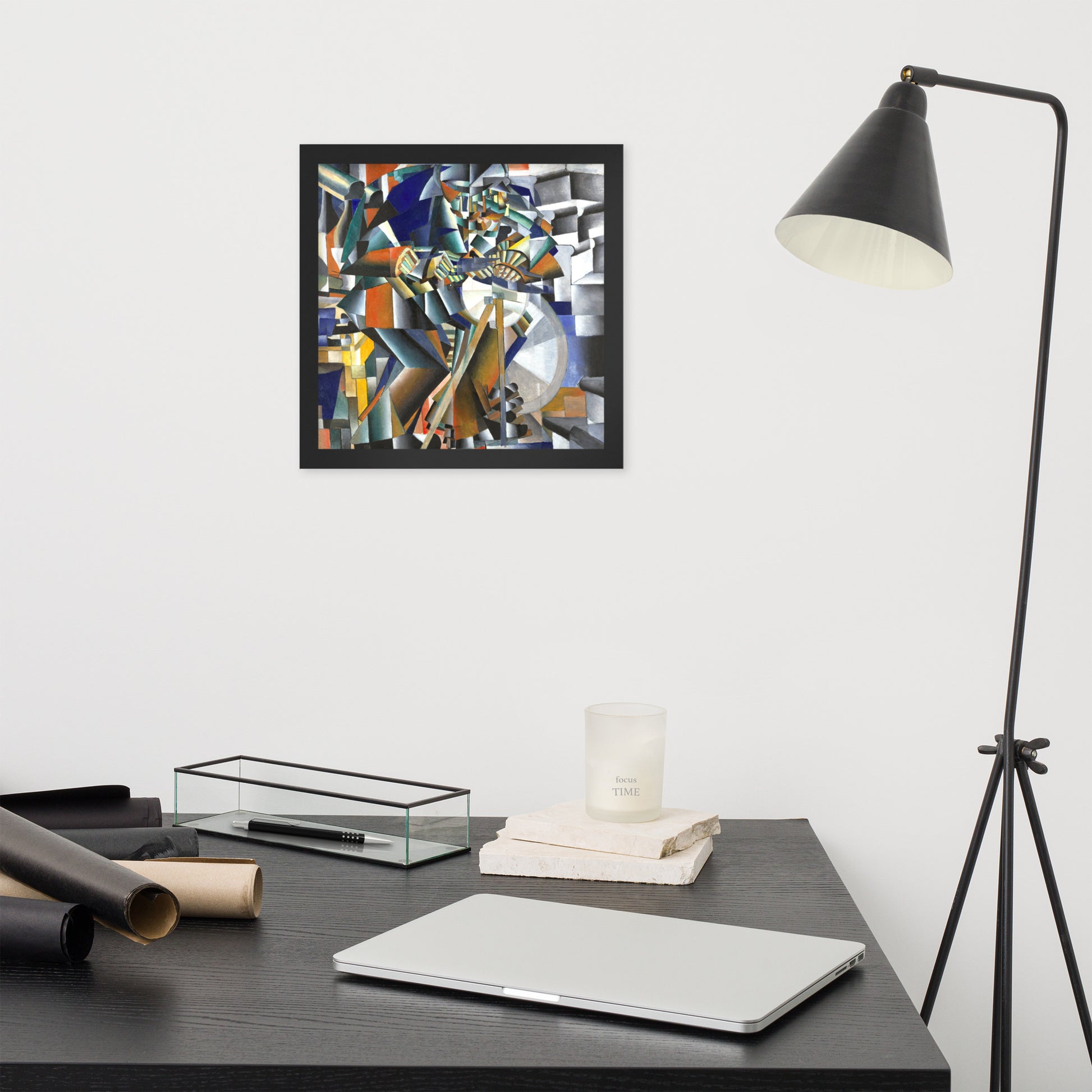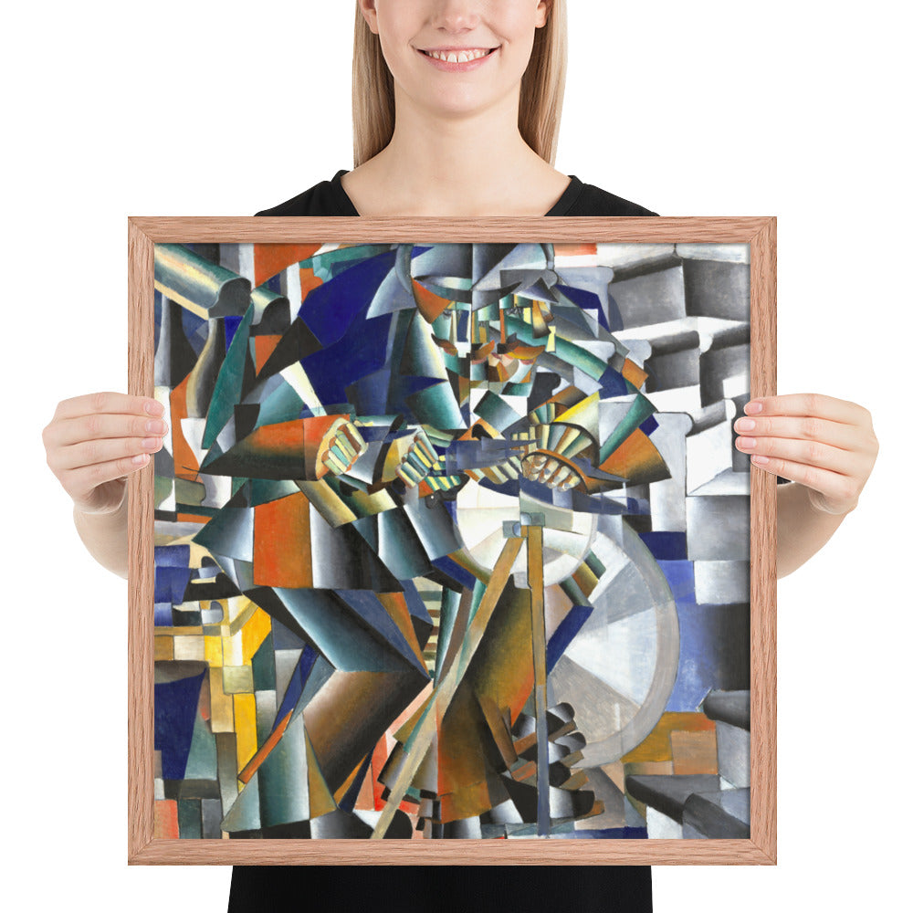 The Knife Grinder by Kazimir Malevich is a bold celebration of motion, form, and modernist abstraction. This framed wall print captures the rhythmic energy of a solitary figure at work—fragmented into angular planes and geometric layers that pulse with Cubist intensity. Malevich’s composition breaks traditional perspective, offering a kaleidoscopic view of labor, sound, and structure through a palette of blues, greens, oranges, and grays.