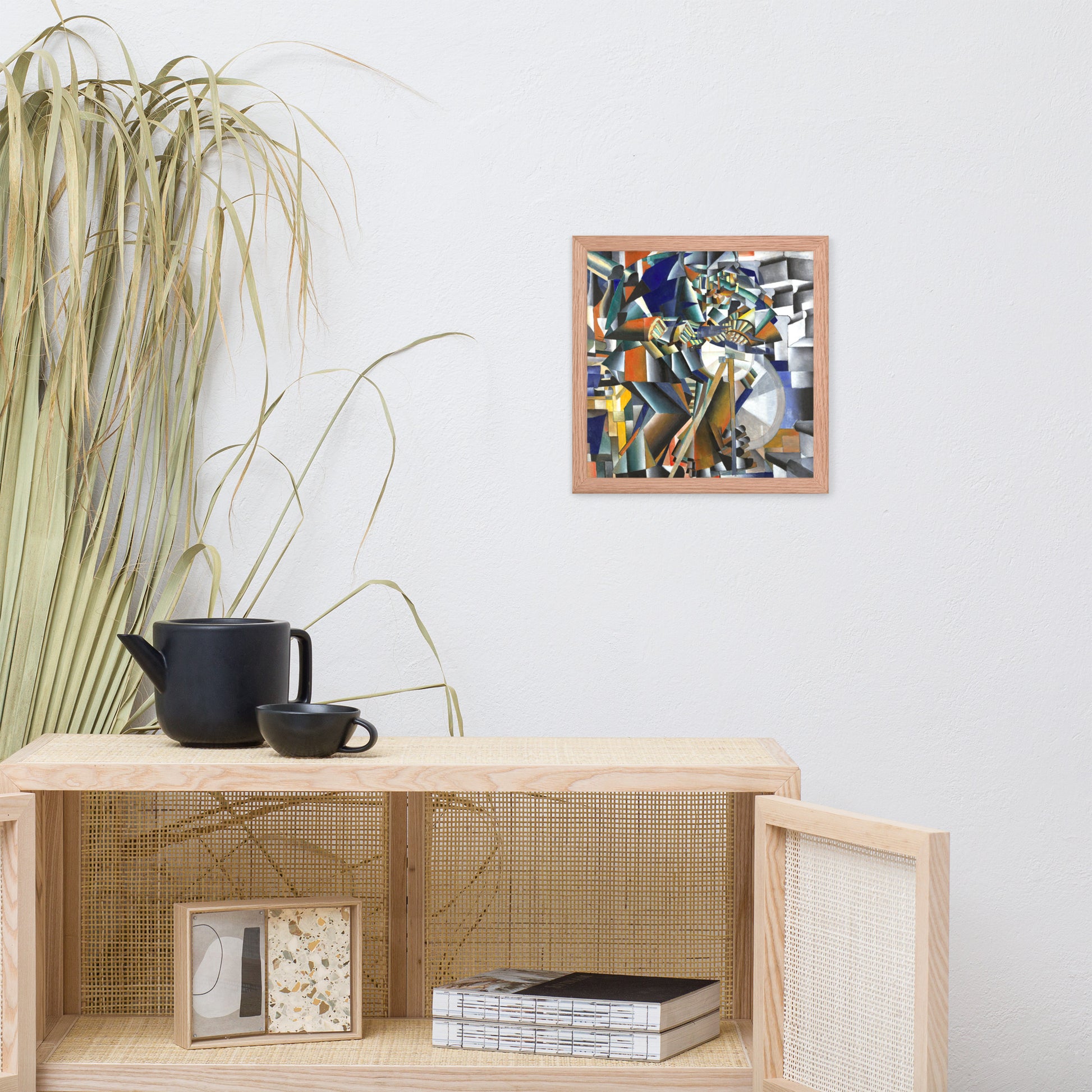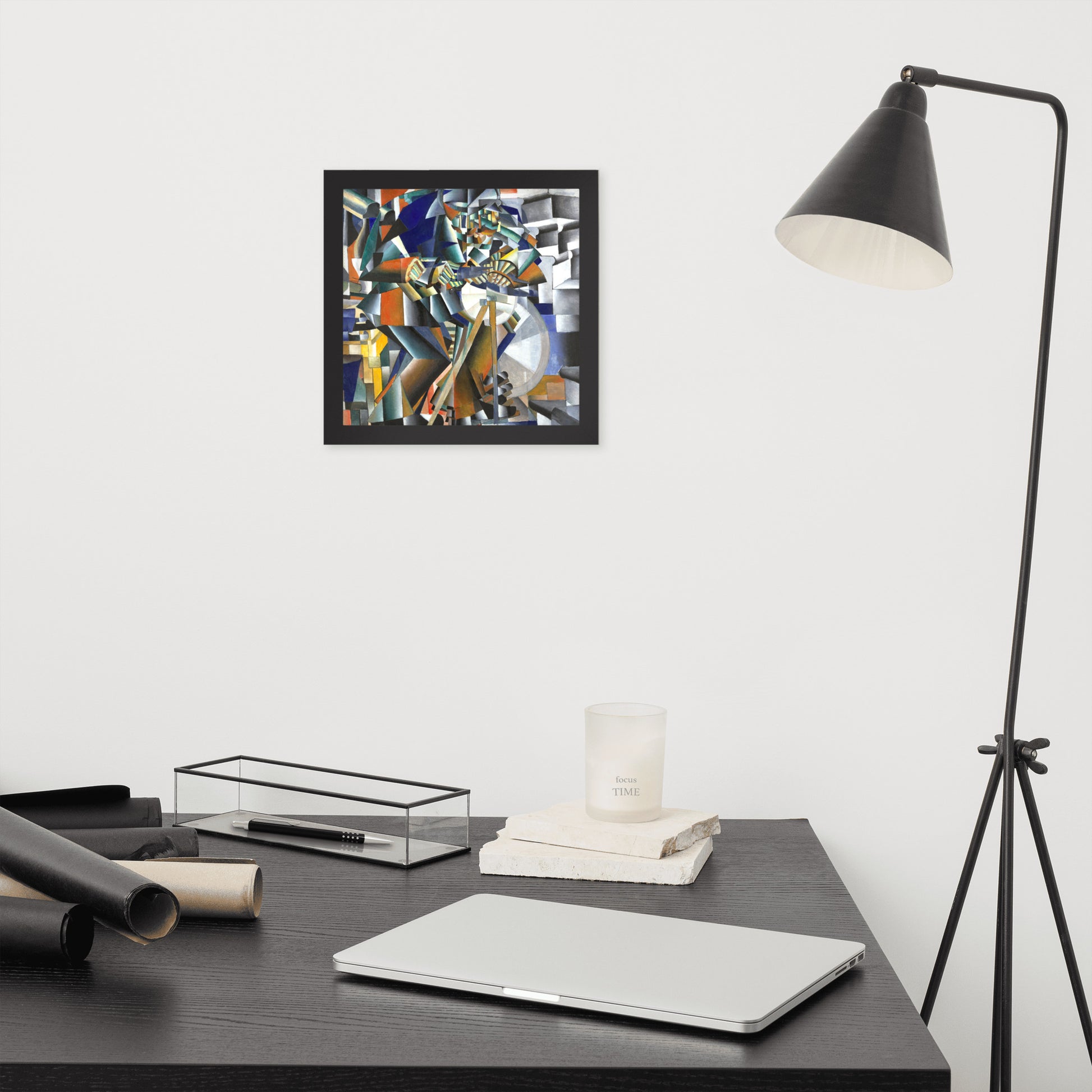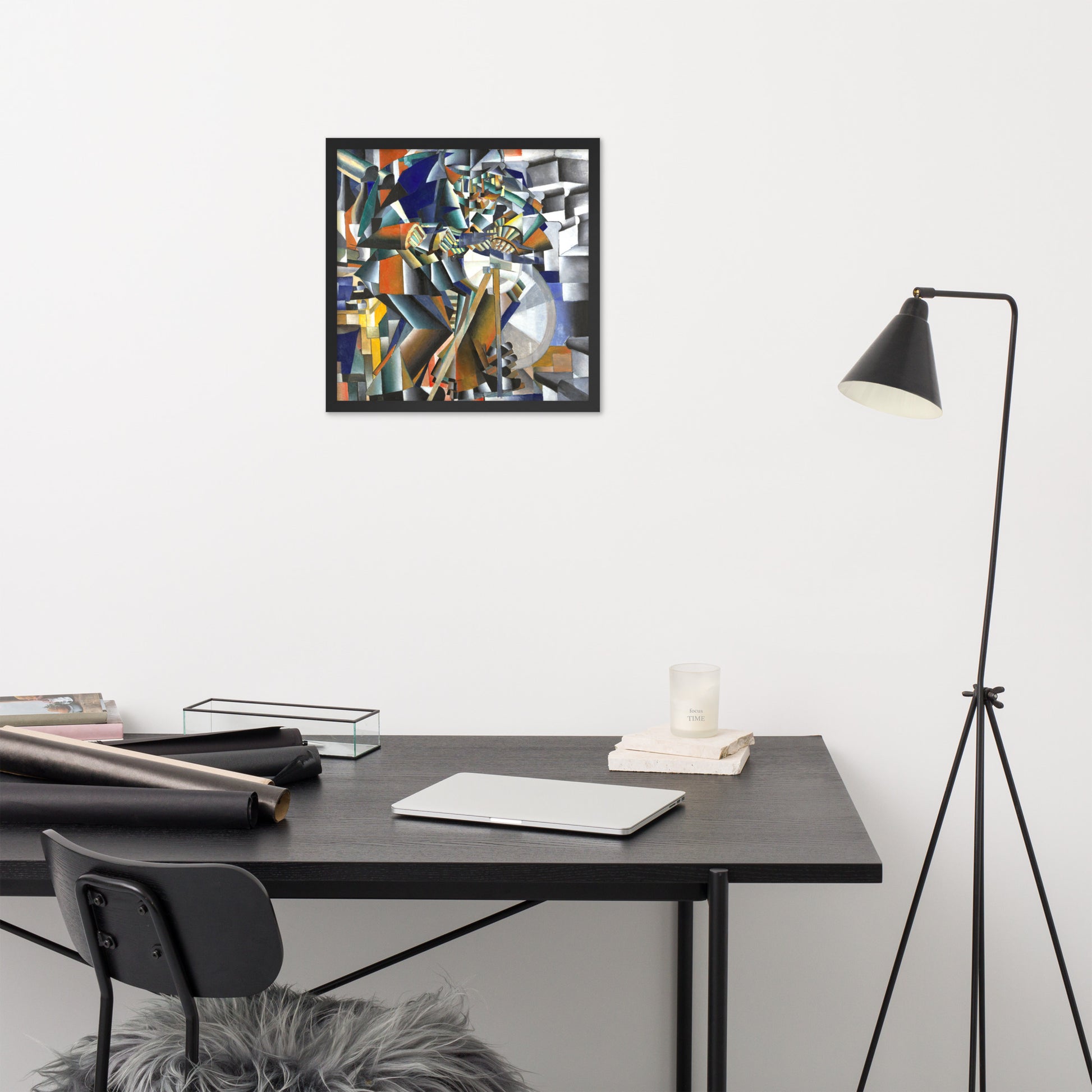 Perfect for interiors that embrace expressive minimalism or avant-garde flair, this abstract artwork adds depth and movement to any space. The stylized musician-like figure and architectural backdrop evoke both industrial grit and artistic sophistication. Professionally framed and printed for everyday display, this piece invites viewers to engage with the visual rhythm and layered storytelling of early 20th-century abstraction.