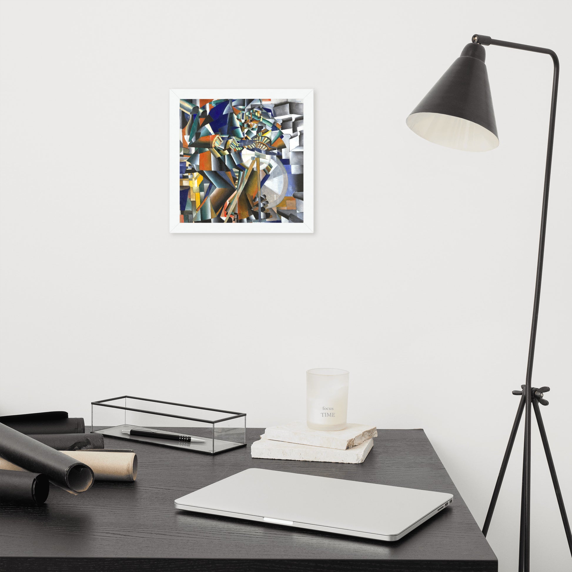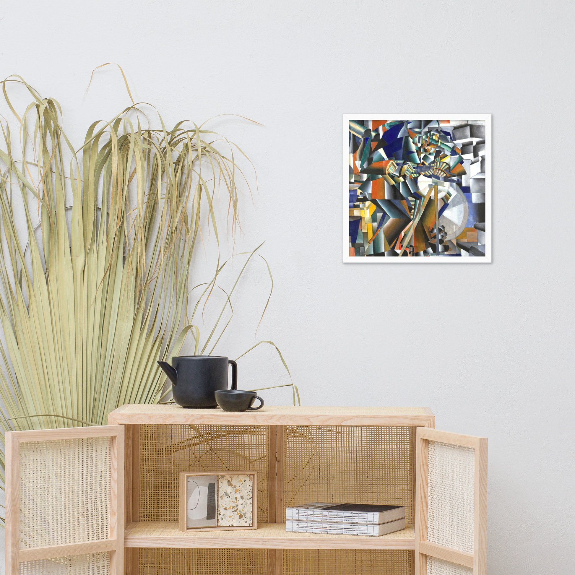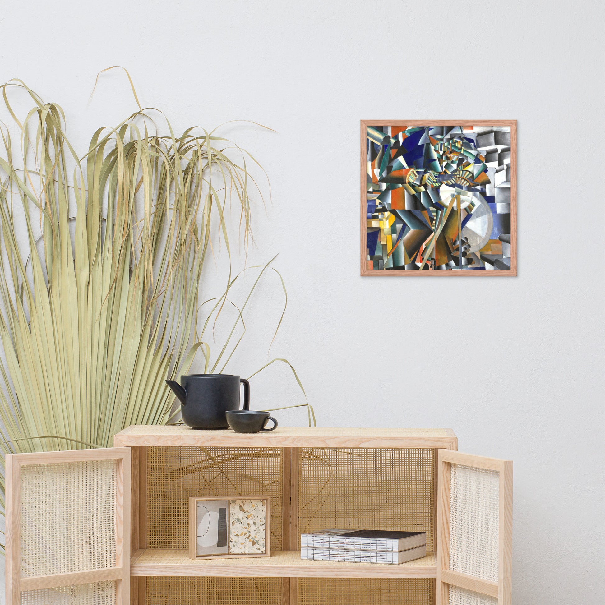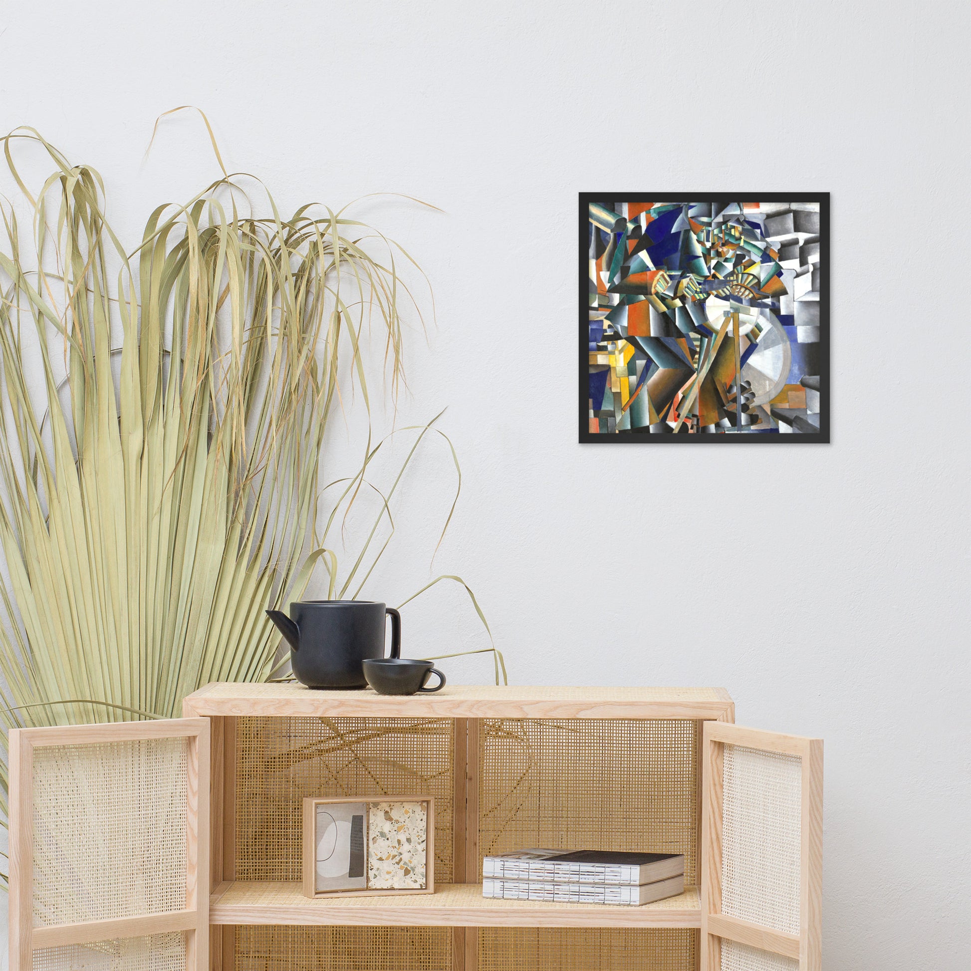 Perfect for interiors that embrace expressive minimalism or avant-garde flair, this abstract artwork adds depth and movement to any space. The stylized musician-like figure and architectural backdrop evoke both industrial grit and artistic sophistication. Professionally framed and printed for everyday display, this piece invites viewers to engage with the visual rhythm and layered storytelling of early 20th-century abstraction.