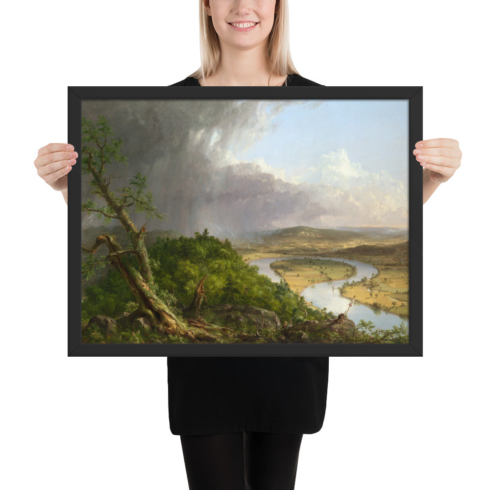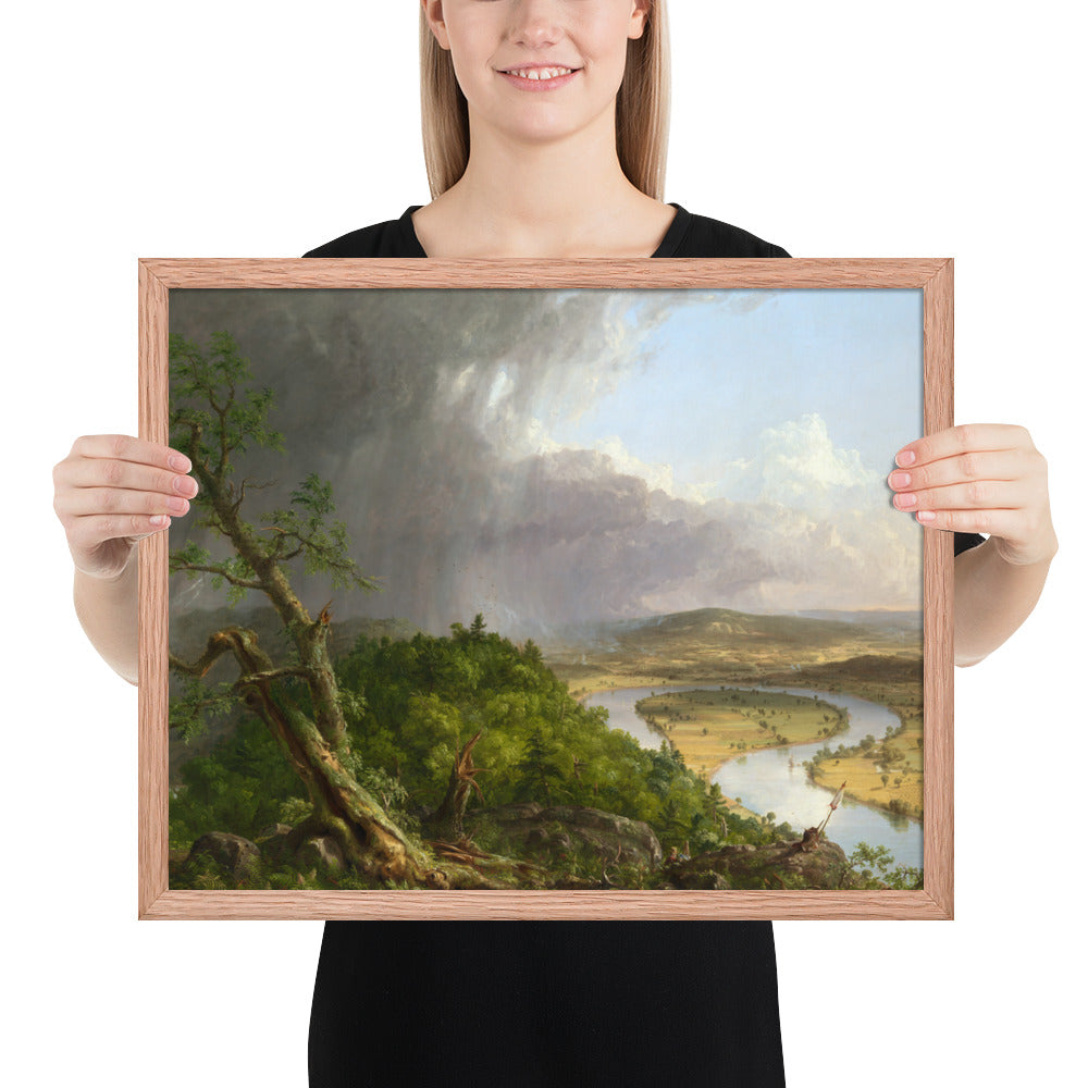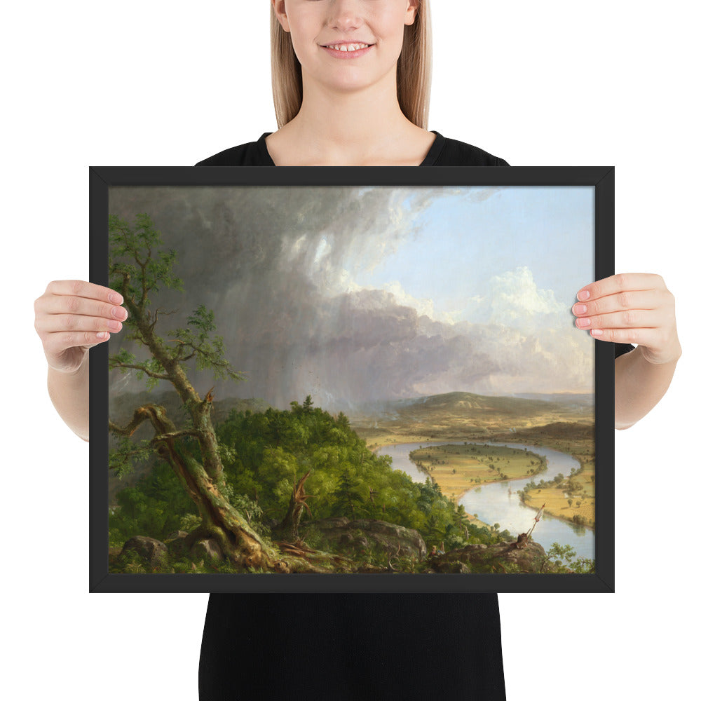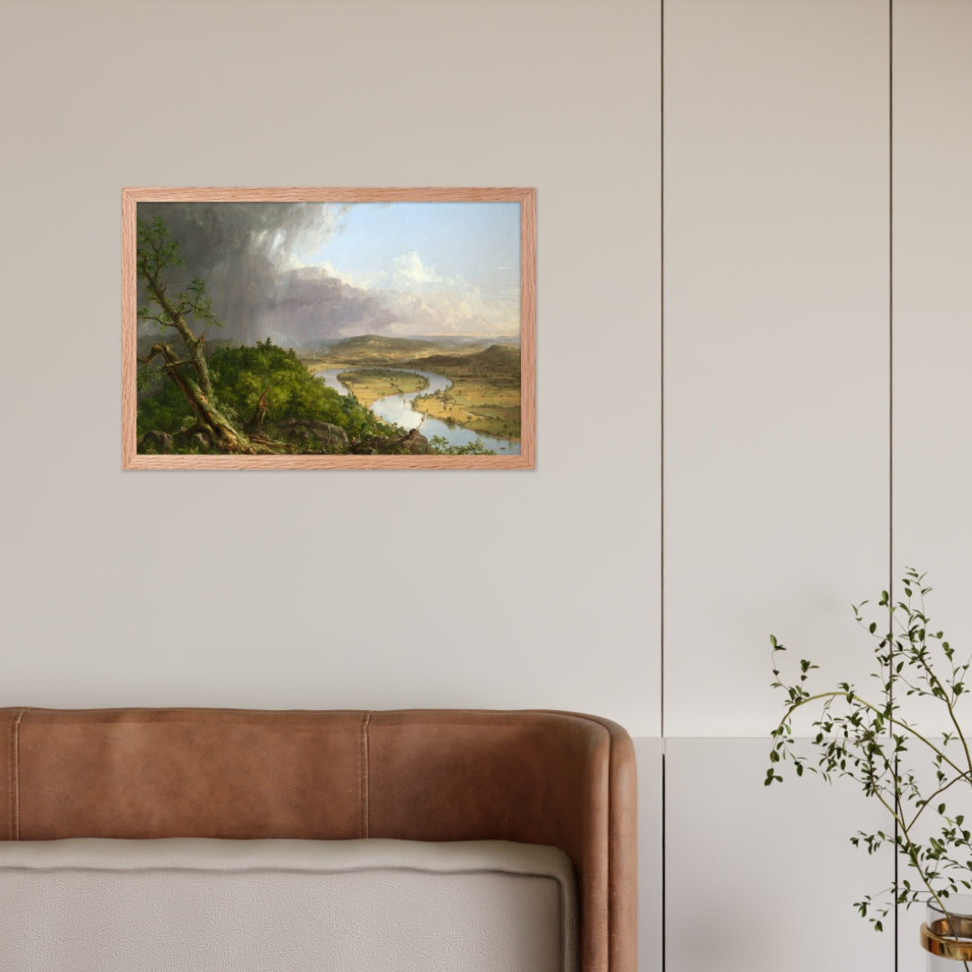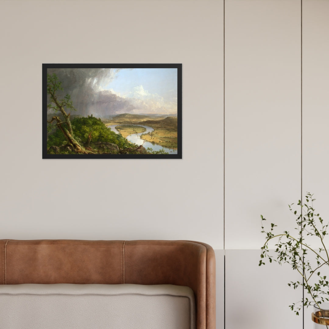Immerse your space in the sweeping drama of nature with The Oxbow by Thomas Cole, a masterwork of Romanticism that captures the tension between wilderness and civilization. This framed wall print presents a vivid panorama—storm clouds brooding over untamed forest on one side, while sunlight bathes a cultivated valley on the other. Painted in 1836, Cole’s vision from Mount Holyoke is more than landscape; it’s a philosophical reflection on progress, preservation, and the sublime power of nature.