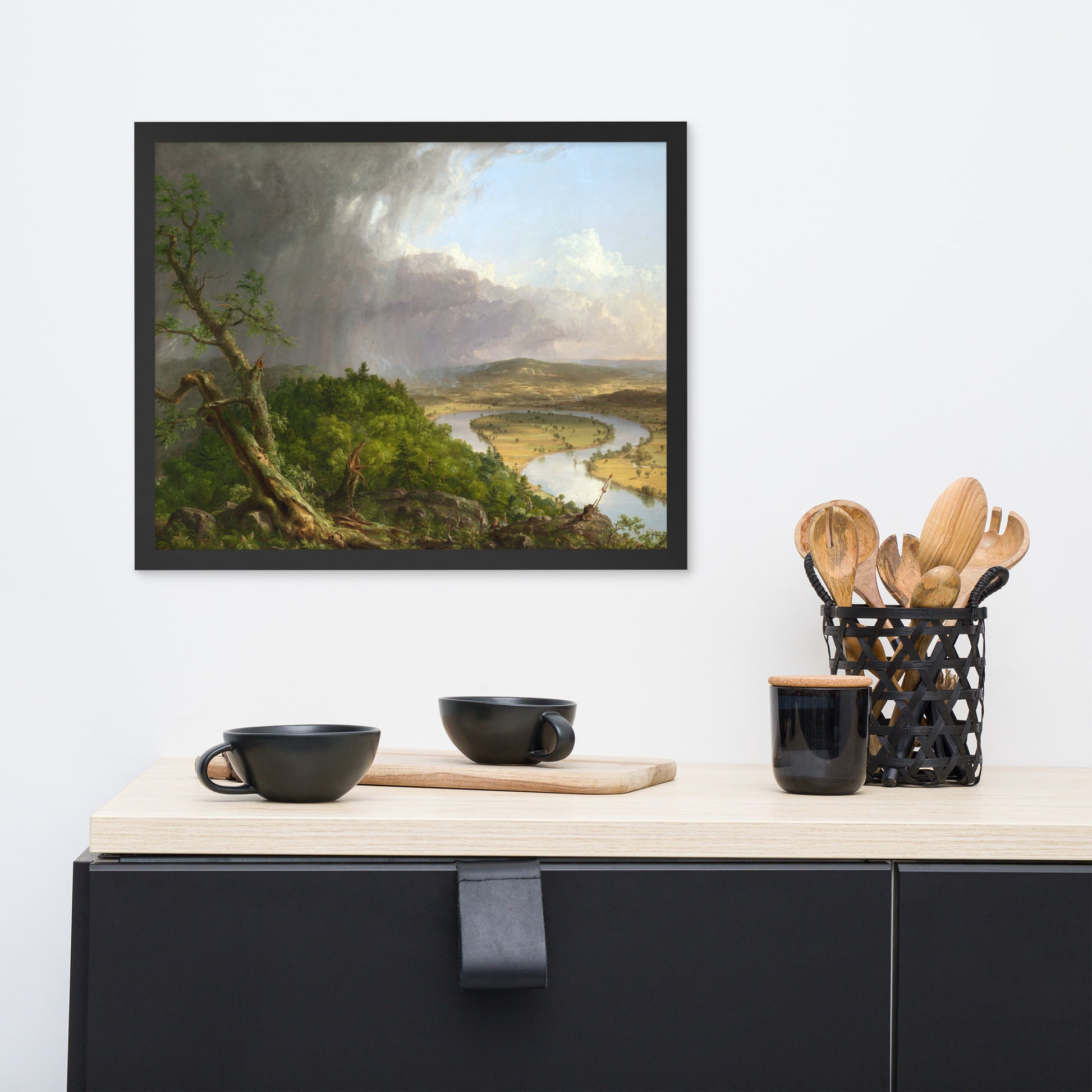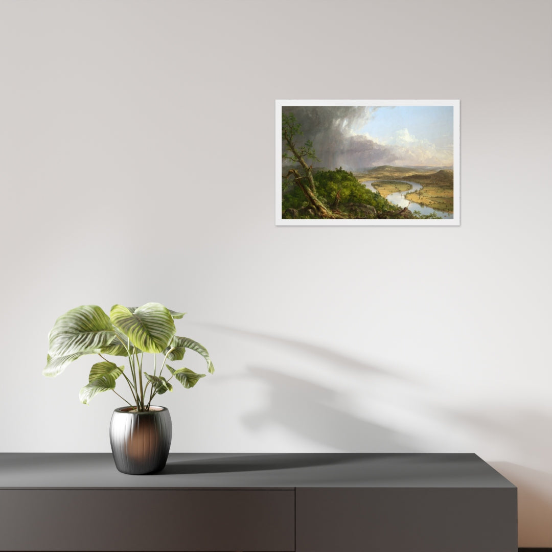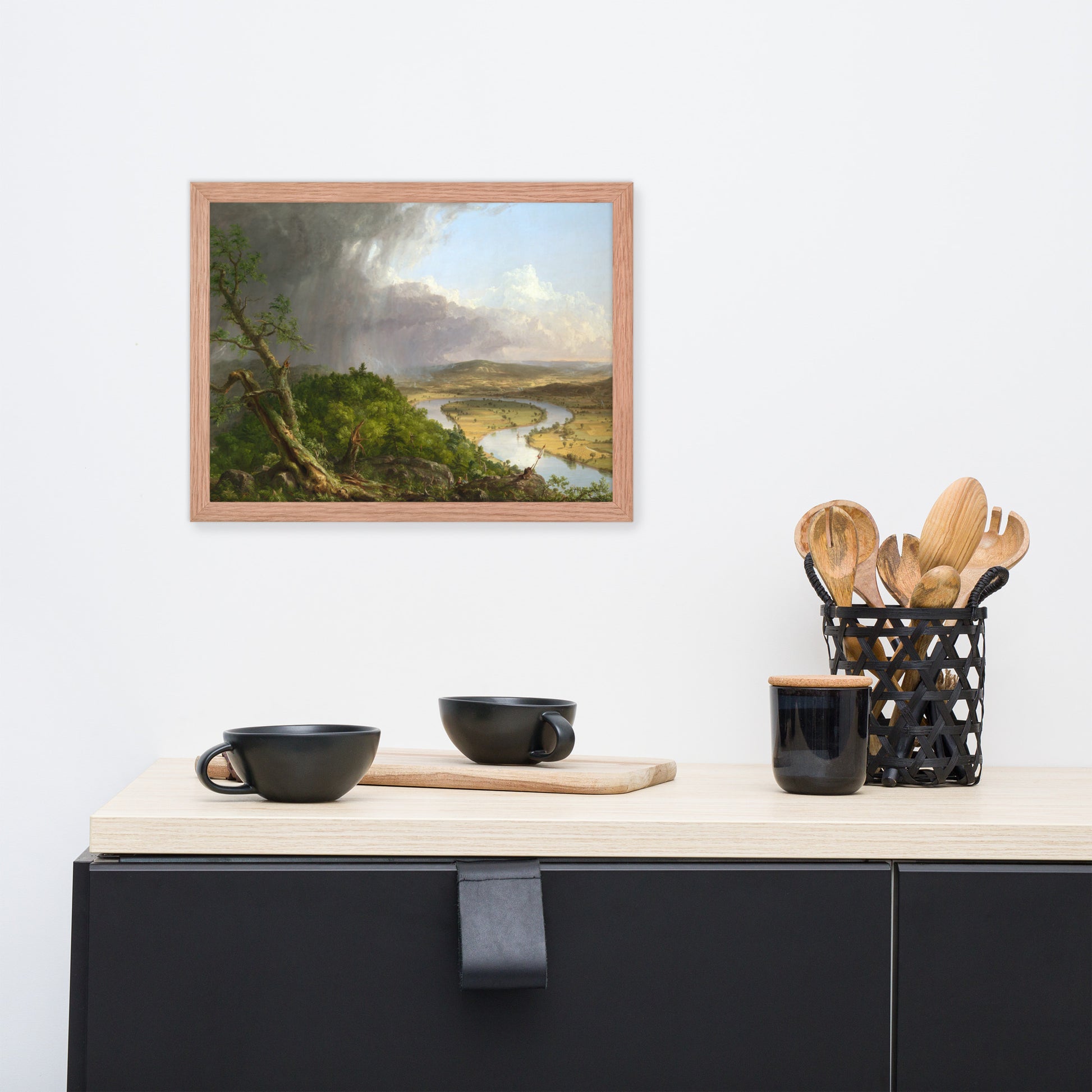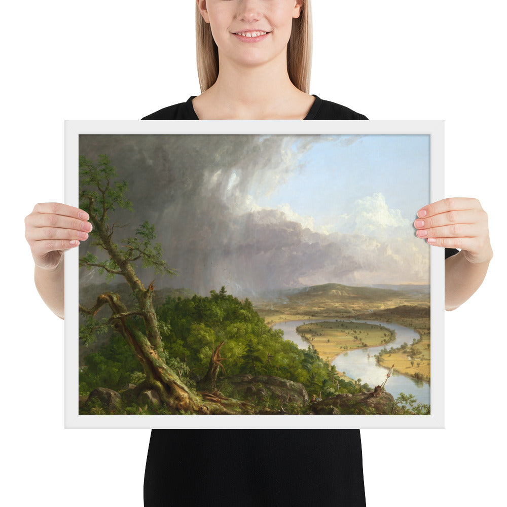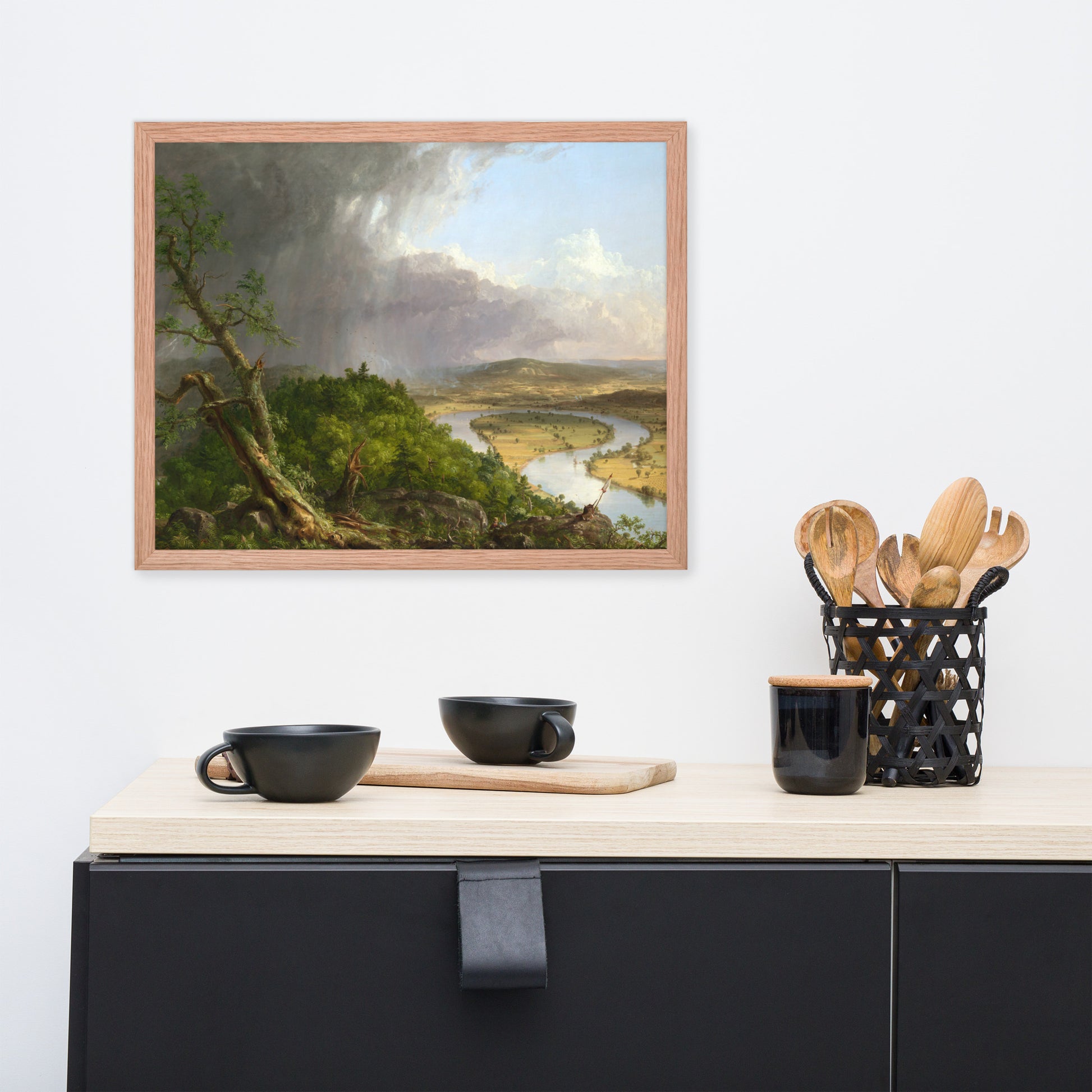 Immerse your space in the sweeping drama of nature with The Oxbow by Thomas Cole, a masterwork of Romanticism that captures the tension between wilderness and civilization. This framed wall print presents a vivid panorama—storm clouds brooding over untamed forest on one side, while sunlight bathes a cultivated valley on the other. Painted in 1836, Cole’s vision from Mount Holyoke is more than landscape; it’s a philosophical reflection on progress, preservation, and the sublime power of nature.