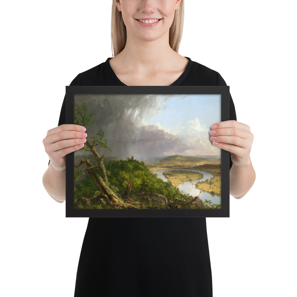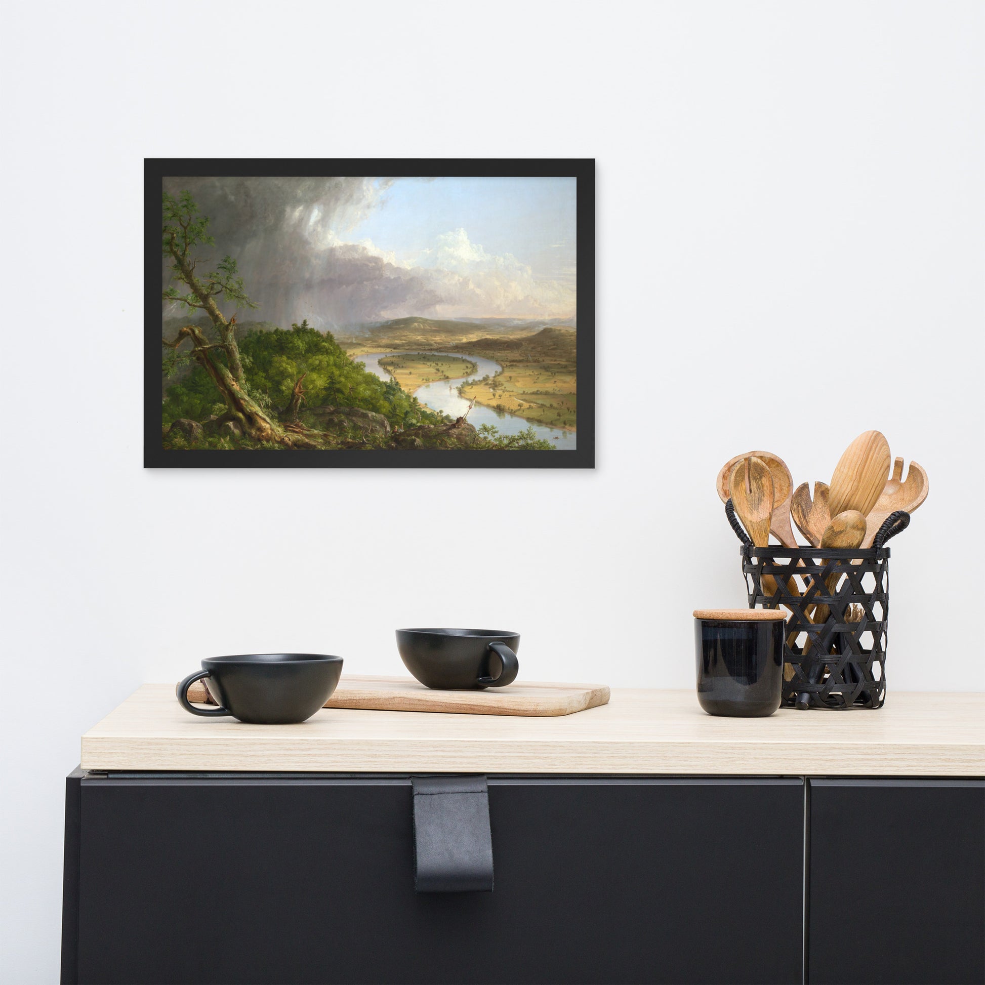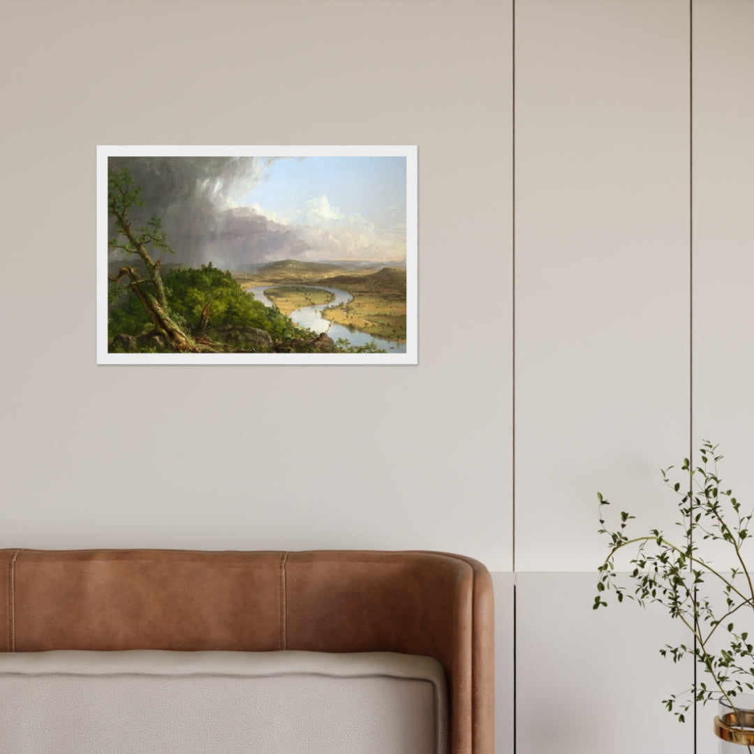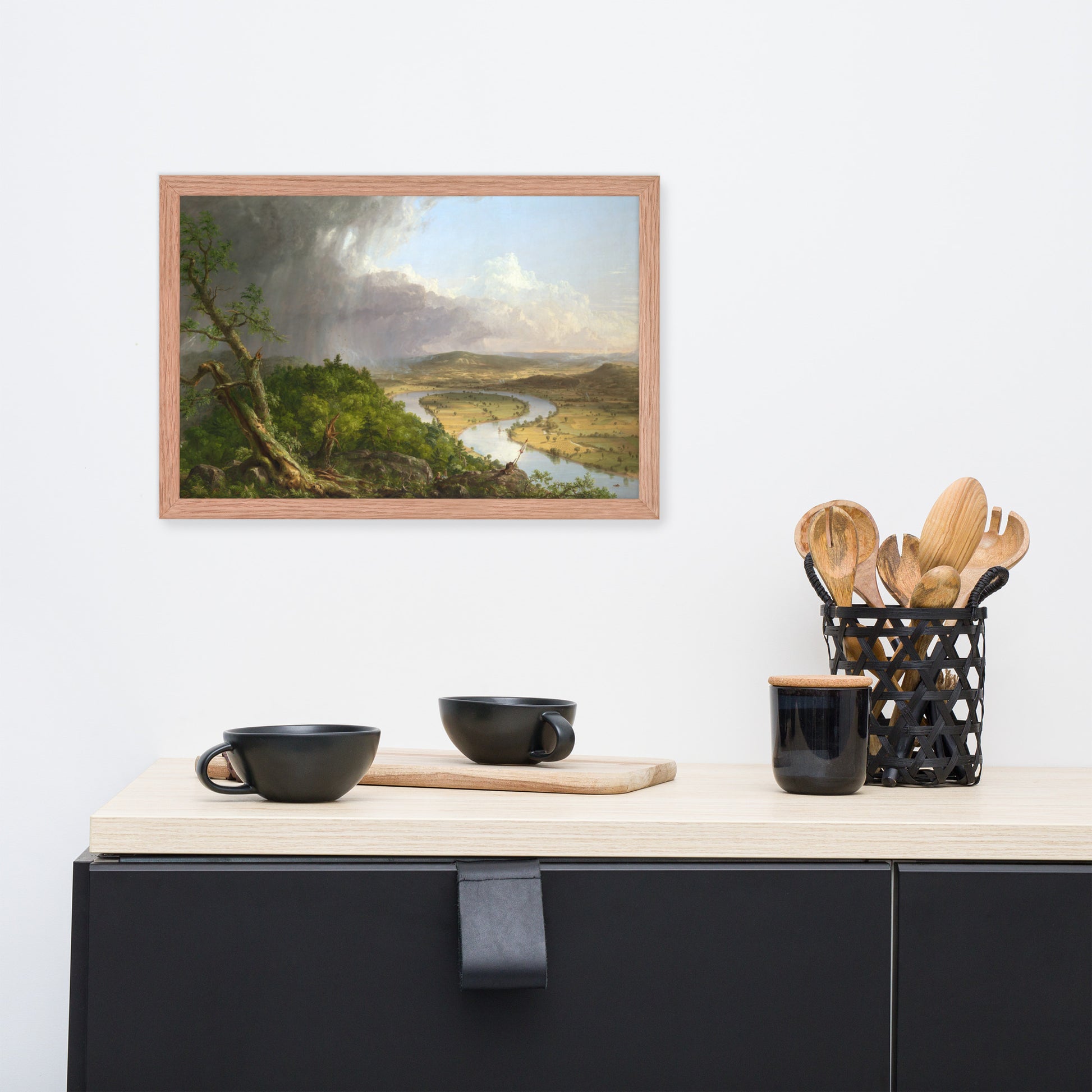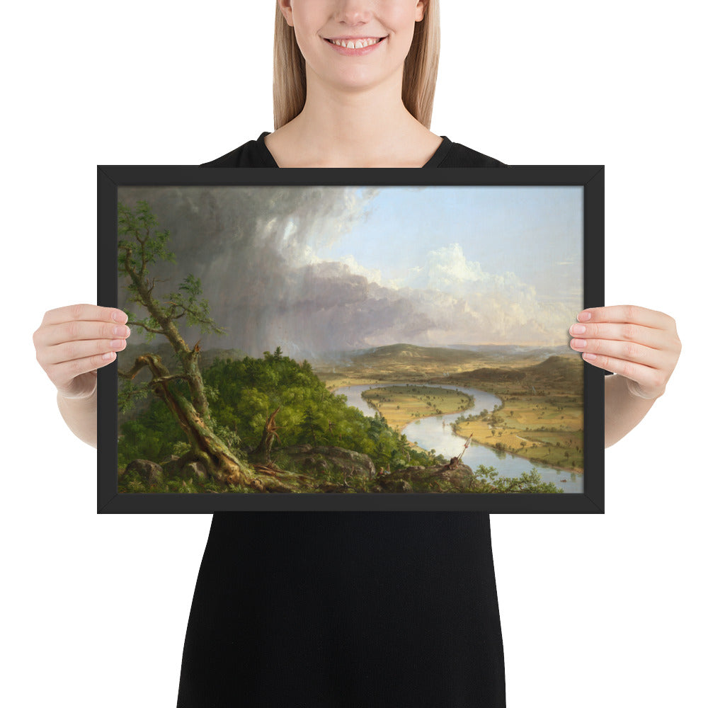 Immerse your space in the sweeping drama of nature with The Oxbow by Thomas Cole, a masterwork of Romanticism that captures the tension between wilderness and civilization. This framed wall print presents a vivid panorama—storm clouds brooding over untamed forest on one side, while sunlight bathes a cultivated valley on the other. Painted in 1836, Cole’s vision from Mount Holyoke is more than landscape; it’s a philosophical reflection on progress, preservation, and the sublime power of nature.