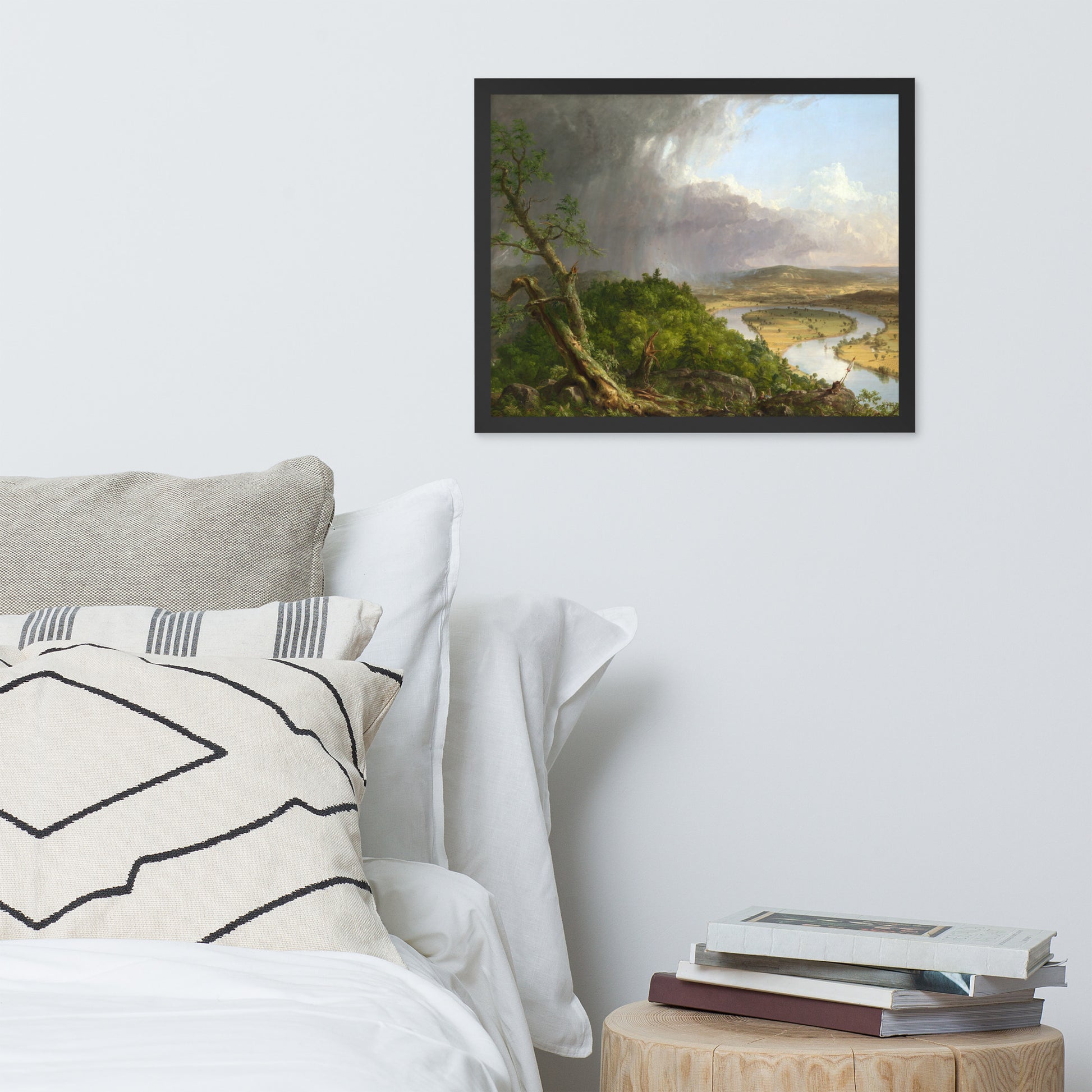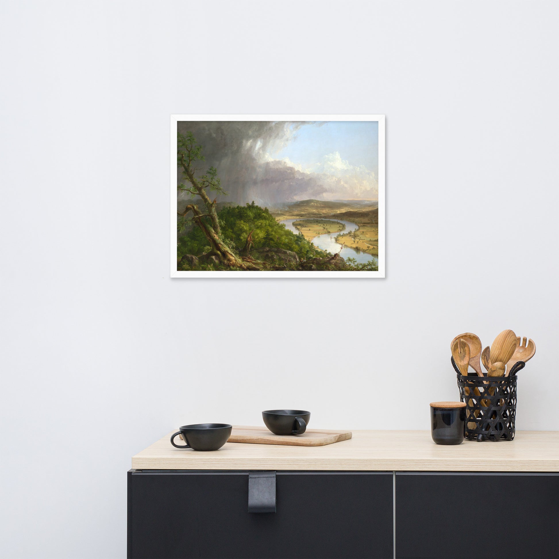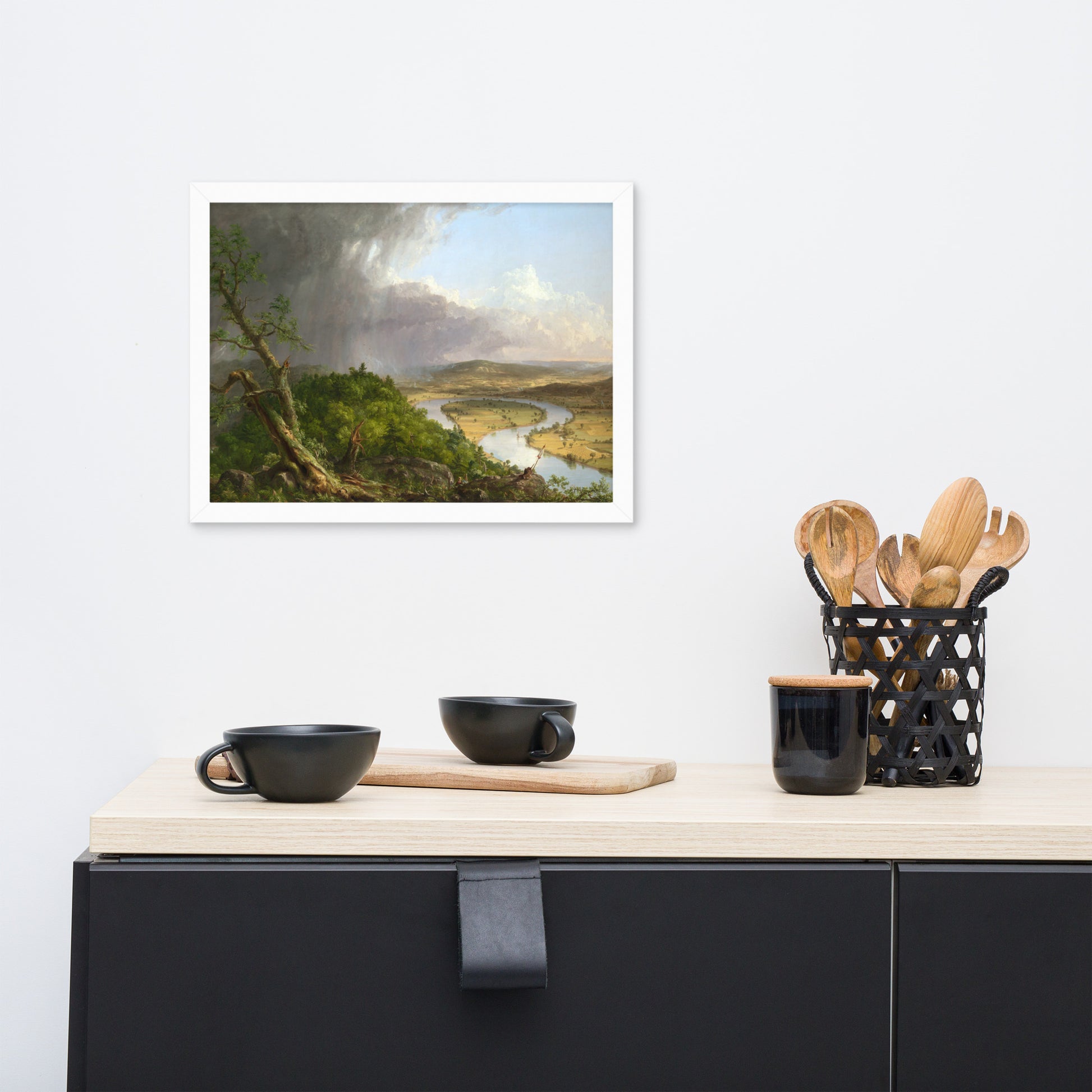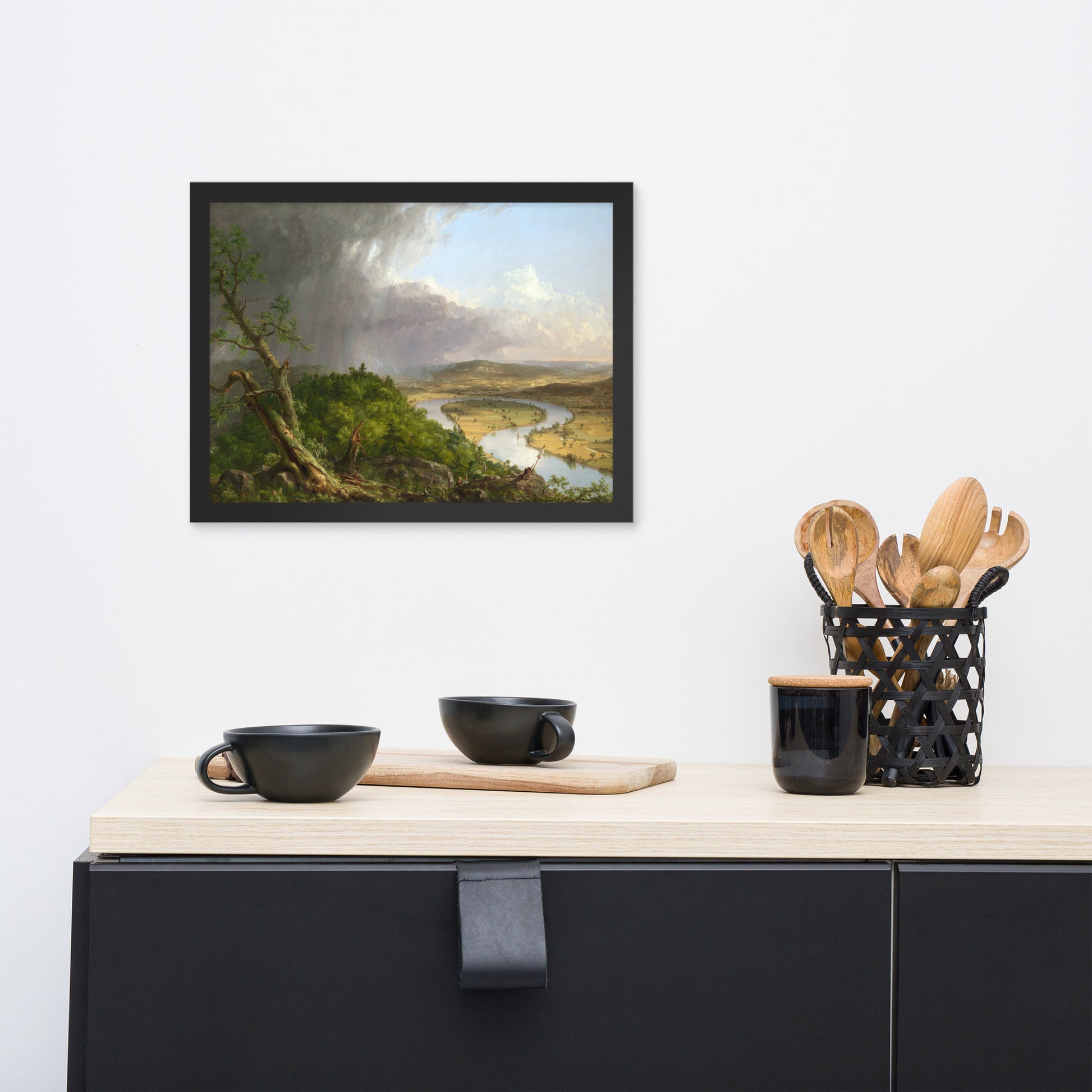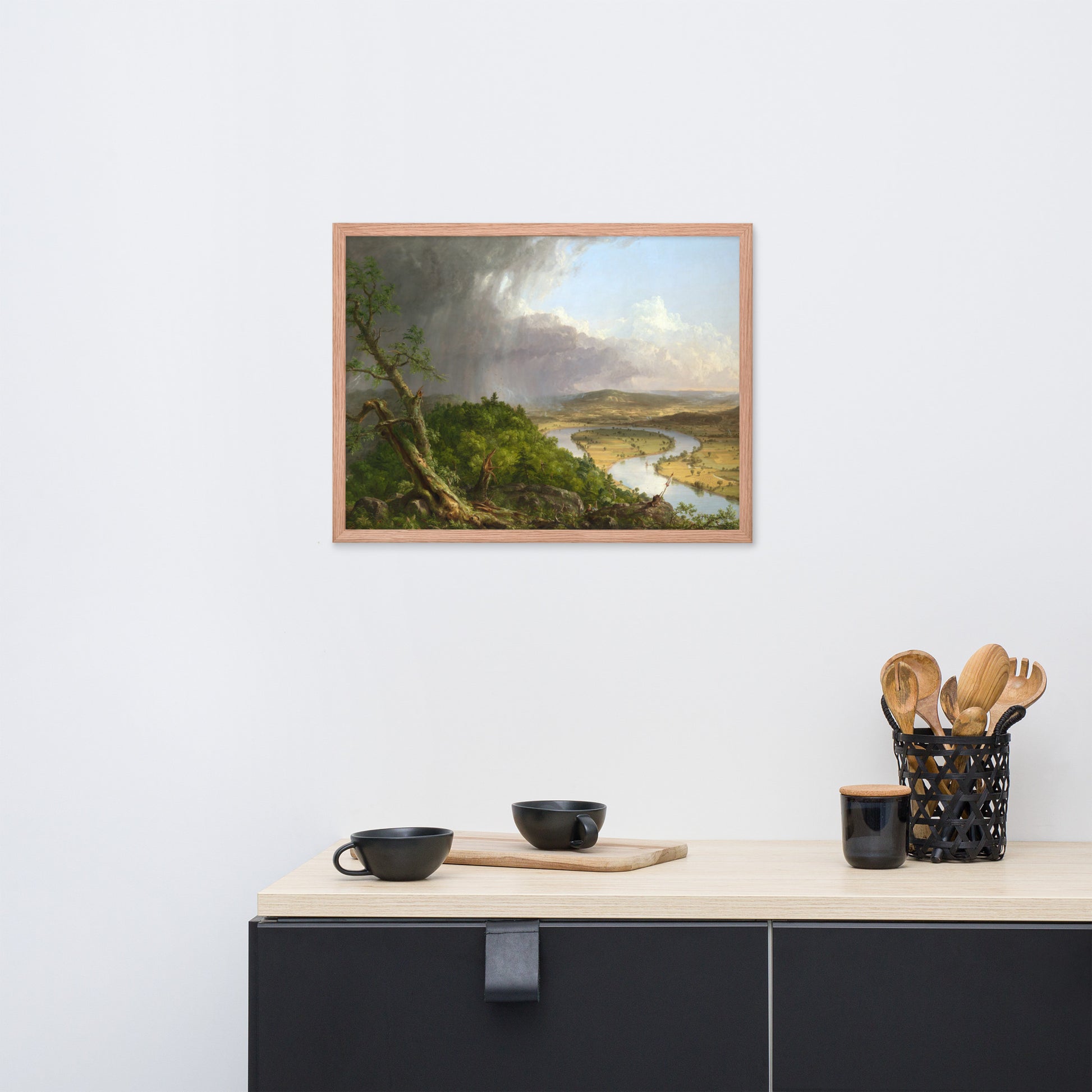 Immerse your space in the sweeping drama of nature with The Oxbow by Thomas Cole, a masterwork of Romanticism that captures the tension between wilderness and civilization. This framed wall print presents a vivid panorama—storm clouds brooding over untamed forest on one side, while sunlight bathes a cultivated valley on the other. Painted in 1836, Cole’s vision from Mount Holyoke is more than landscape; it’s a philosophical reflection on progress, preservation, and the sublime power of nature.