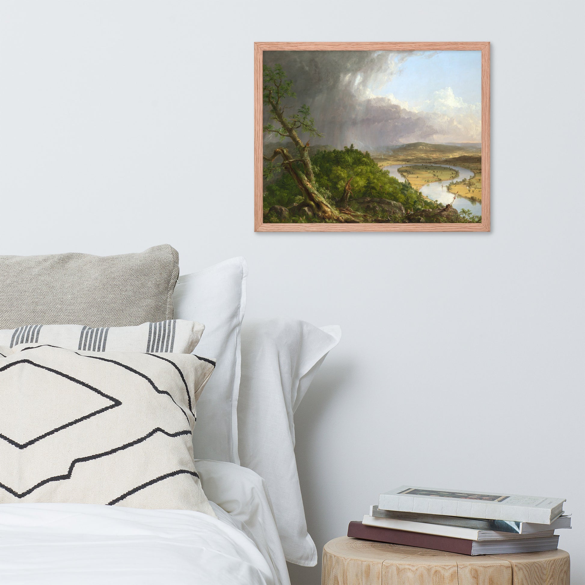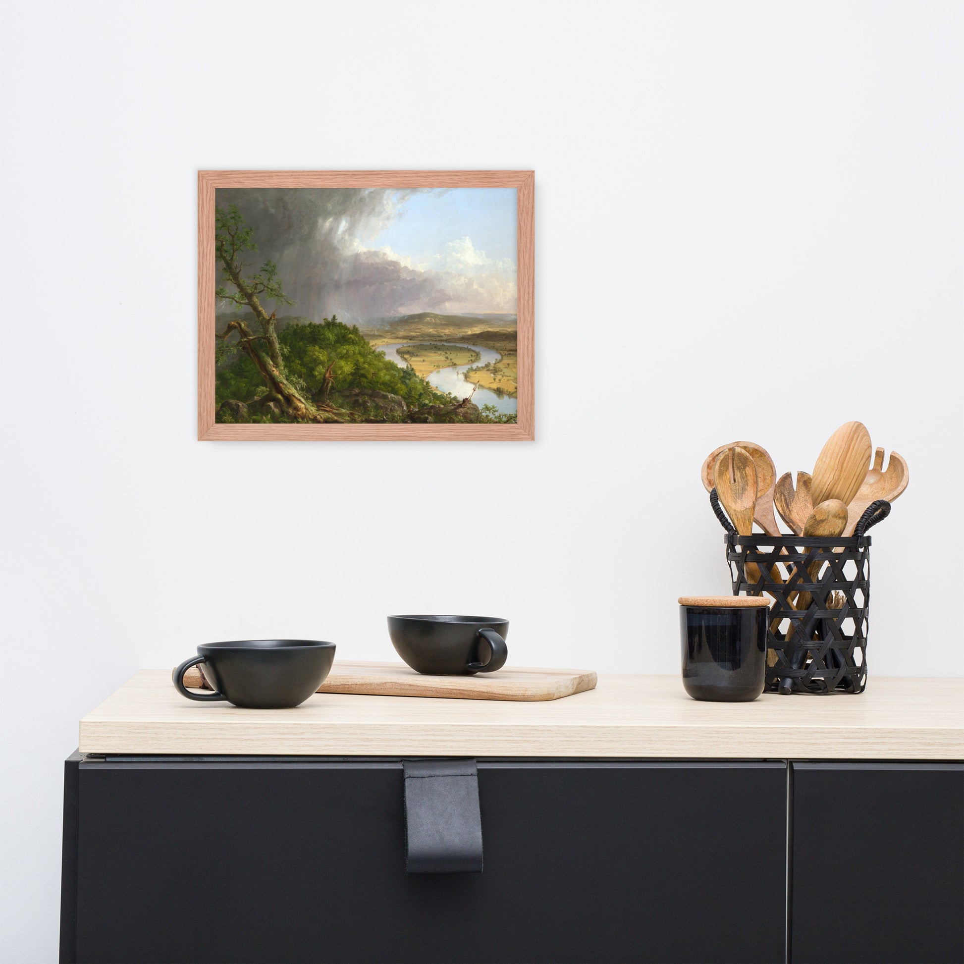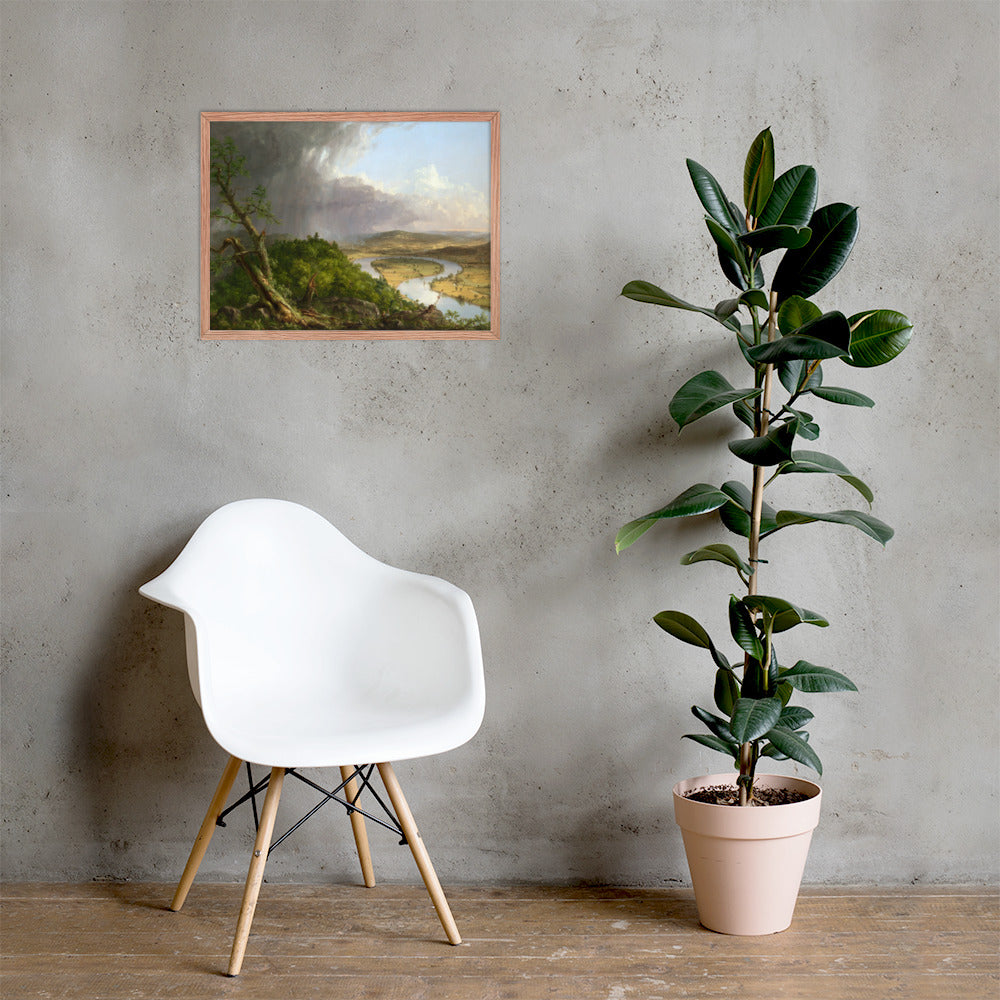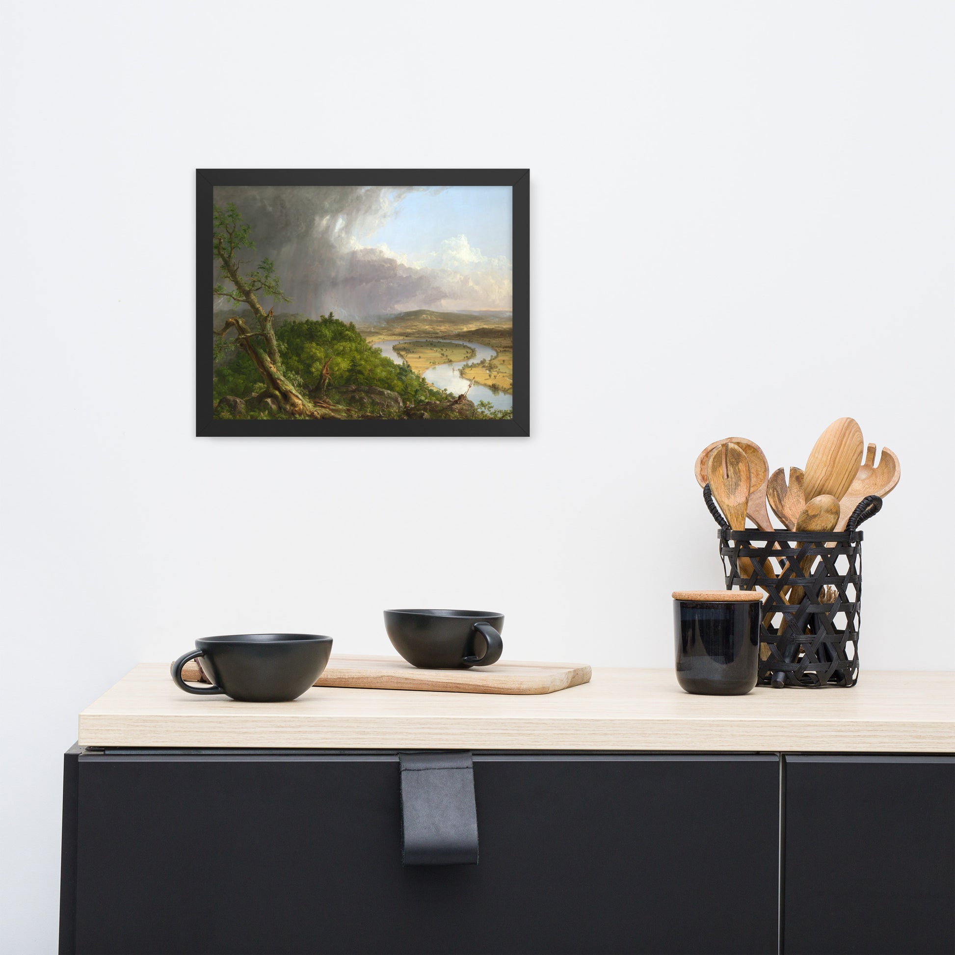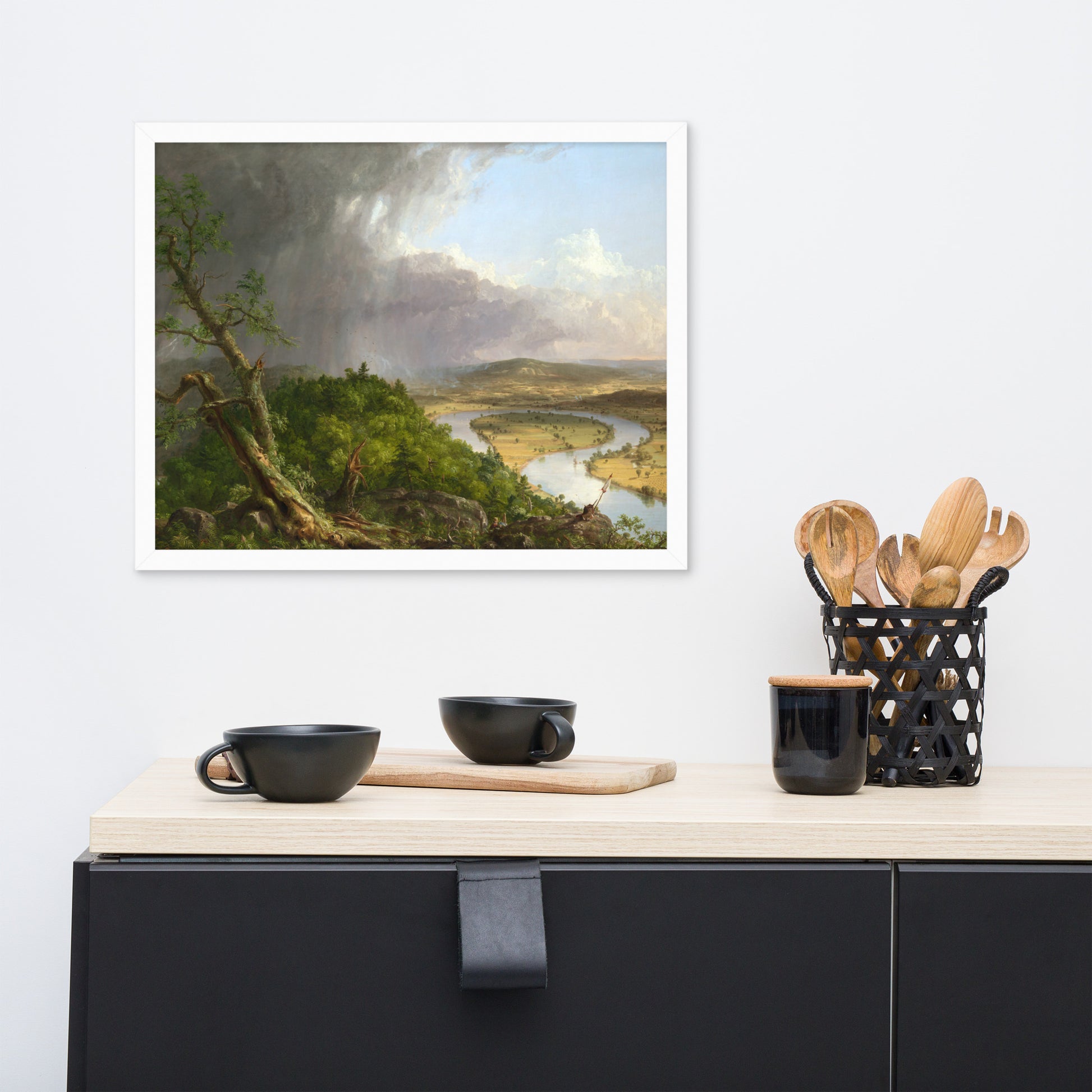 Immerse your space in the sweeping drama of nature with The Oxbow by Thomas Cole, a masterwork of Romanticism that captures the tension between wilderness and civilization. This framed wall print presents a vivid panorama—storm clouds brooding over untamed forest on one side, while sunlight bathes a cultivated valley on the other. Painted in 1836, Cole’s vision from Mount Holyoke is more than landscape; it’s a philosophical reflection on progress, preservation, and the sublime power of nature.