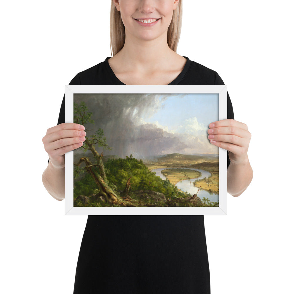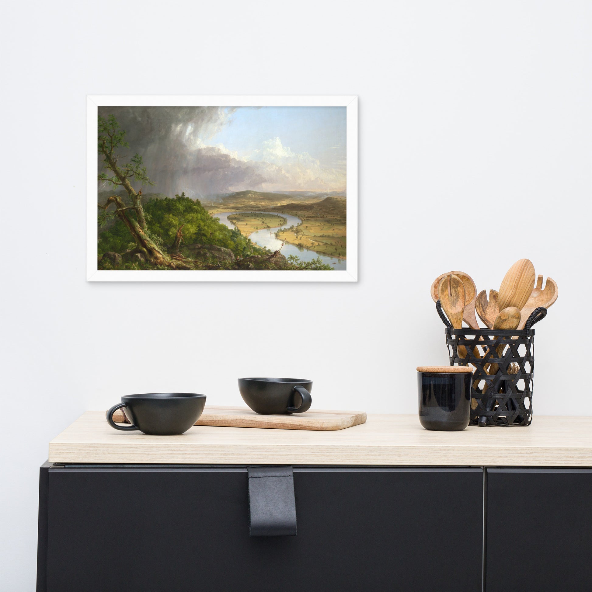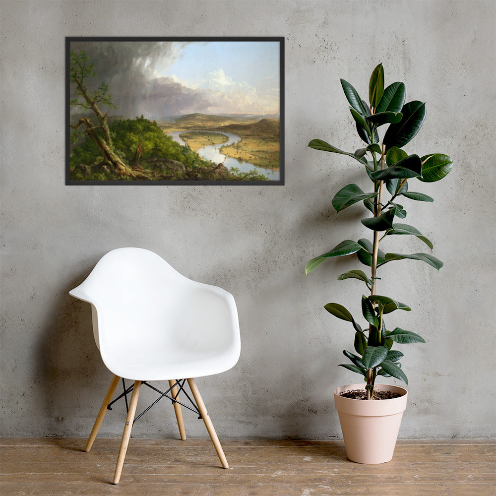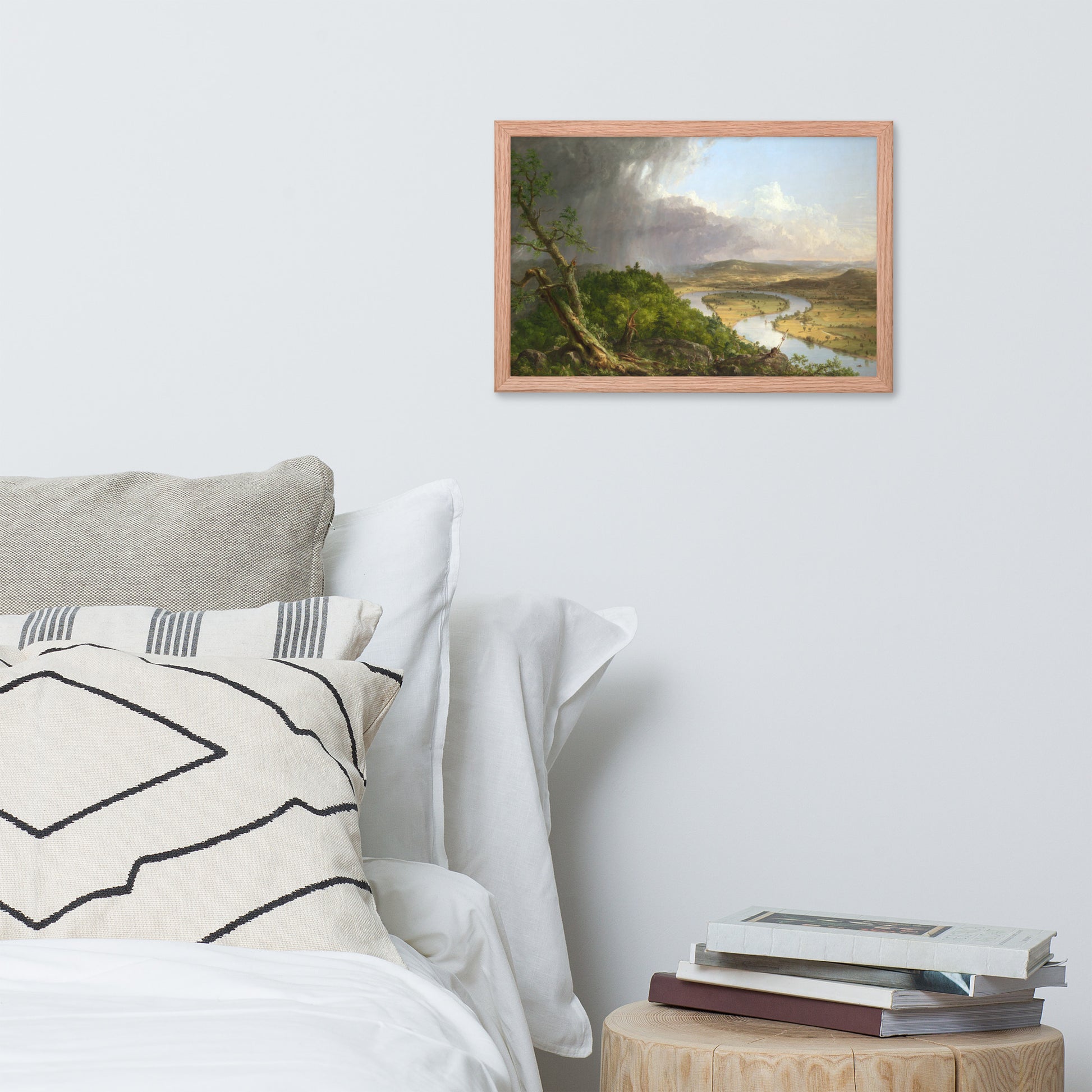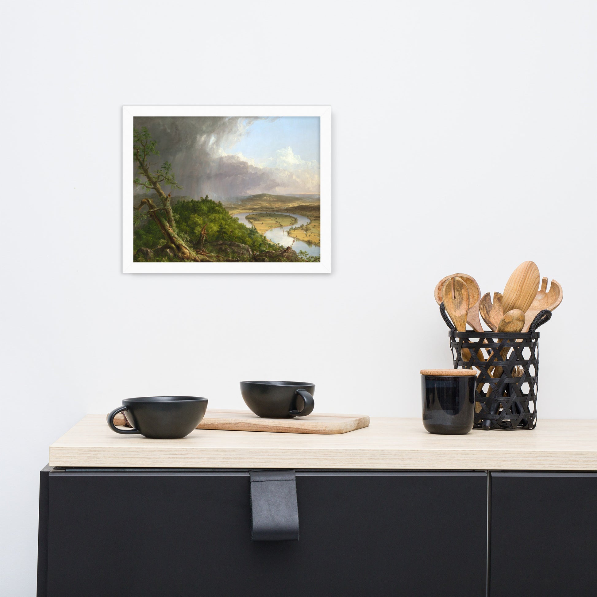 Immerse your space in the sweeping drama of nature with The Oxbow by Thomas Cole, a masterwork of Romanticism that captures the tension between wilderness and civilization. This framed wall print presents a vivid panorama—storm clouds brooding over untamed forest on one side, while sunlight bathes a cultivated valley on the other. Painted in 1836, Cole’s vision from Mount Holyoke is more than landscape; it’s a philosophical reflection on progress, preservation, and the sublime power of nature.