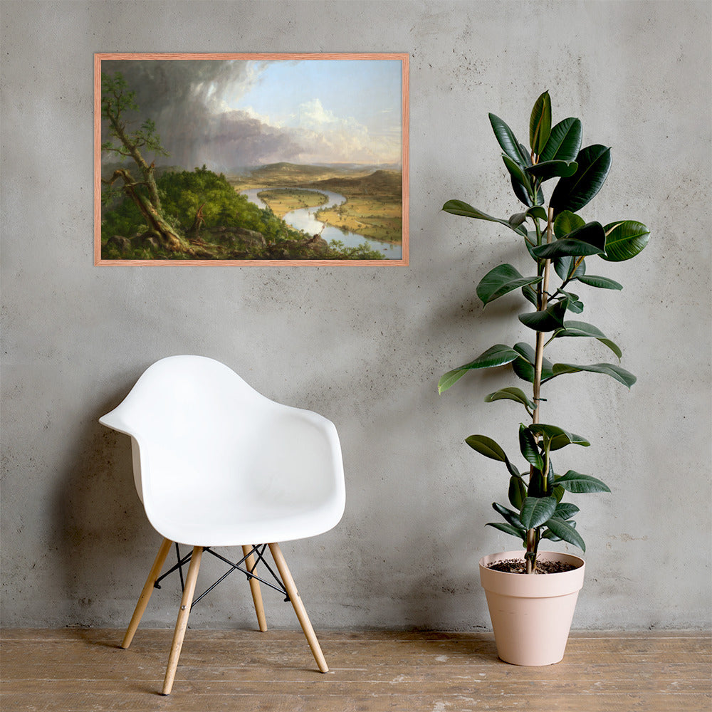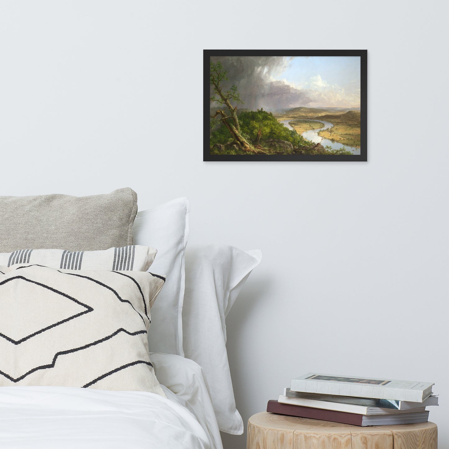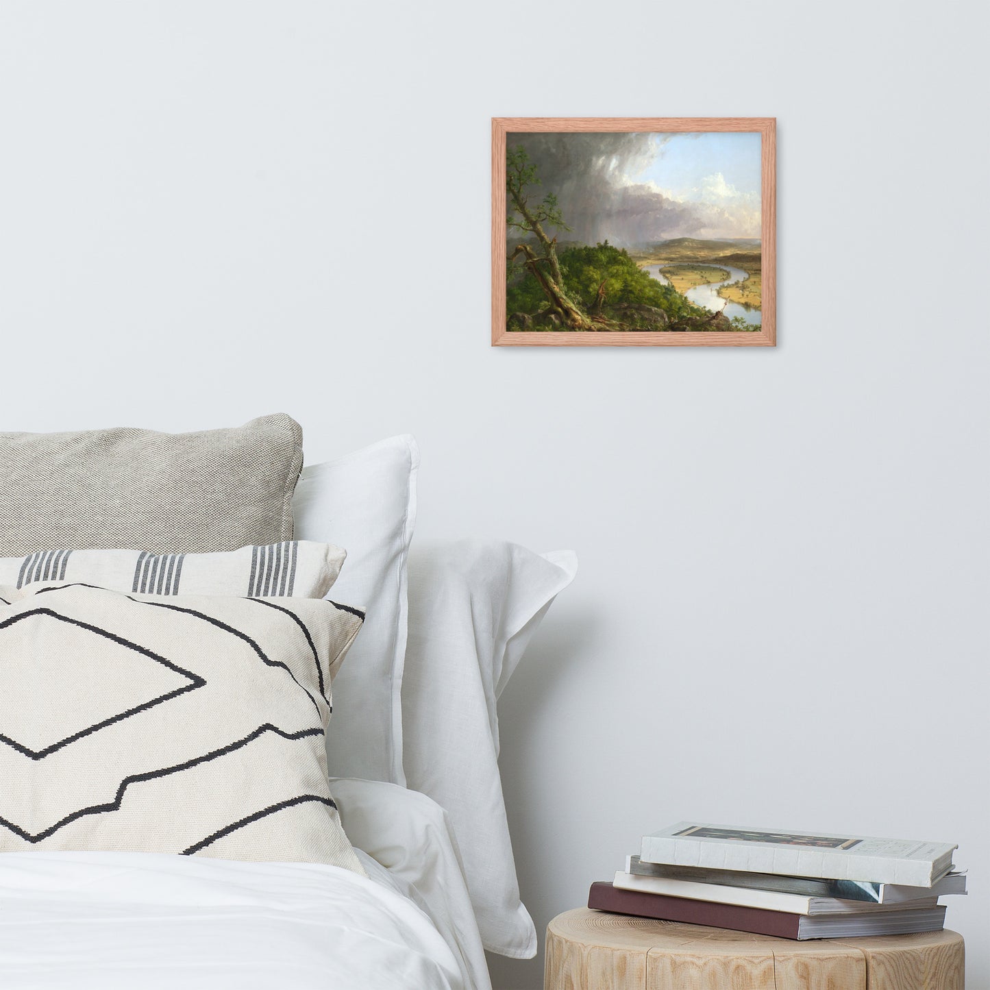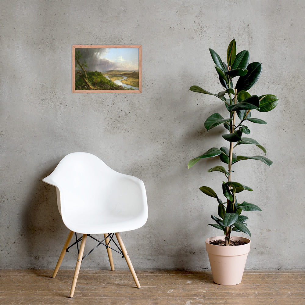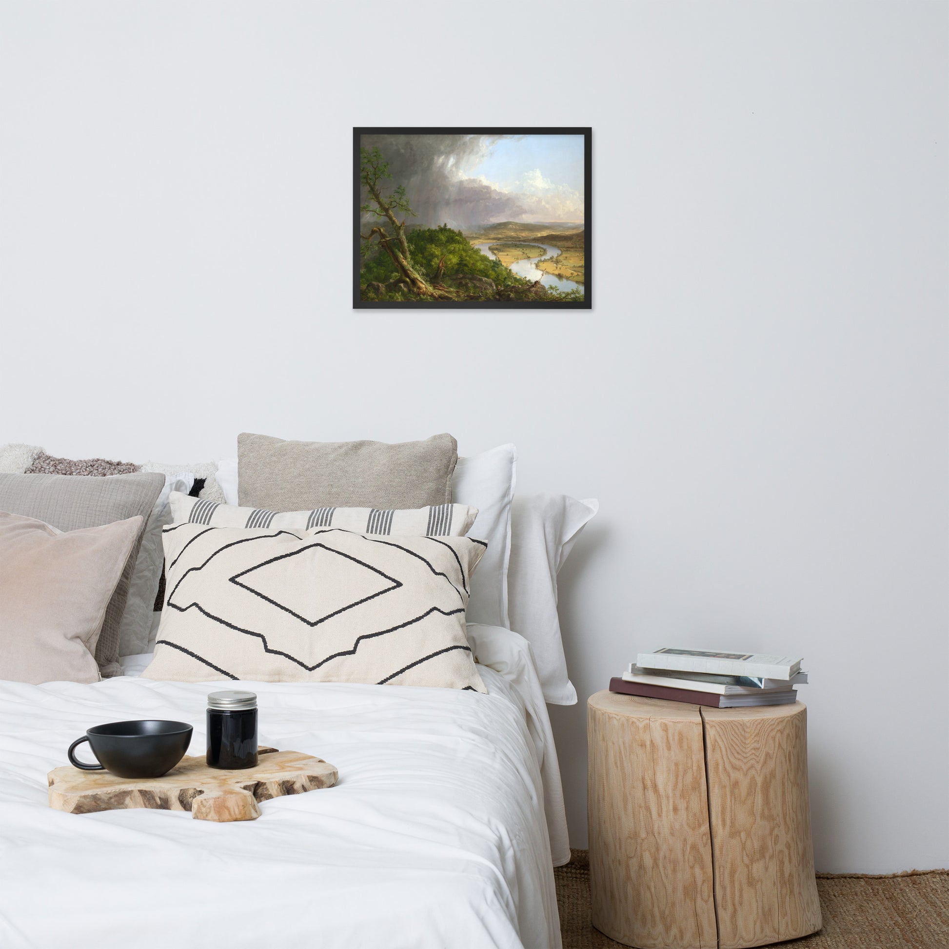 Immerse your space in the sweeping drama of nature with The Oxbow by Thomas Cole, a masterwork of Romanticism that captures the tension between wilderness and civilization. This framed wall print presents a vivid panorama—storm clouds brooding over untamed forest on one side, while sunlight bathes a cultivated valley on the other. Painted in 1836, Cole’s vision from Mount Holyoke is more than landscape; it’s a philosophical reflection on progress, preservation, and the sublime power of nature.
