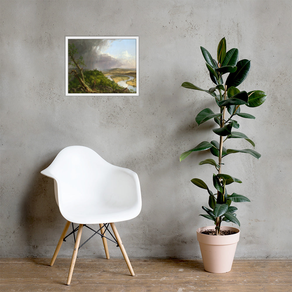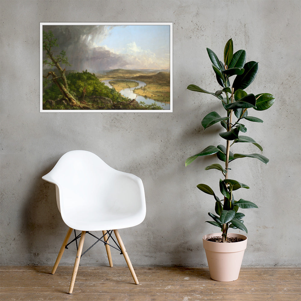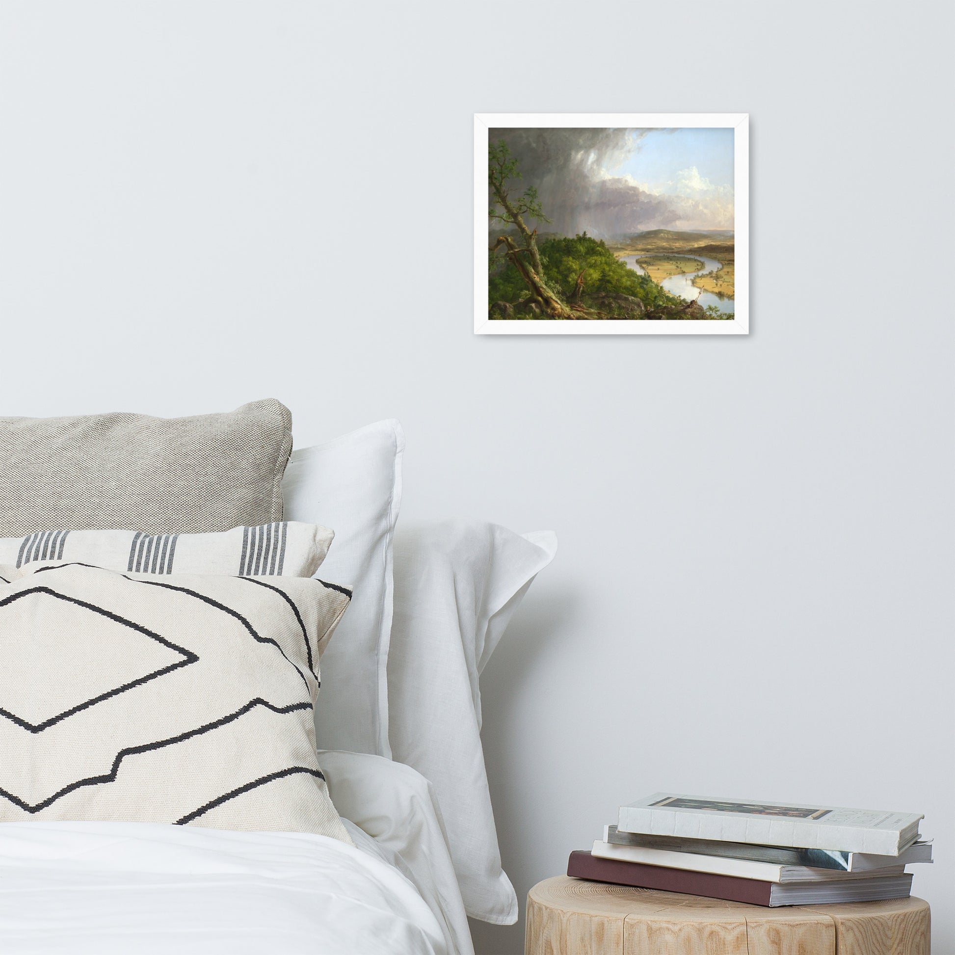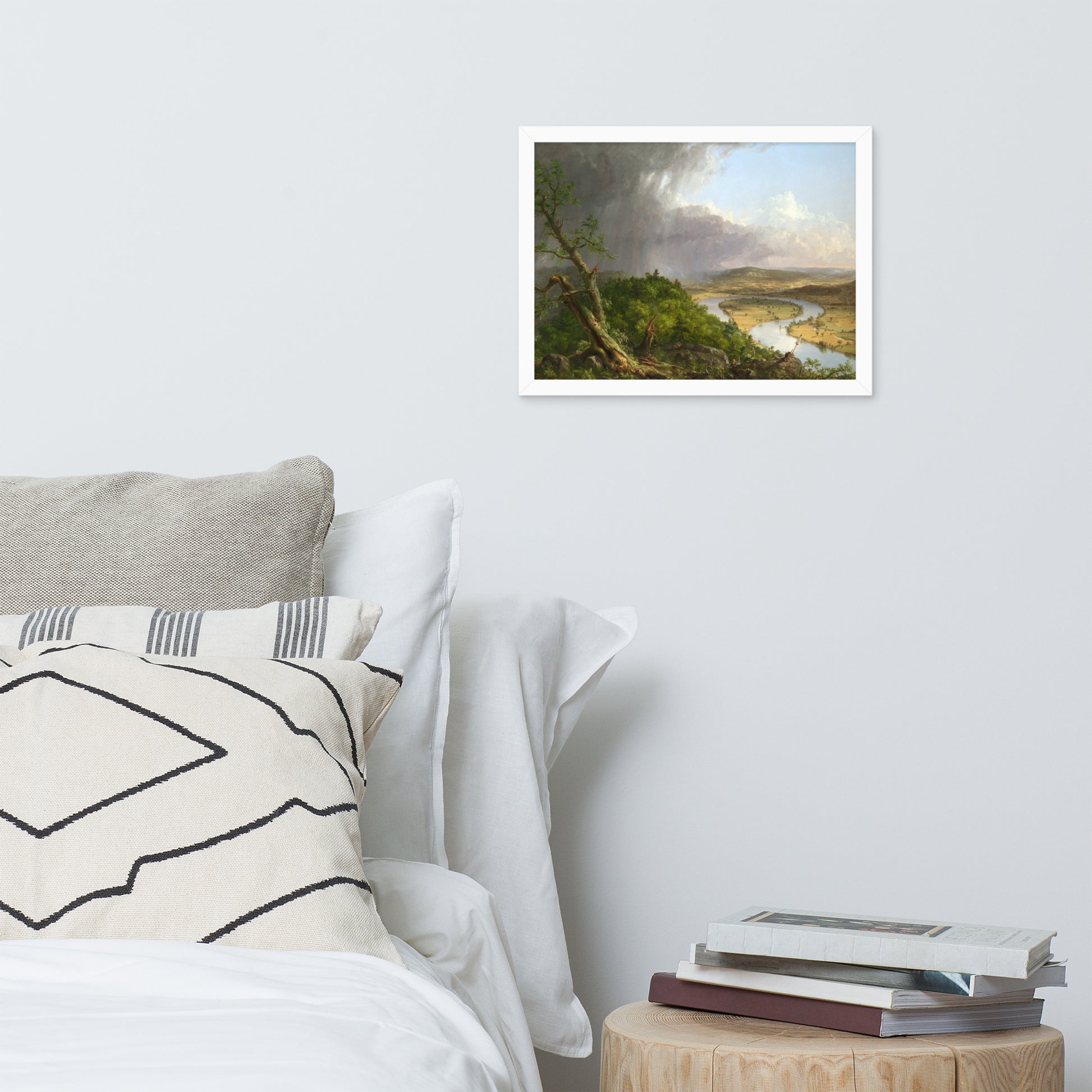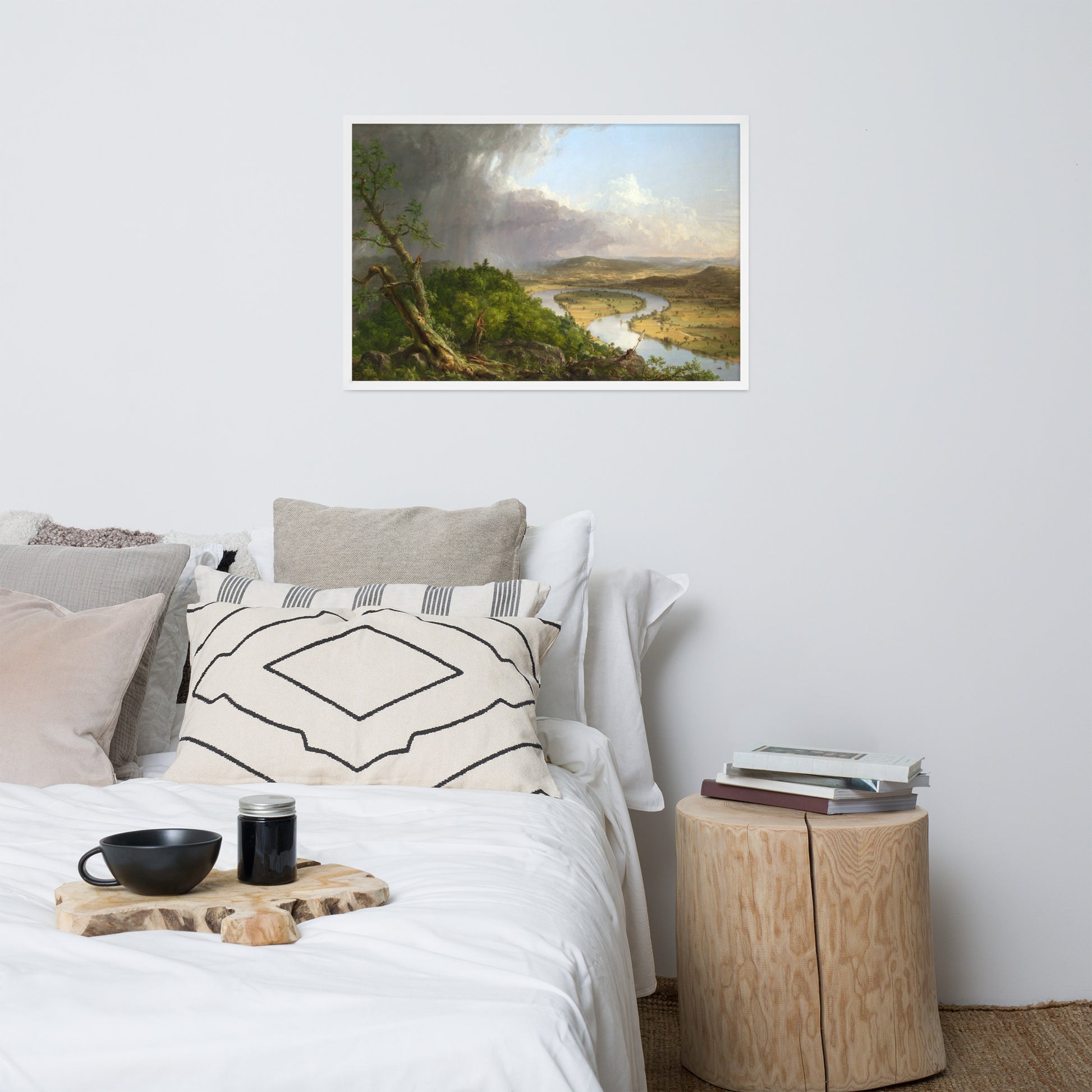Immerse your space in the sweeping drama of nature with The Oxbow by Thomas Cole, a masterwork of Romanticism that captures the tension between wilderness and civilization. This framed wall print presents a vivid panorama—storm clouds brooding over untamed forest on one side, while sunlight bathes a cultivated valley on the other. Painted in 1836, Cole’s vision from Mount Holyoke is more than landscape; it’s a philosophical reflection on progress, preservation, and the sublime power of nature.