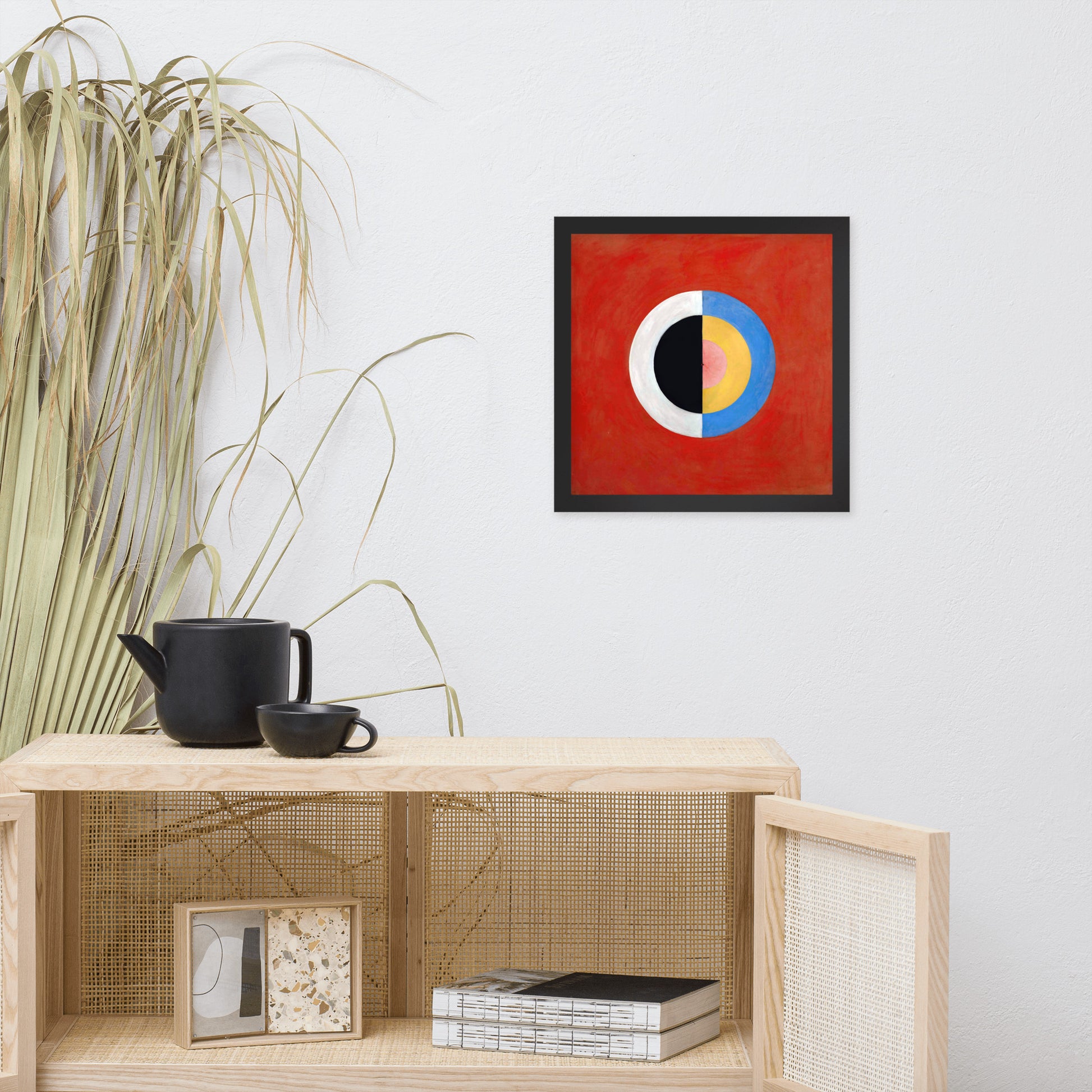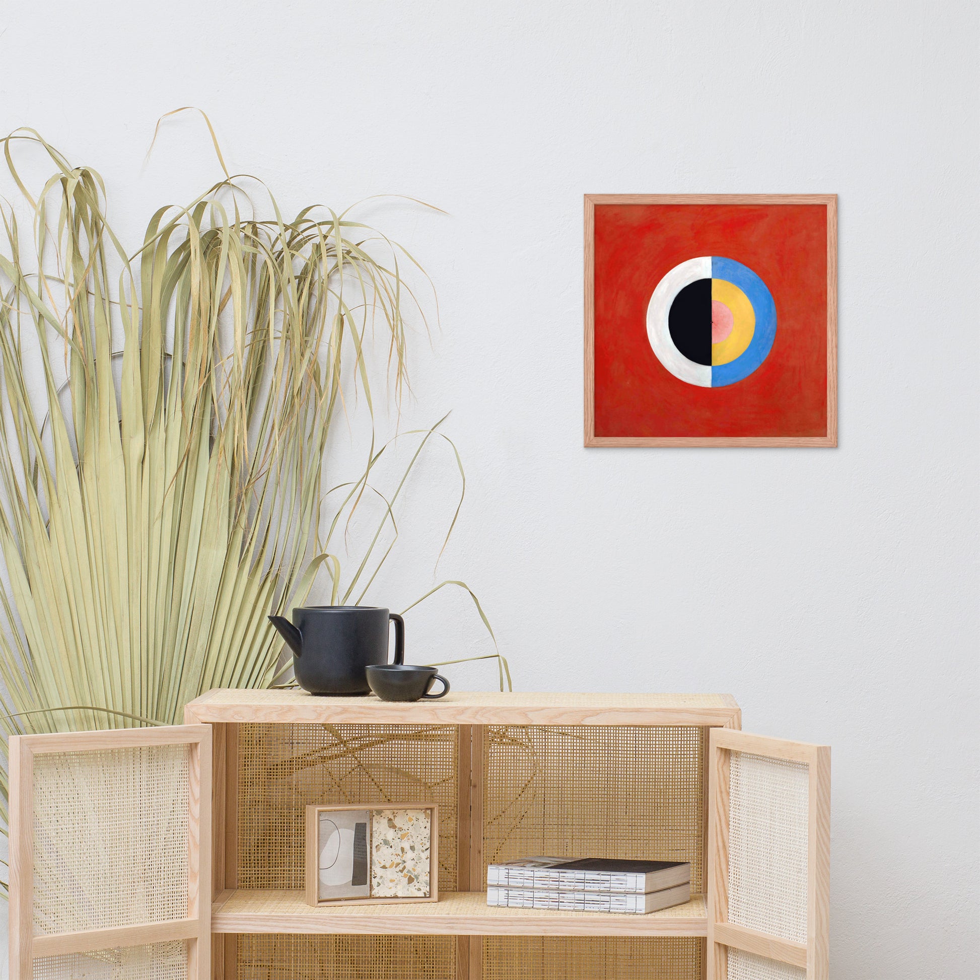 Bring home a striking piece of spiritual abstraction with The Swan, No. 17 by Hilma af Klint—now available as a premium framed wall print. This captivating artwork features a symmetrical circular motif split into contrasting halves: one side grounded in stark black and white, the other radiating with vibrant concentric rings of blue, yellow, and pink. Set against a bold red backdrop, the composition evokes themes of duality, cosmic balance, and inner transformation.