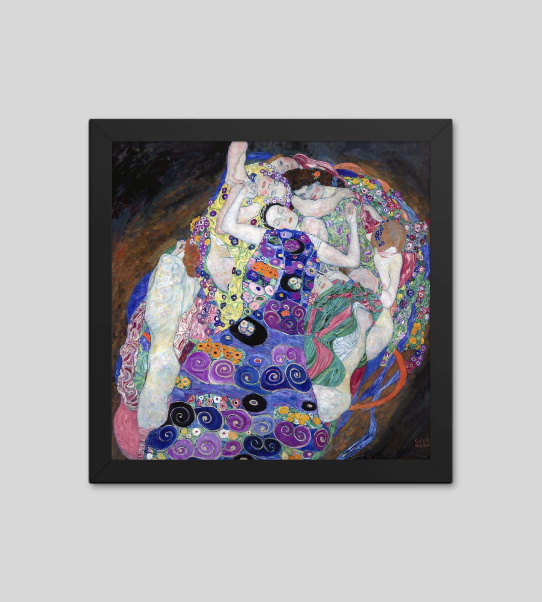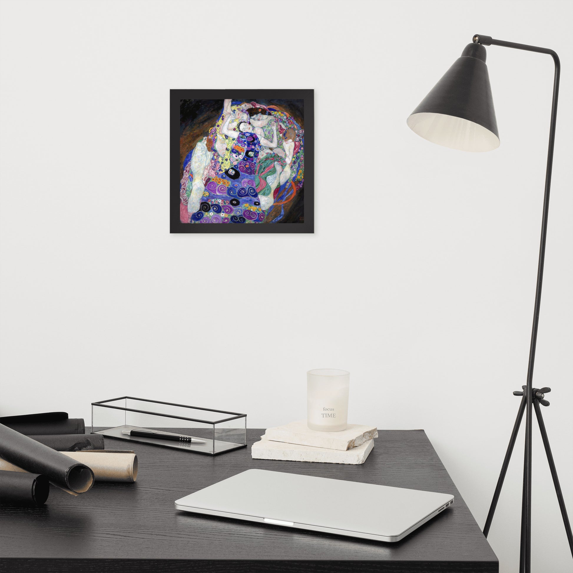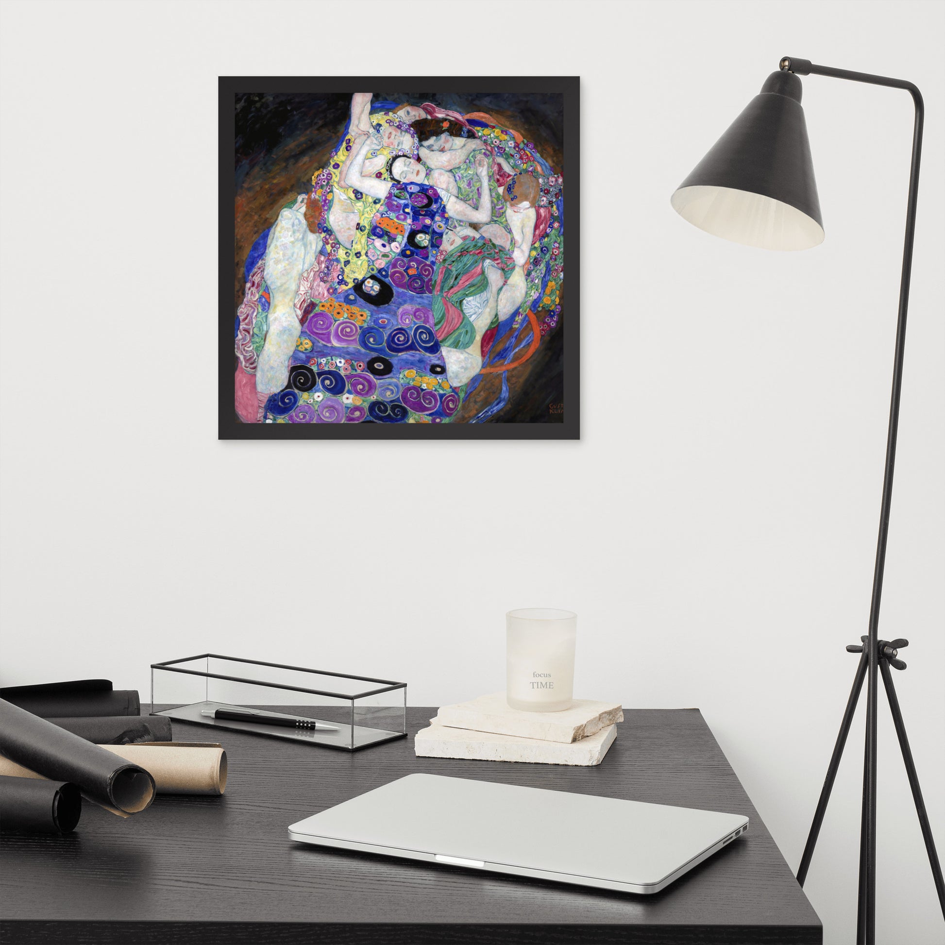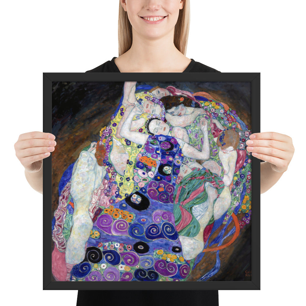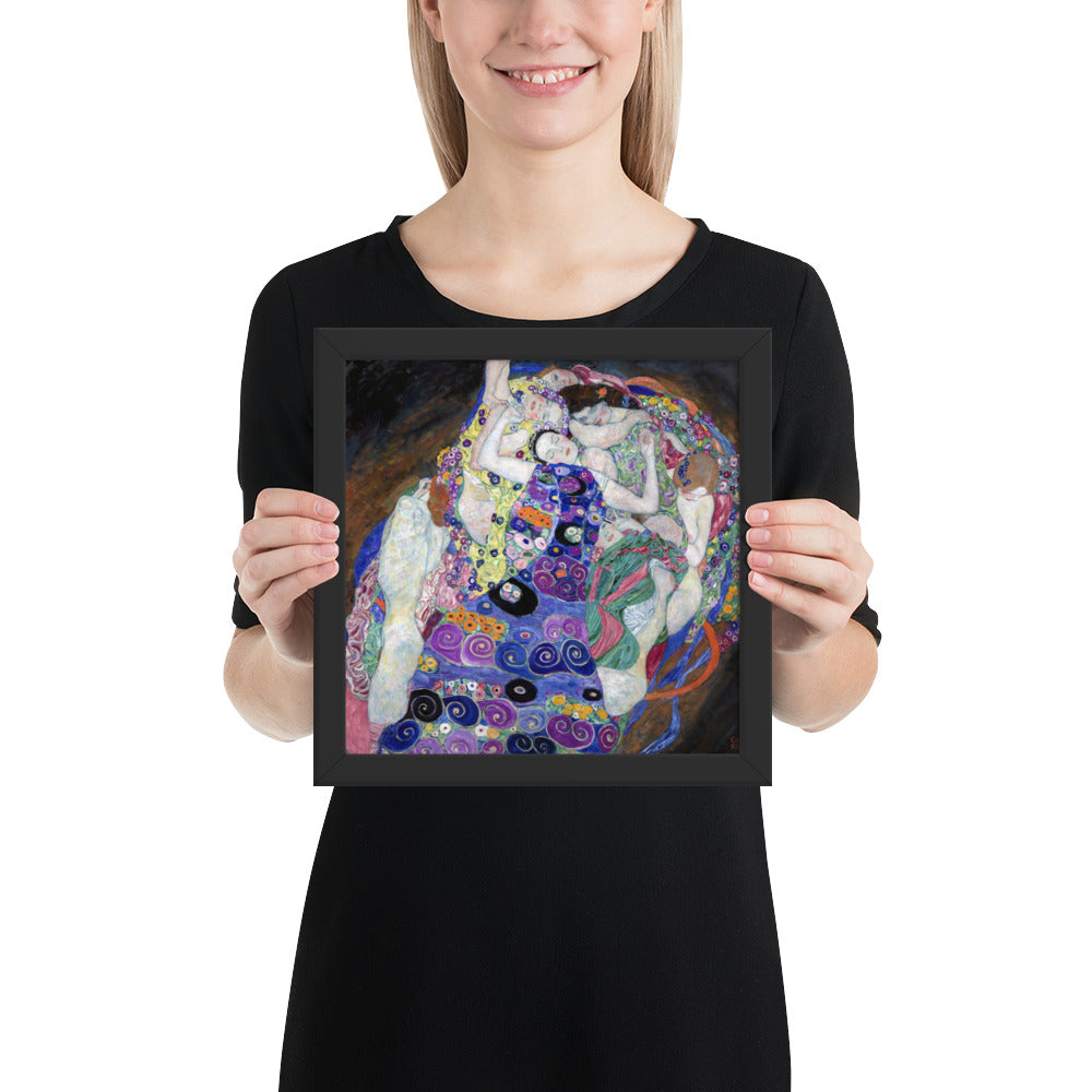 Immerse yourself in the dreamlike symbolism of The Virgin by Gustav Klimt—an Art Nouveau framed wall print that celebrates femininity, sensuality, and the cycle of life. This captivating composition features a cluster of intertwined female figures, arranged in a circular flow that suggests both intimacy and cosmic rhythm. Their garments are a kaleidoscope of swirling motifs, floral accents, and geometric patterns rendered in vivid purples, blues, reds, and golds.