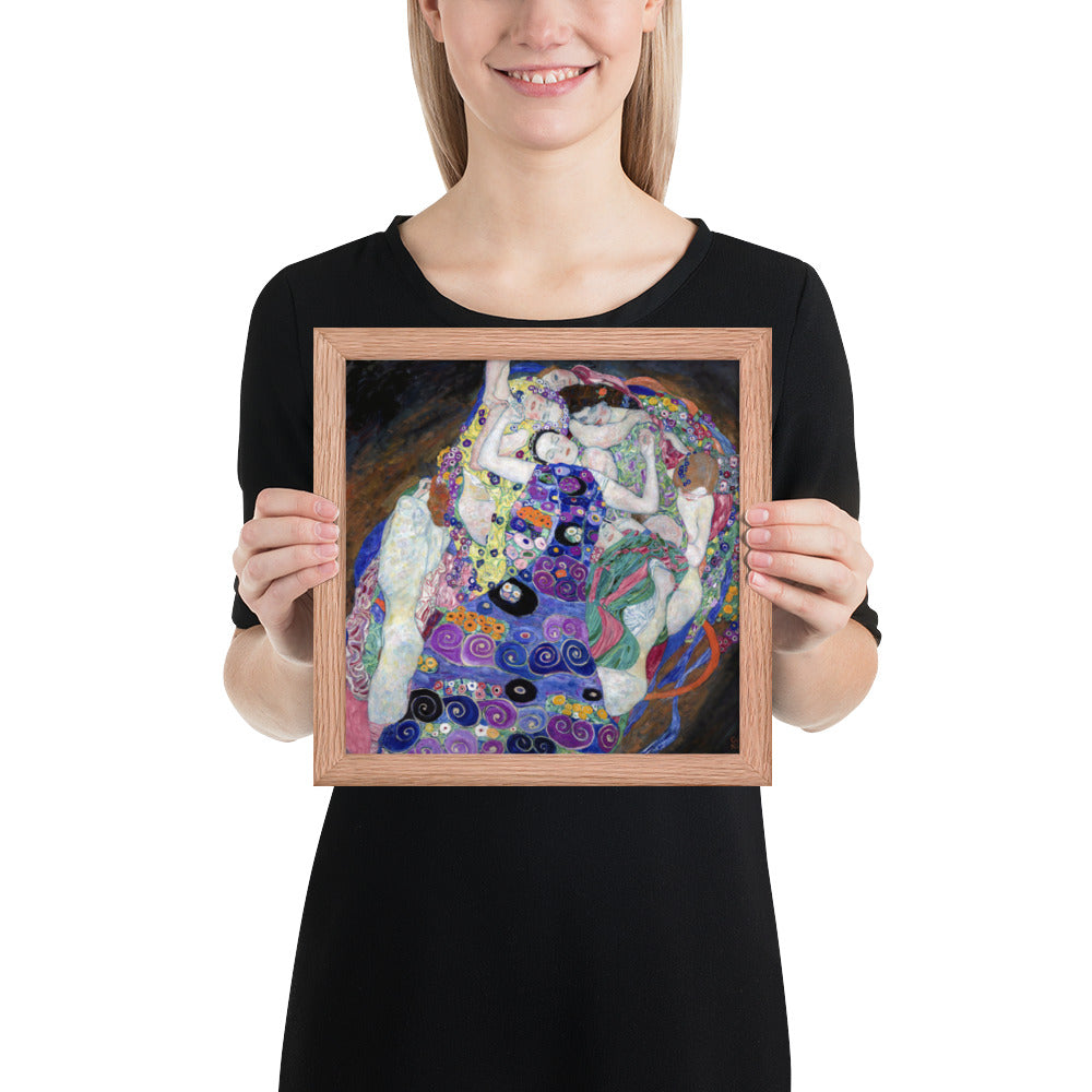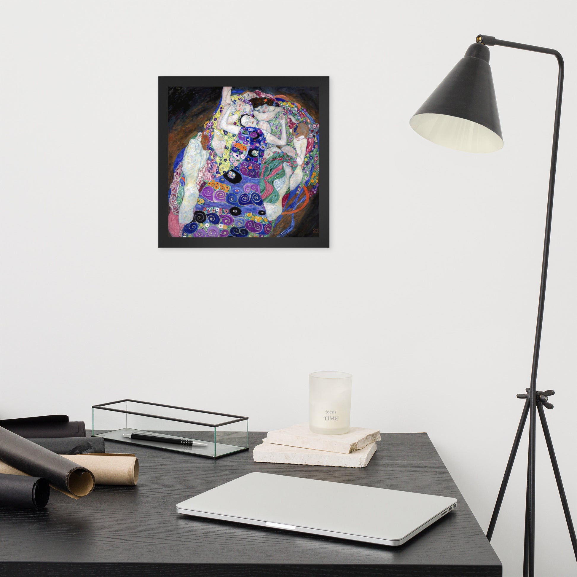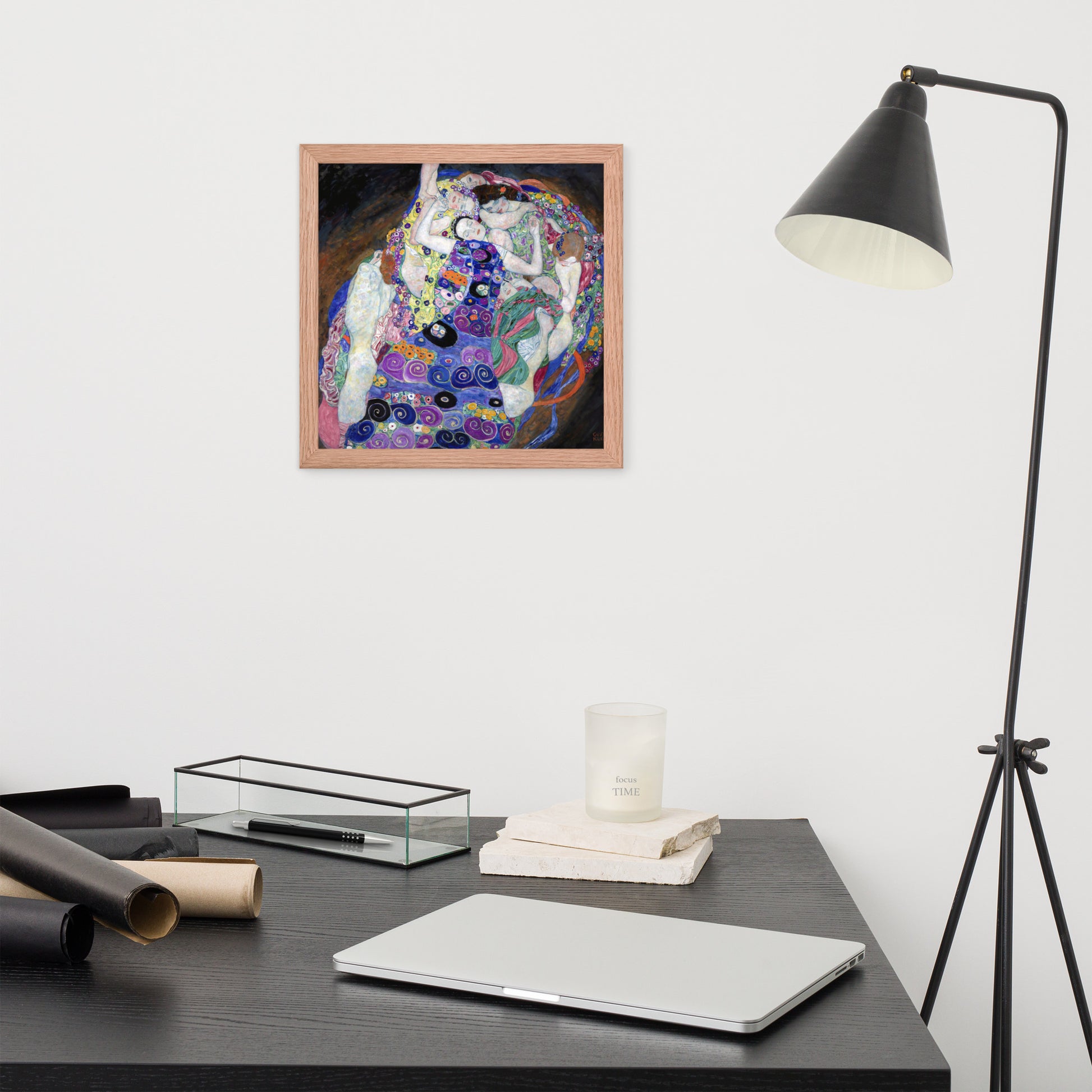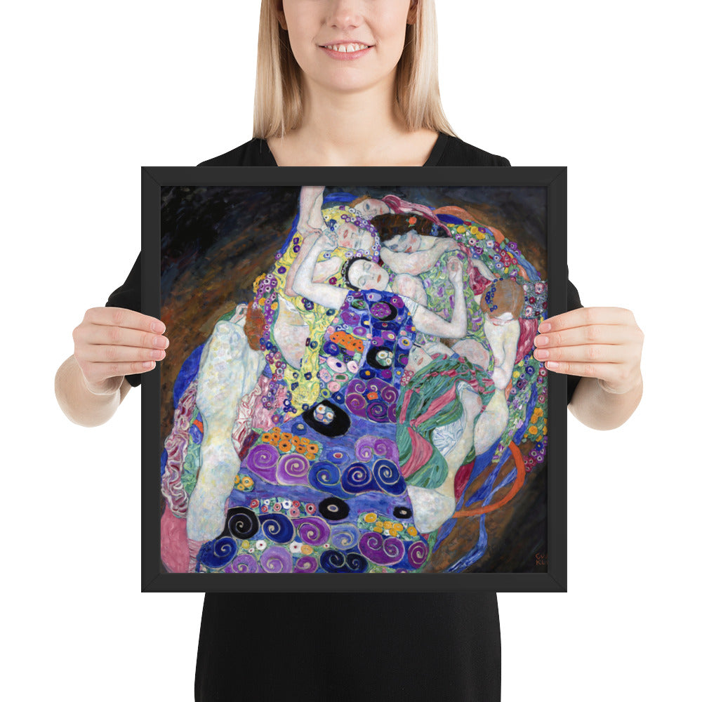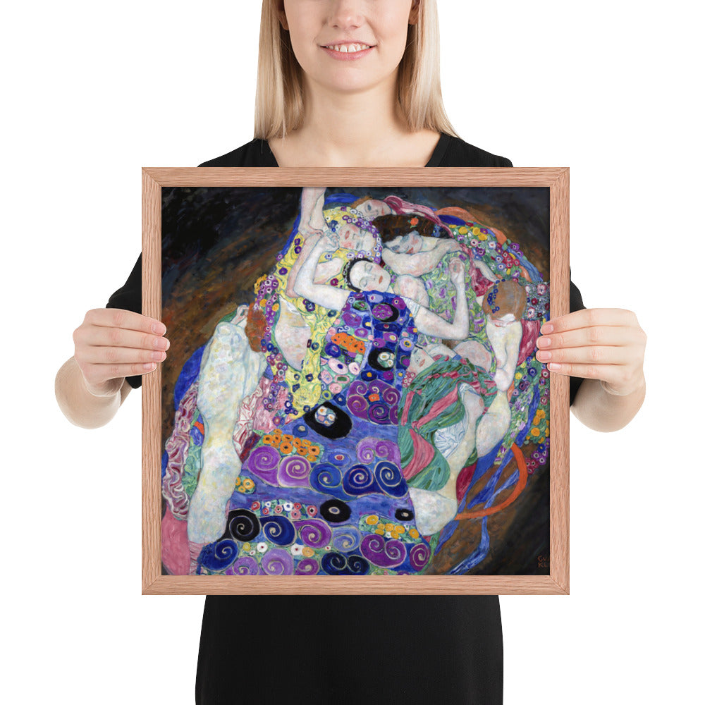 Immerse yourself in the dreamlike symbolism of The Virgin by Gustav Klimt—an Art Nouveau framed wall print that celebrates femininity, sensuality, and the cycle of life. This captivating composition features a cluster of intertwined female figures, arranged in a circular flow that suggests both intimacy and cosmic rhythm. Their garments are a kaleidoscope of swirling motifs, floral accents, and geometric patterns rendered in vivid purples, blues, reds, and golds.