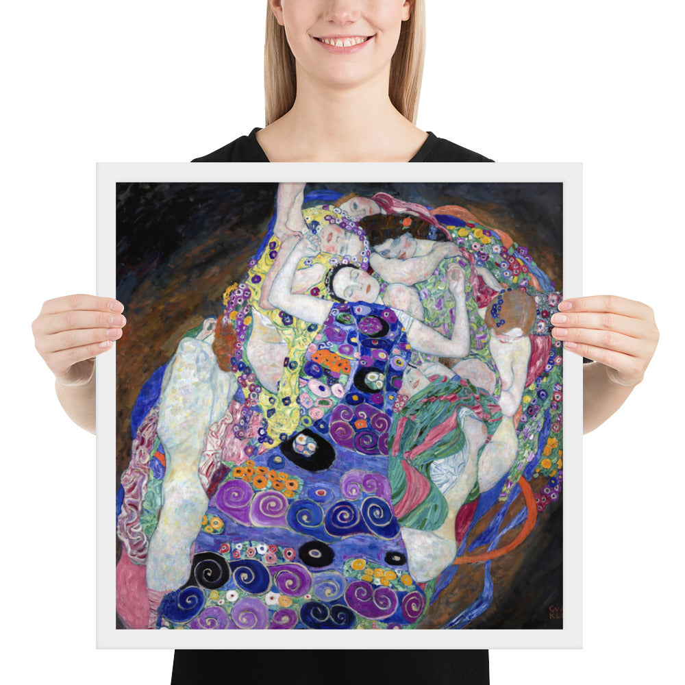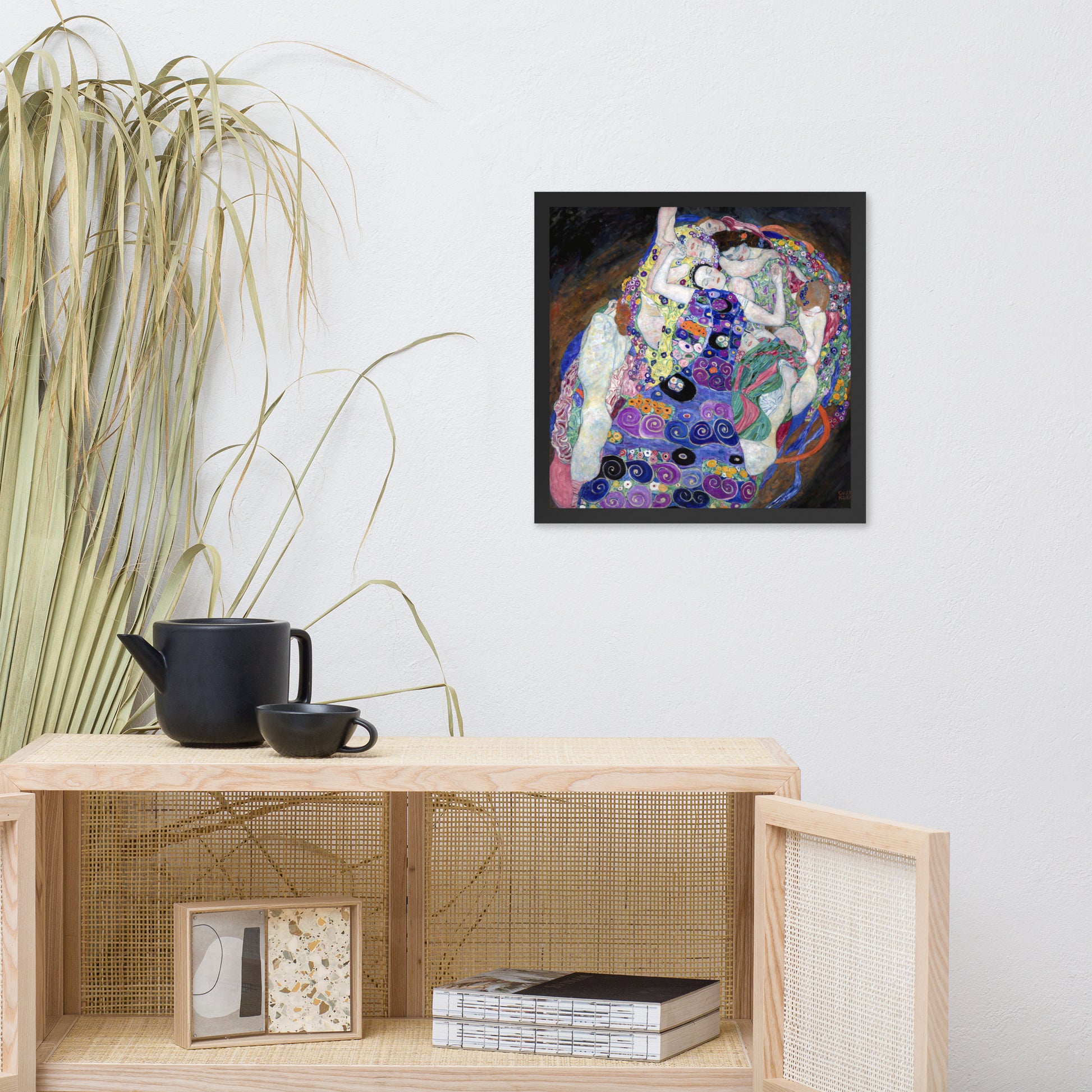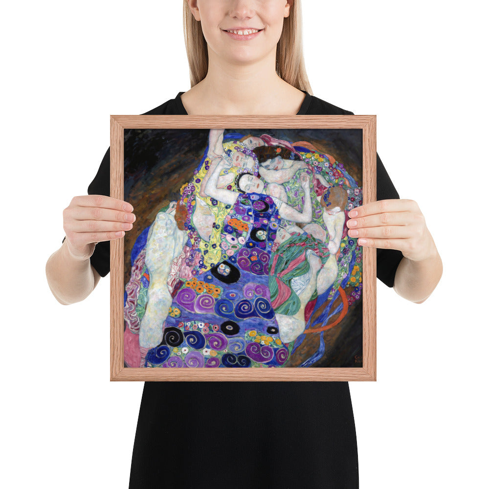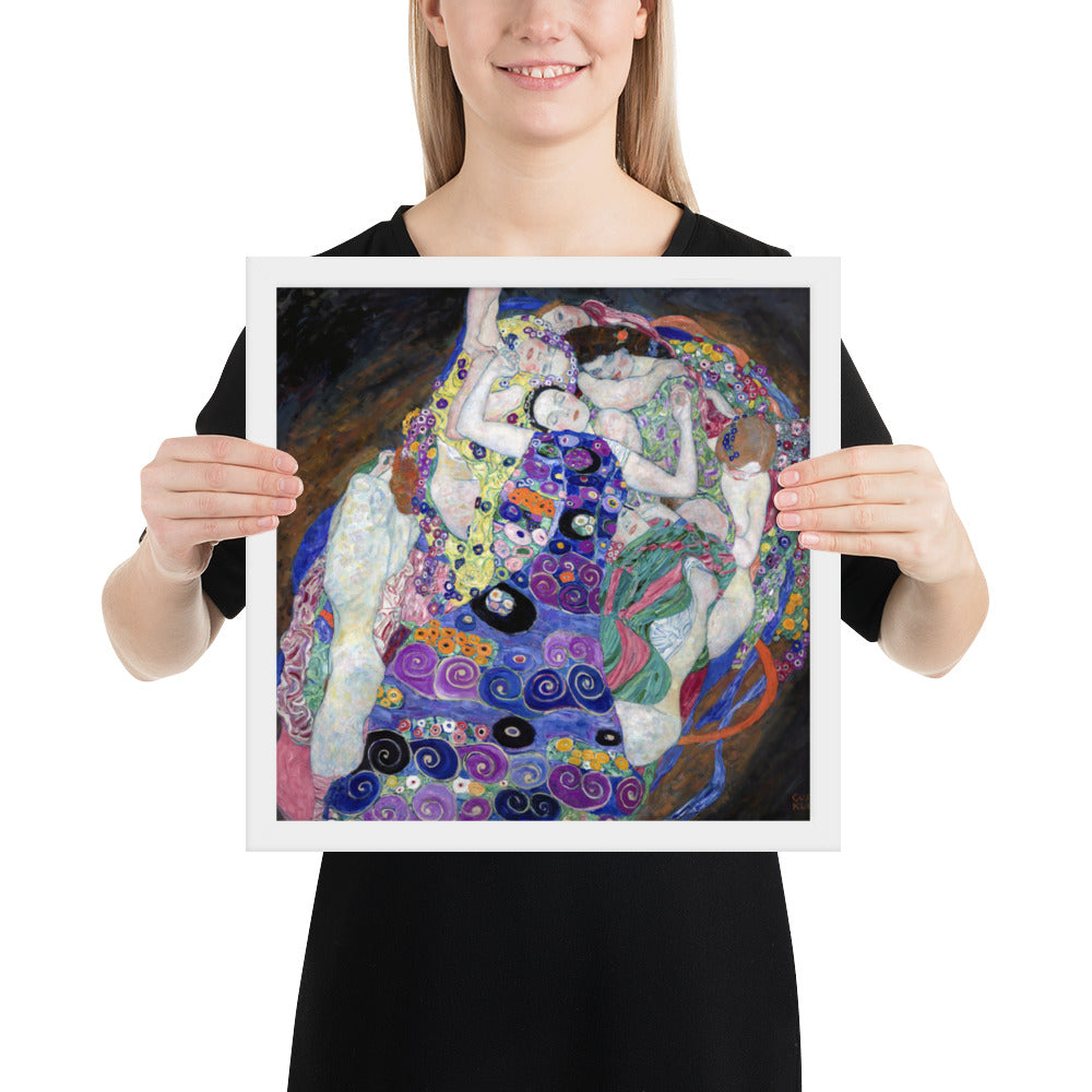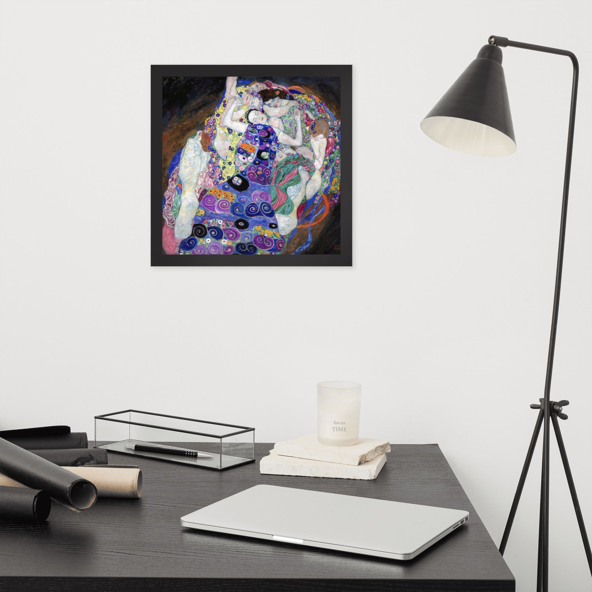 Immerse yourself in the dreamlike symbolism of The Virgin by Gustav Klimt—an Art Nouveau framed wall print that celebrates femininity, sensuality, and the cycle of life. This captivating composition features a cluster of intertwined female figures, arranged in a circular flow that suggests both intimacy and cosmic rhythm. Their garments are a kaleidoscope of swirling motifs, floral accents, and geometric patterns rendered in vivid purples, blues, reds, and golds.