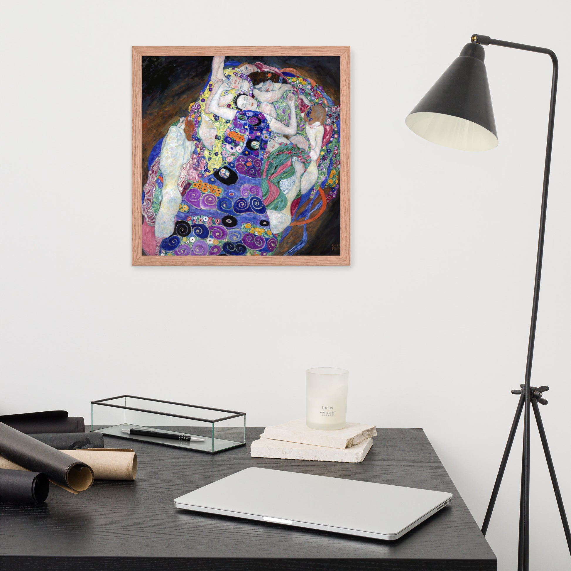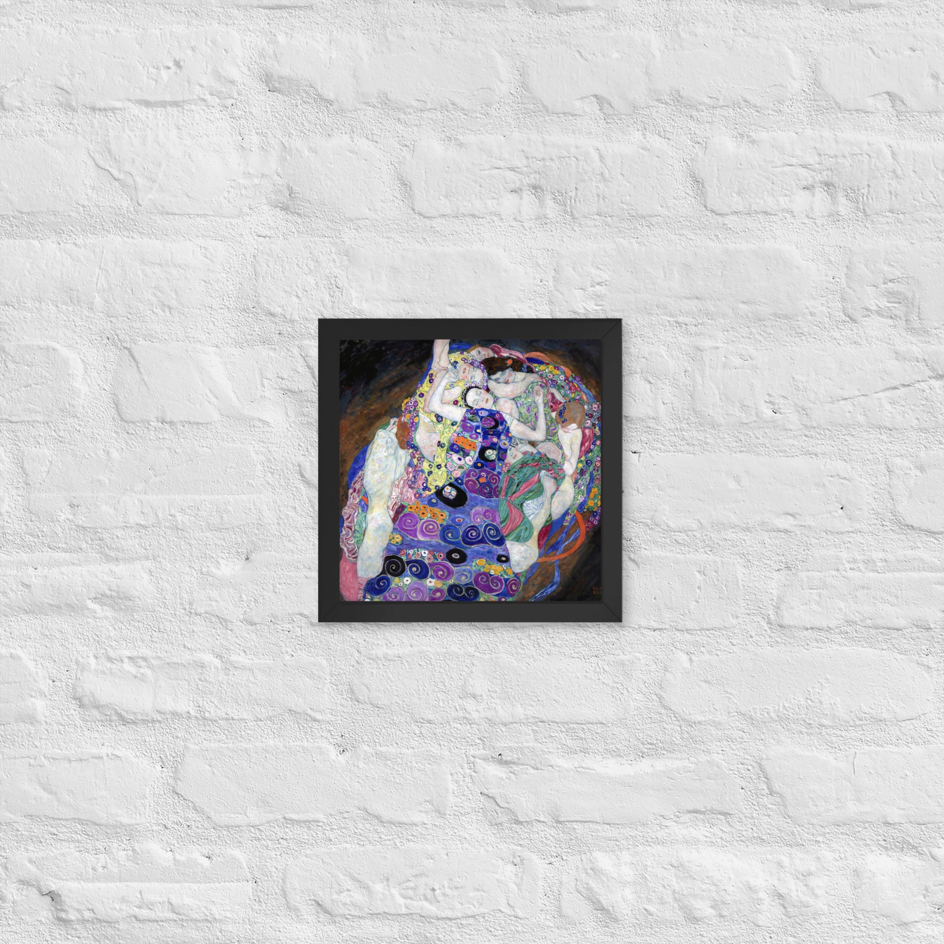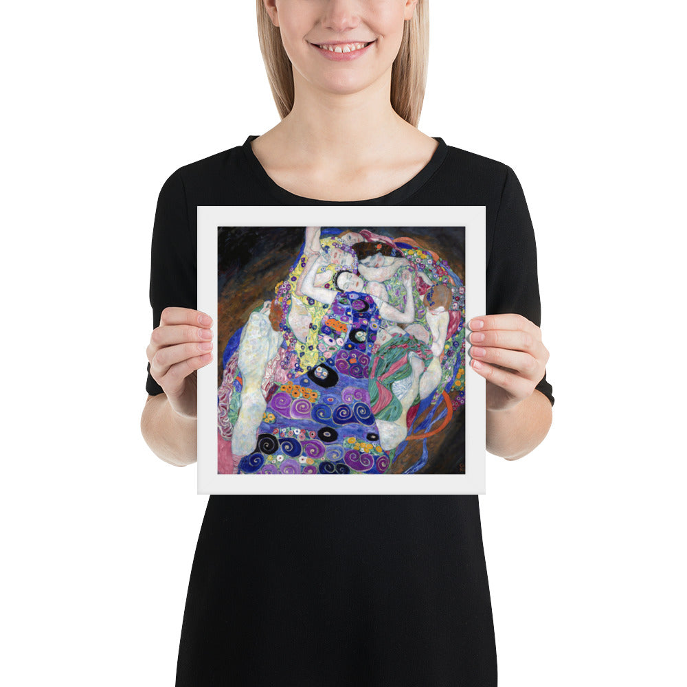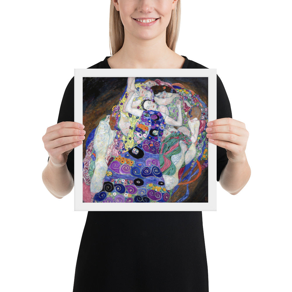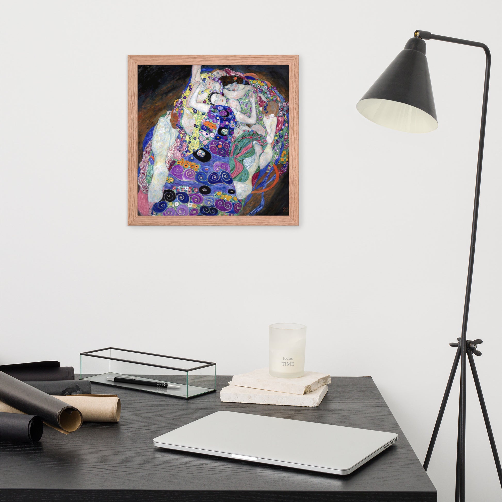 Immerse yourself in the dreamlike symbolism of The Virgin by Gustav Klimt—an Art Nouveau framed wall print that celebrates femininity, sensuality, and the cycle of life. This captivating composition features a cluster of intertwined female figures, arranged in a circular flow that suggests both intimacy and cosmic rhythm. Their garments are a kaleidoscope of swirling motifs, floral accents, and geometric patterns rendered in vivid purples, blues, reds, and golds.