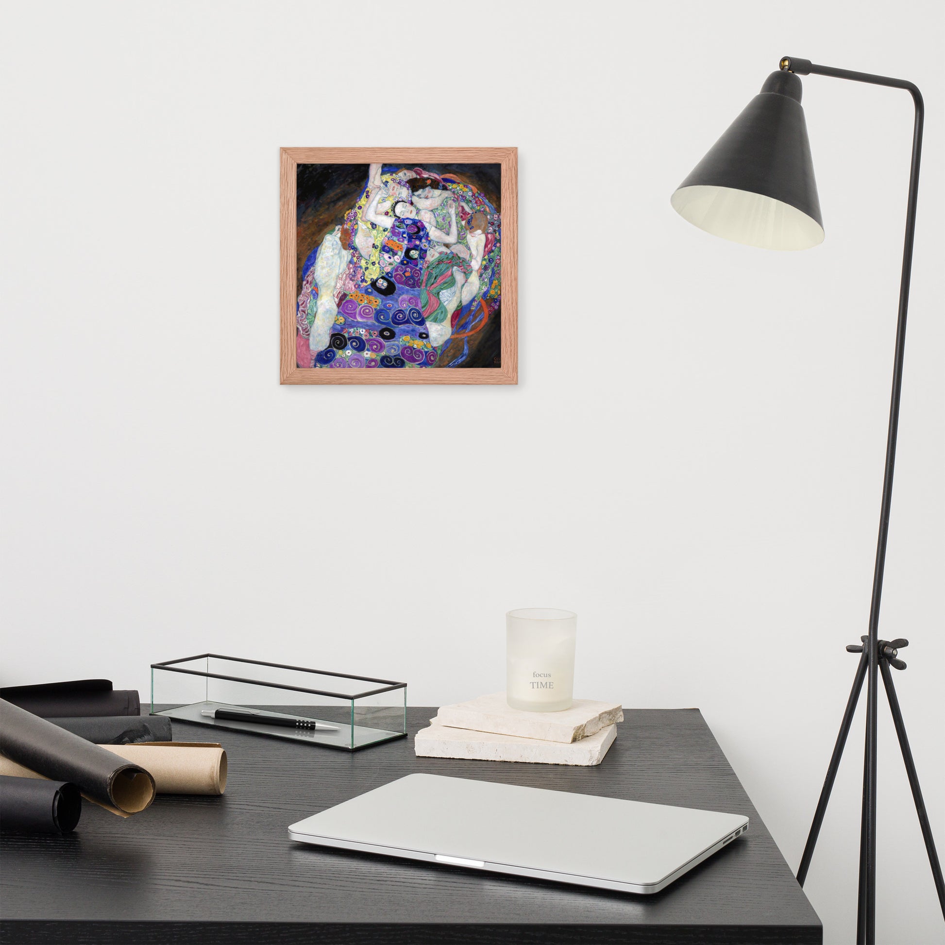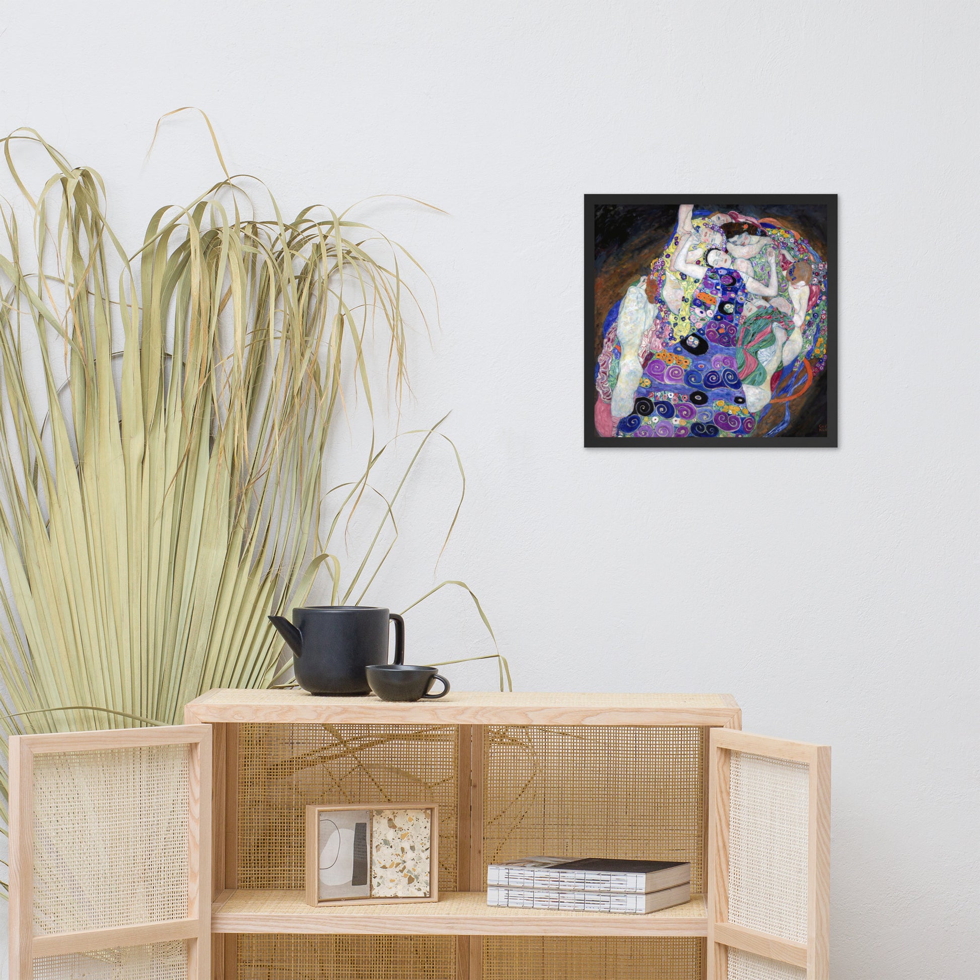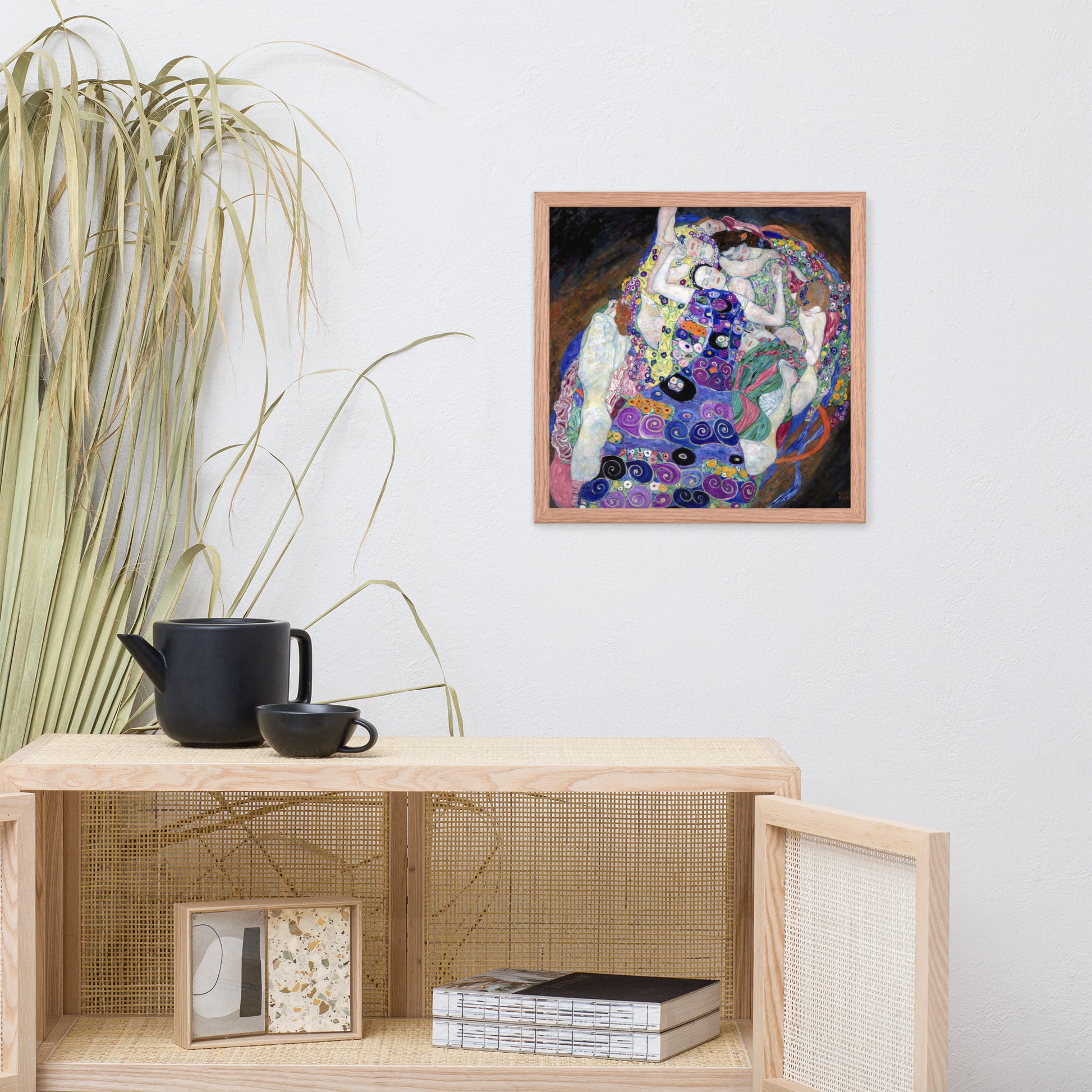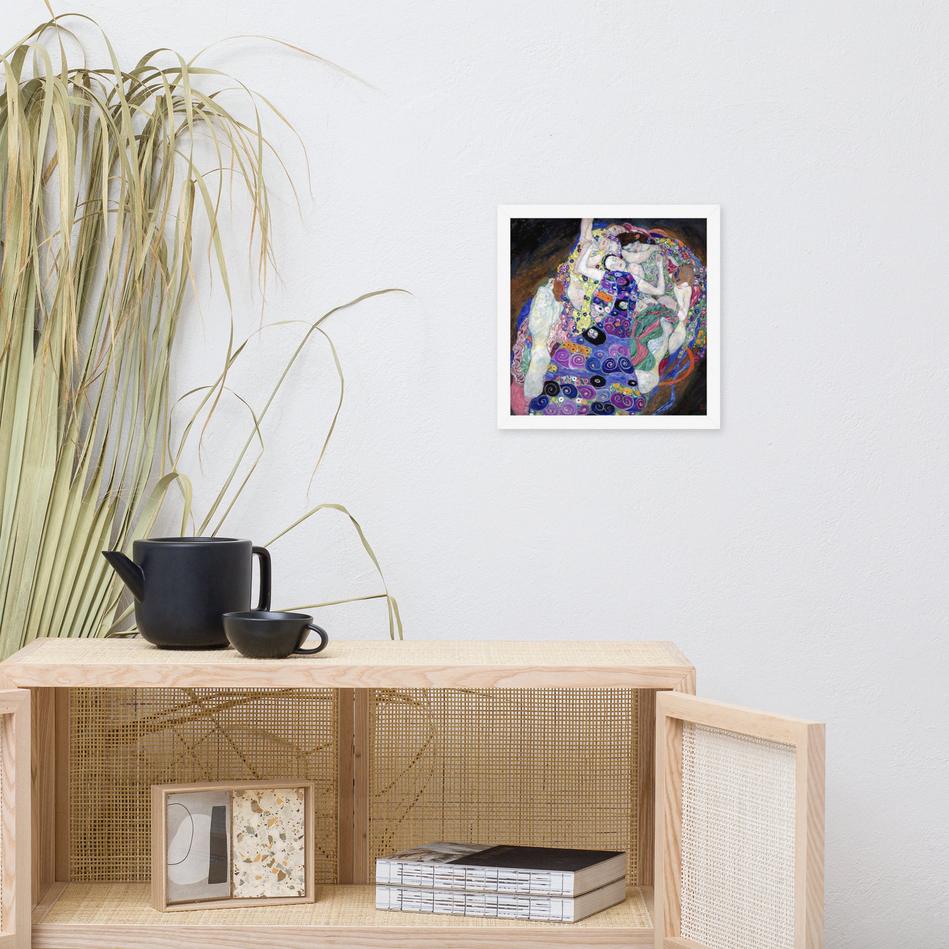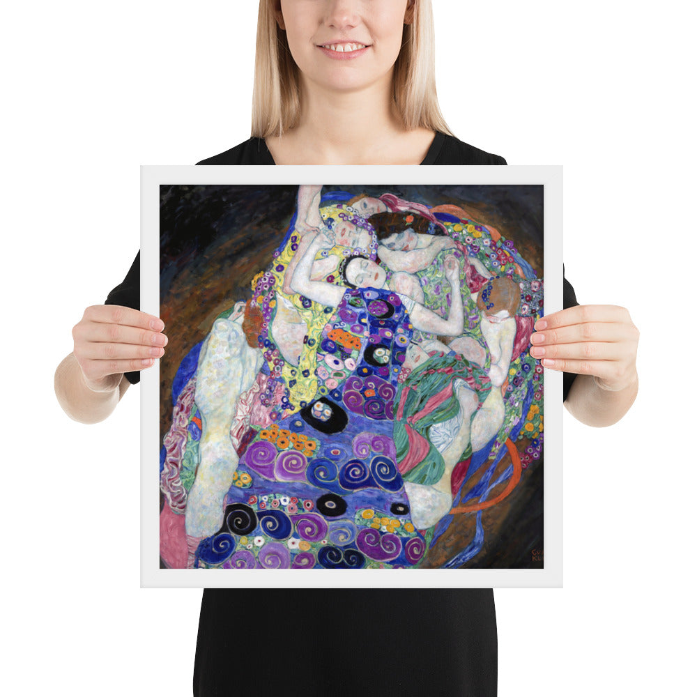 Immerse yourself in the dreamlike symbolism of The Virgin by Gustav Klimt—an Art Nouveau framed wall print that celebrates femininity, sensuality, and the cycle of life. This captivating composition features a cluster of intertwined female figures, arranged in a circular flow that suggests both intimacy and cosmic rhythm. Their garments are a kaleidoscope of swirling motifs, floral accents, and geometric patterns rendered in vivid purples, blues, reds, and golds.