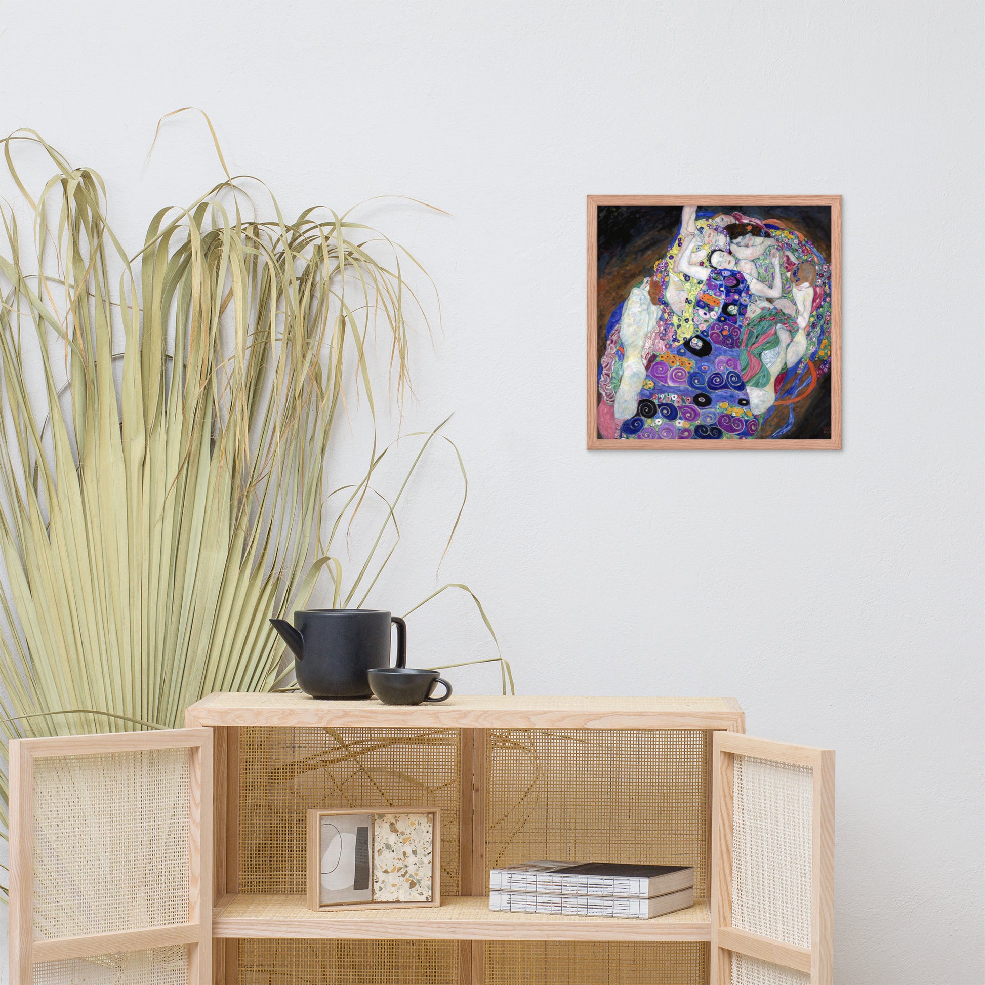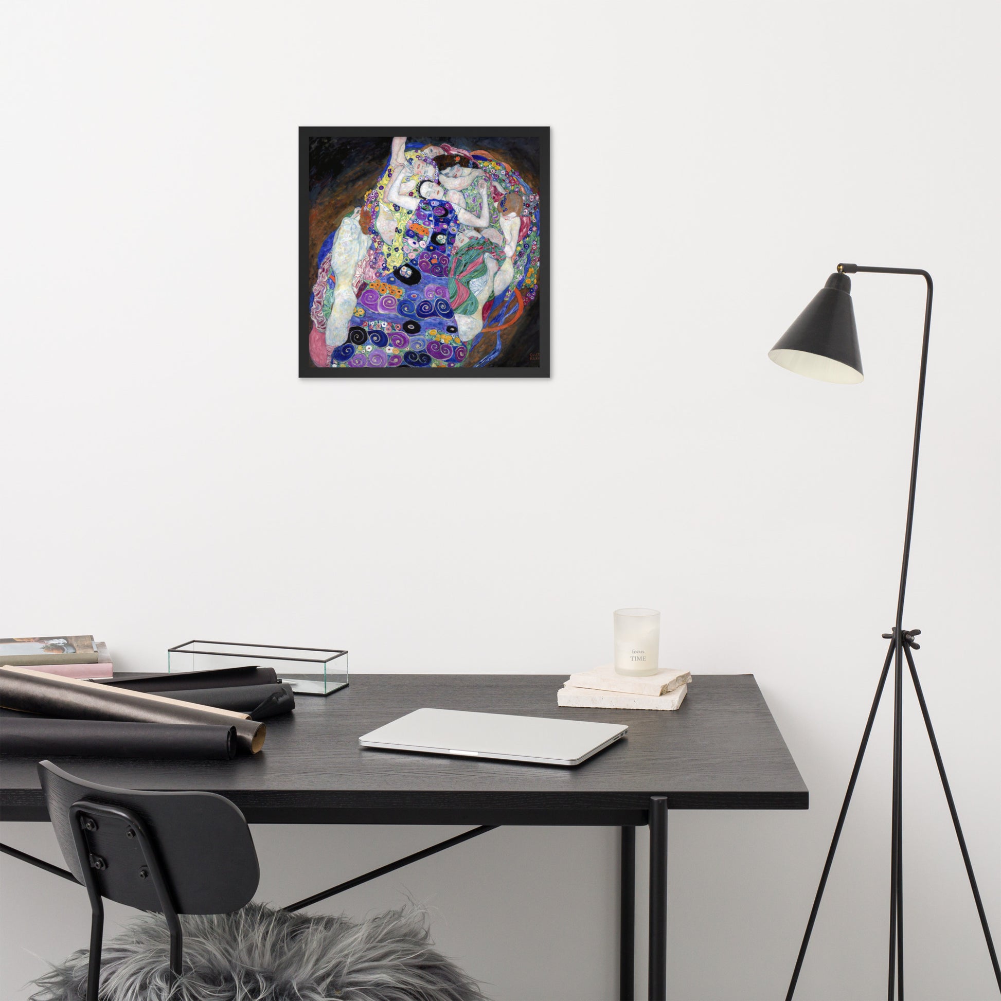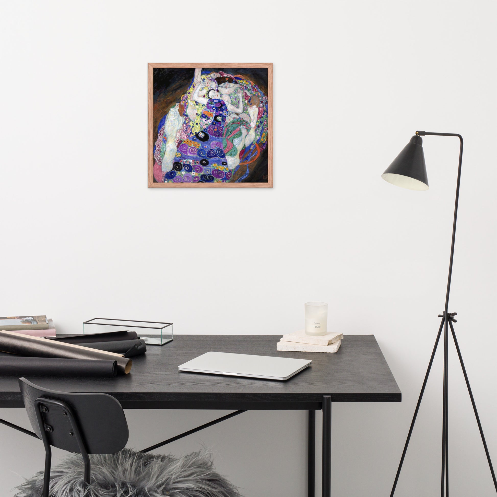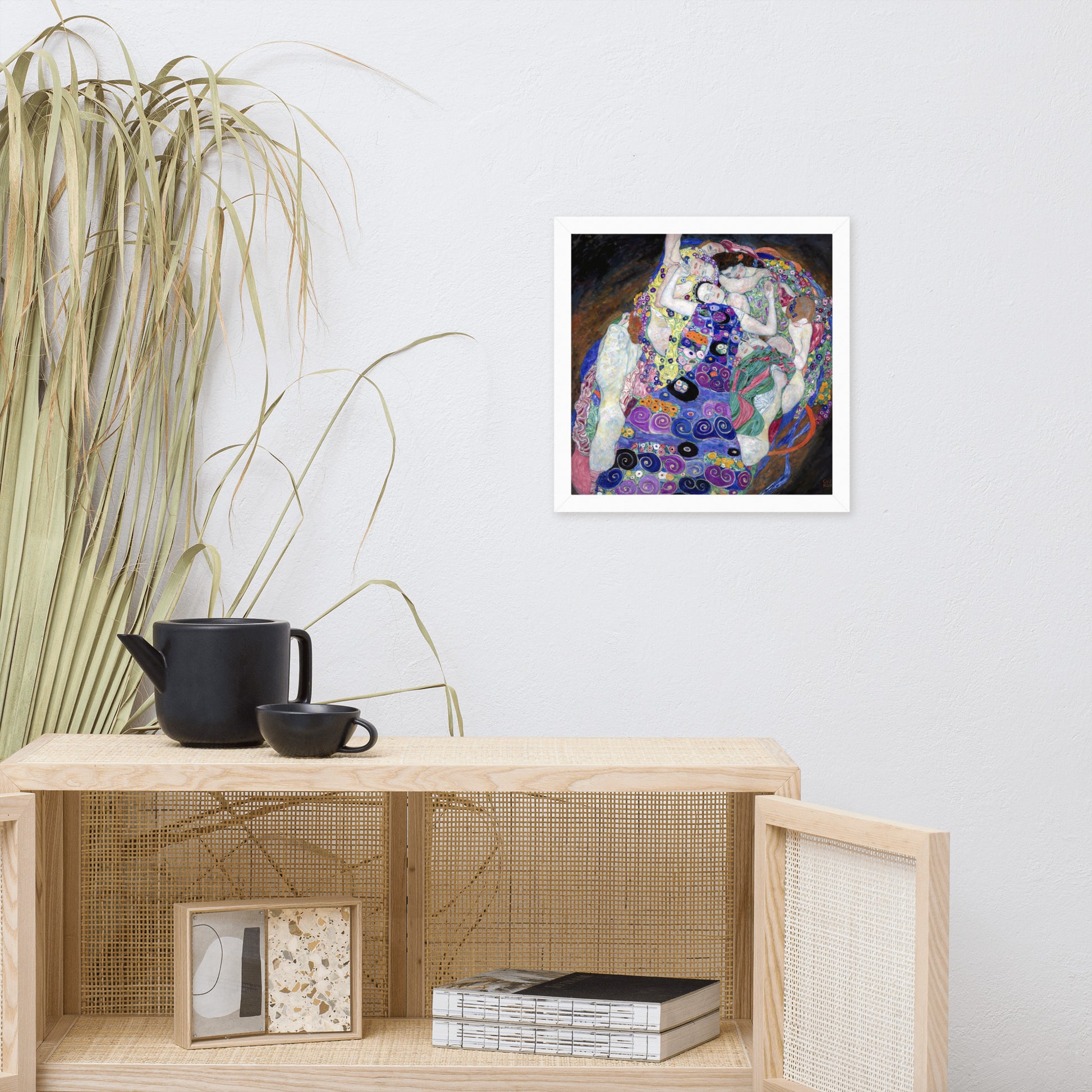 Immerse yourself in the dreamlike symbolism of The Virgin by Gustav Klimt—an Art Nouveau framed wall print that celebrates femininity, sensuality, and the cycle of life. This captivating composition features a cluster of intertwined female figures, arranged in a circular flow that suggests both intimacy and cosmic rhythm. Their garments are a kaleidoscope of swirling motifs, floral accents, and geometric patterns rendered in vivid purples, blues, reds, and golds.