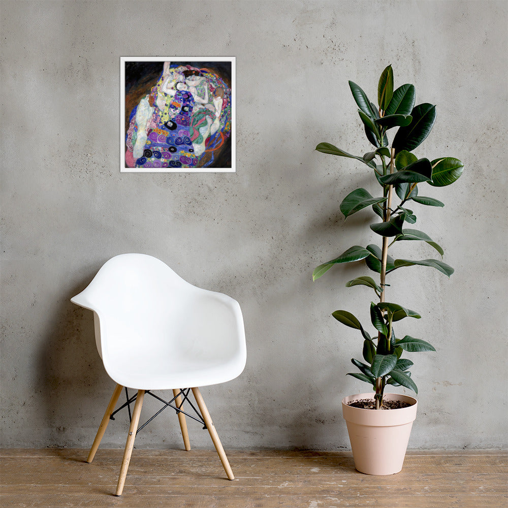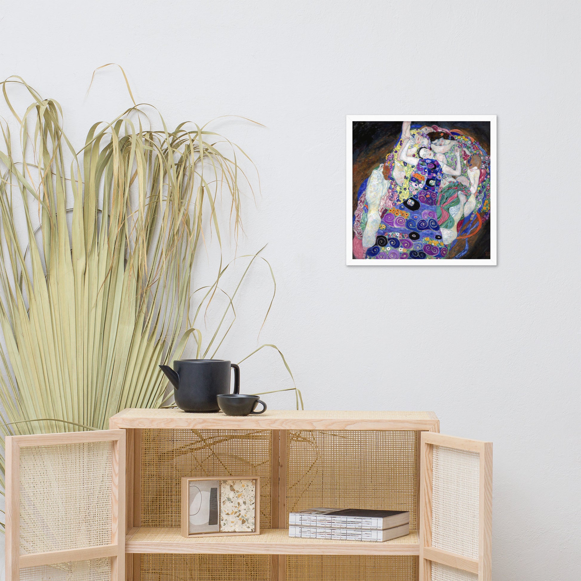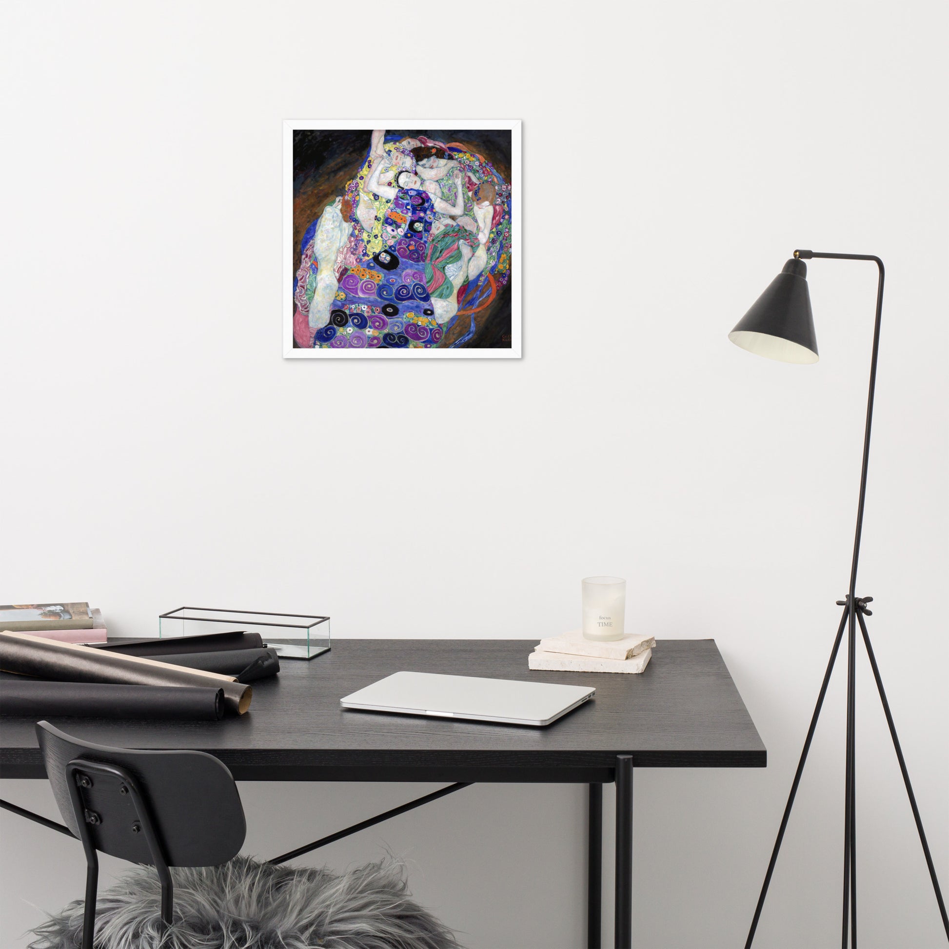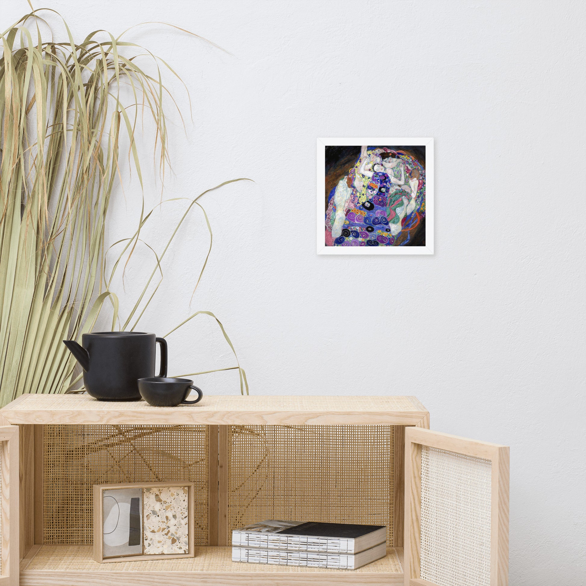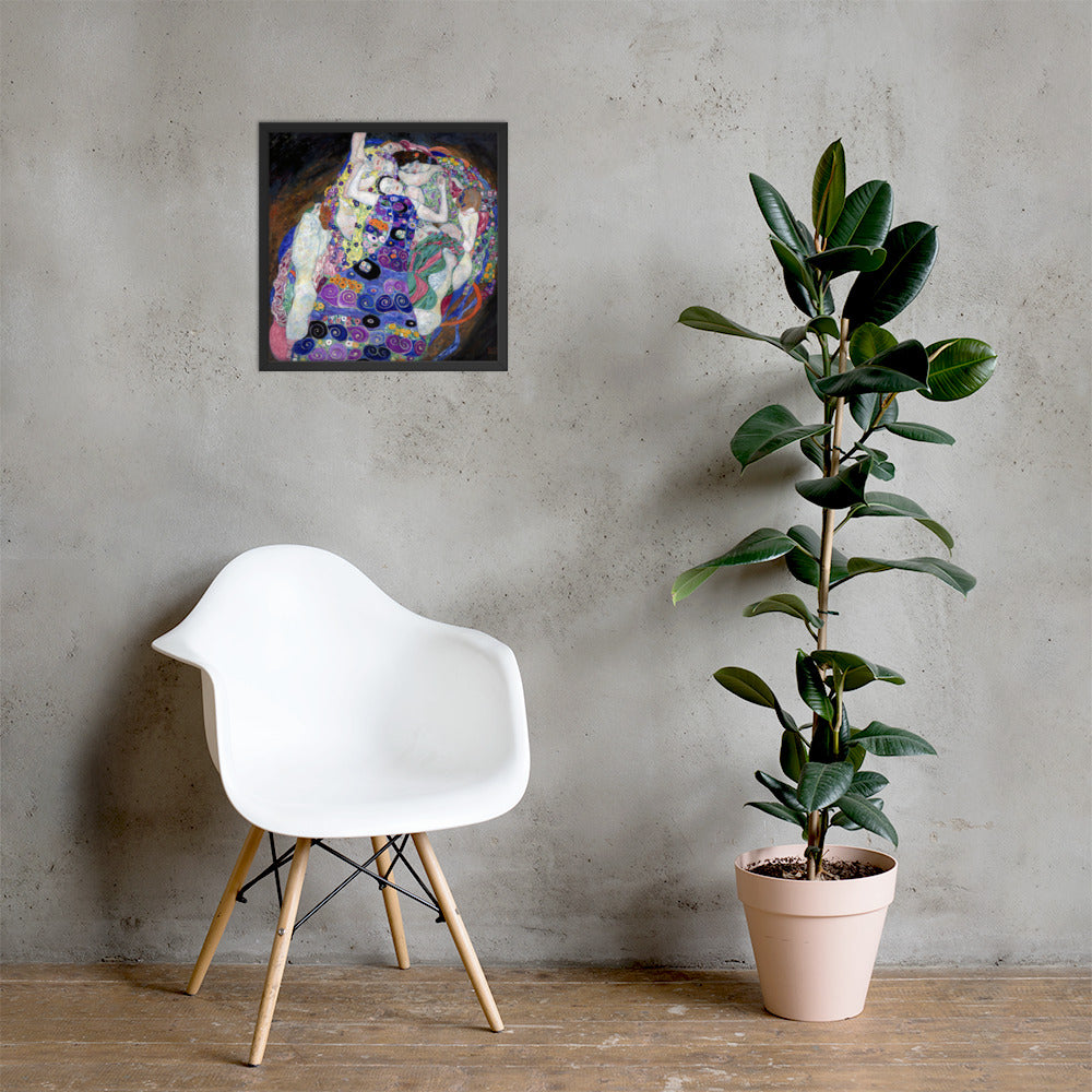 Immerse yourself in the dreamlike symbolism of The Virgin by Gustav Klimt—an Art Nouveau framed wall print that celebrates femininity, sensuality, and the cycle of life. This captivating composition features a cluster of intertwined female figures, arranged in a circular flow that suggests both intimacy and cosmic rhythm. Their garments are a kaleidoscope of swirling motifs, floral accents, and geometric patterns rendered in vivid purples, blues, reds, and golds.