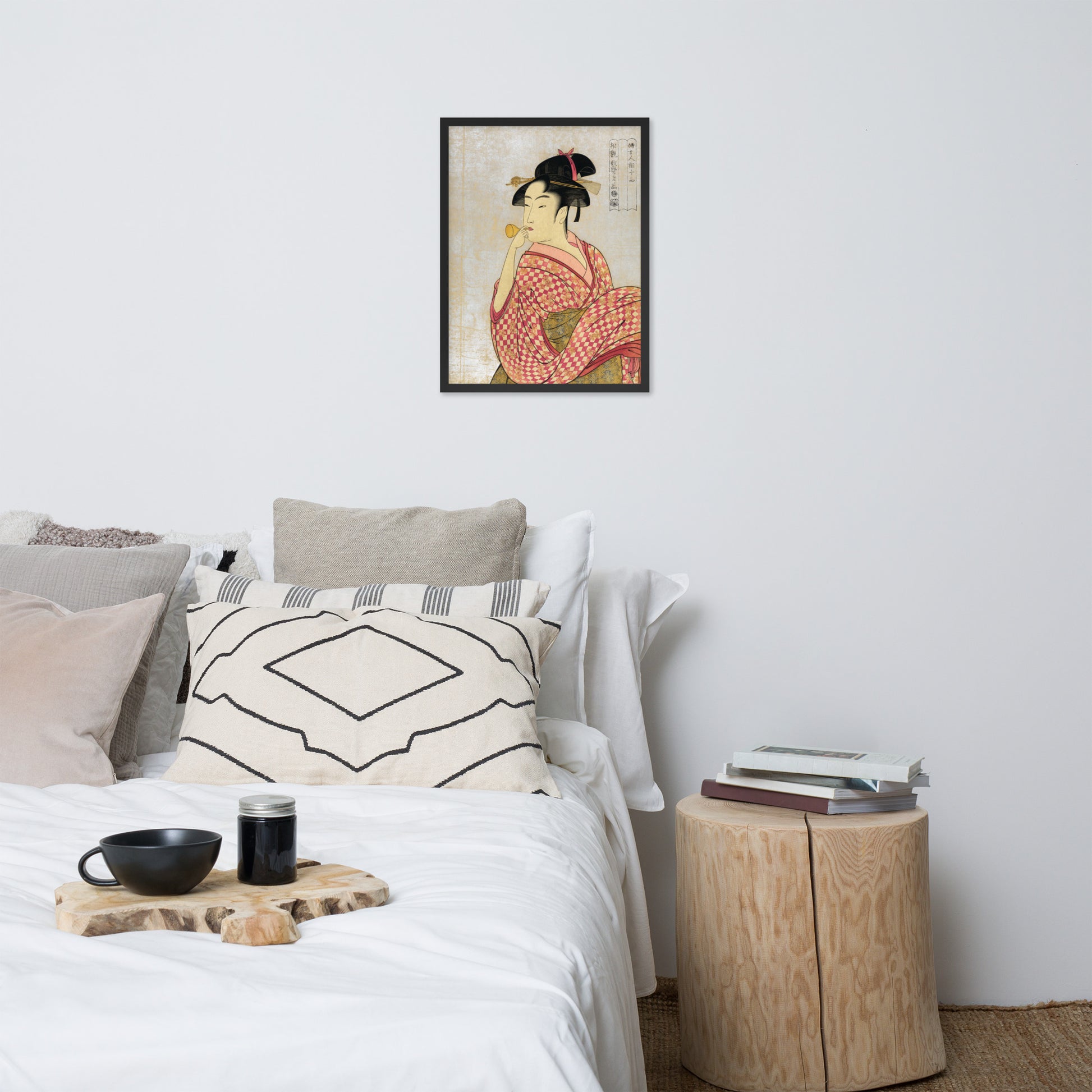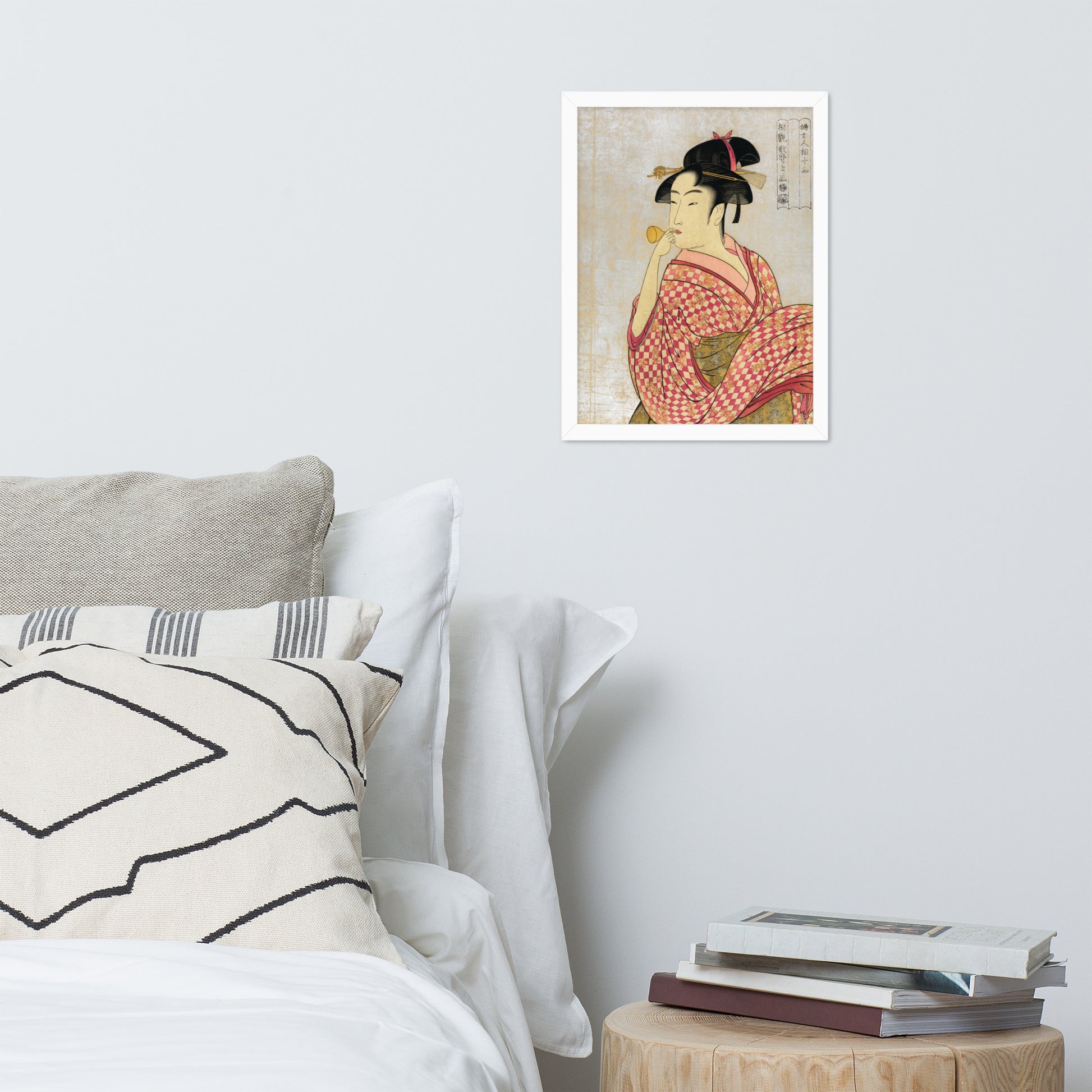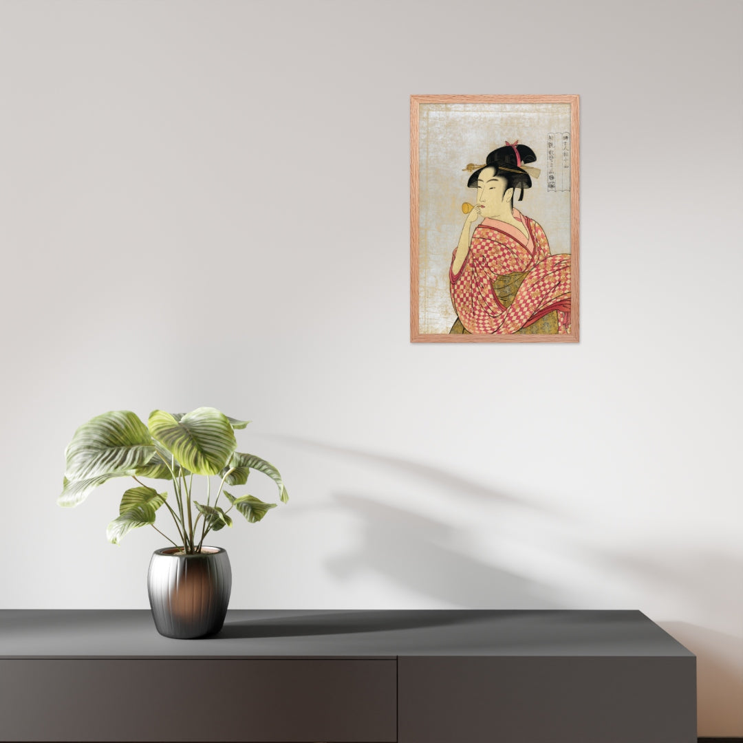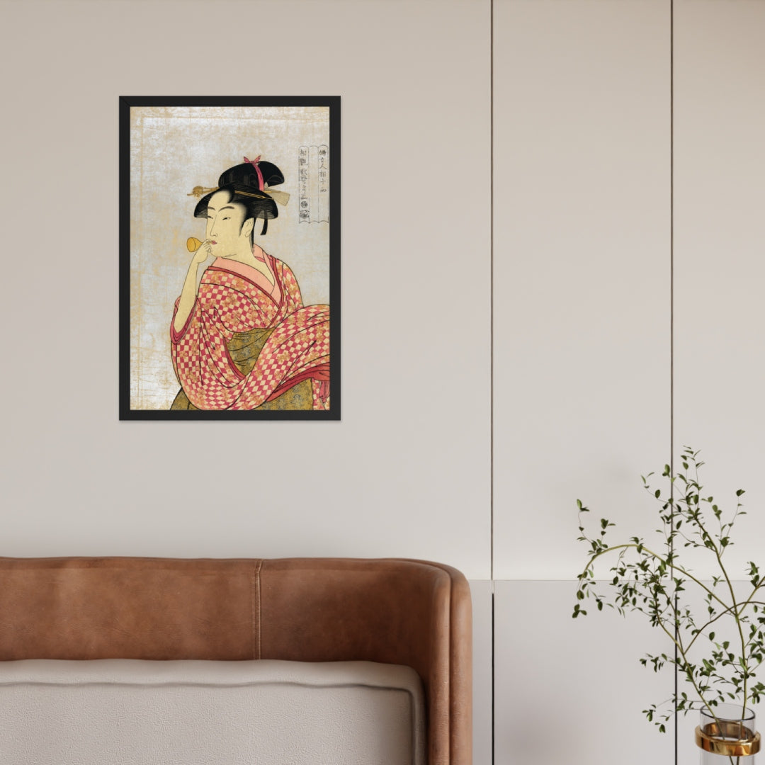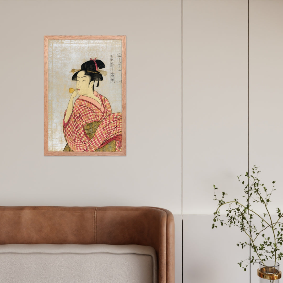 Elevate your space with Young Lady Blowing on a Poppin by Kitagawa Utamaro, a captivating example of Japanese Woodblock Prints (Ukiyo-e). This framed artwork features a graceful young woman in a striking red and cream checkered kimono, delicately blowing on a poppin—a traditional glass toy that evokes playful charm and fleeting beauty. Her ornate hairstyle, adorned with hairpins and a crimson ribbon, reflects the refined fashion of Edo-period courtesans. The textured neutral background adds a timeless patina, enhancing the vintage allure of the piece.