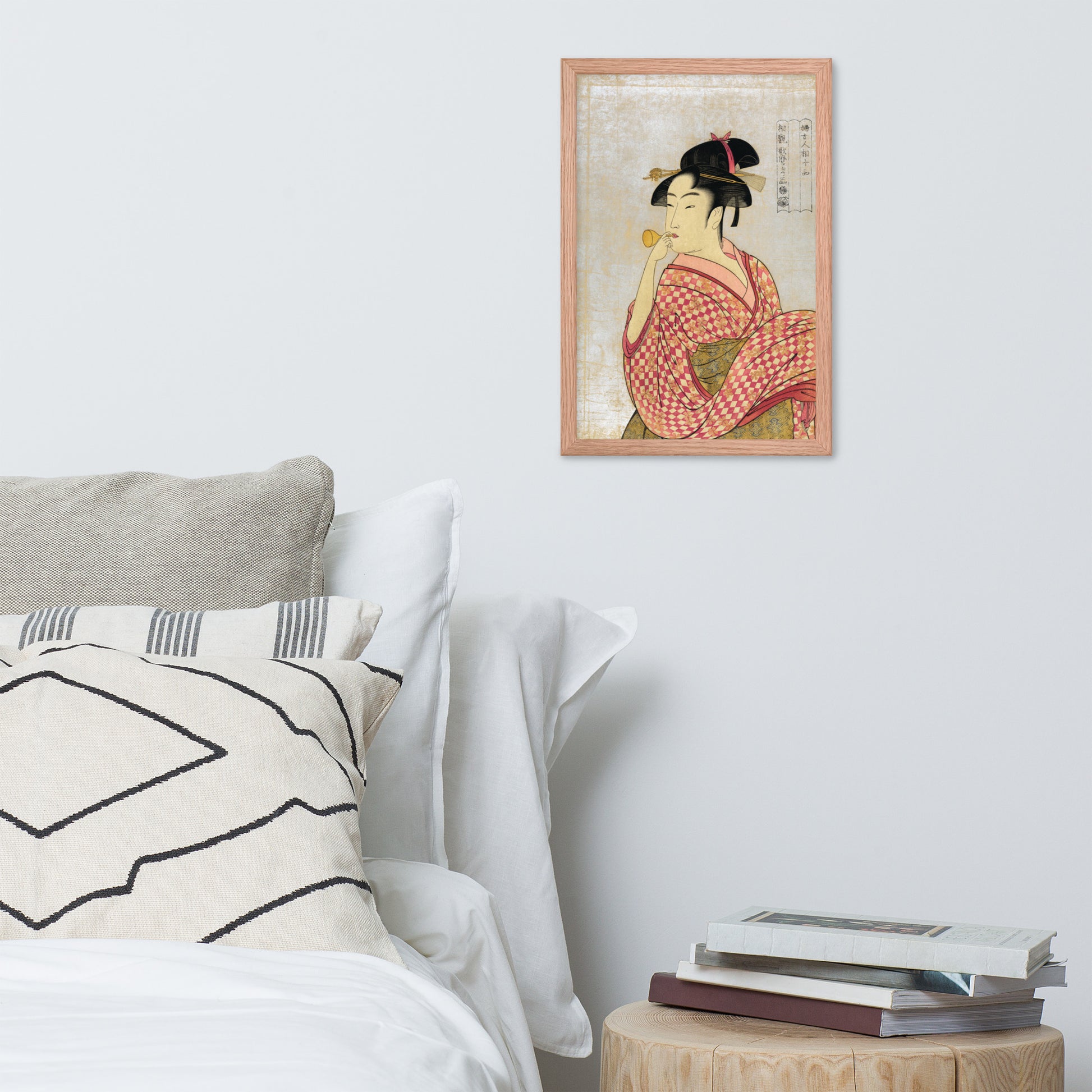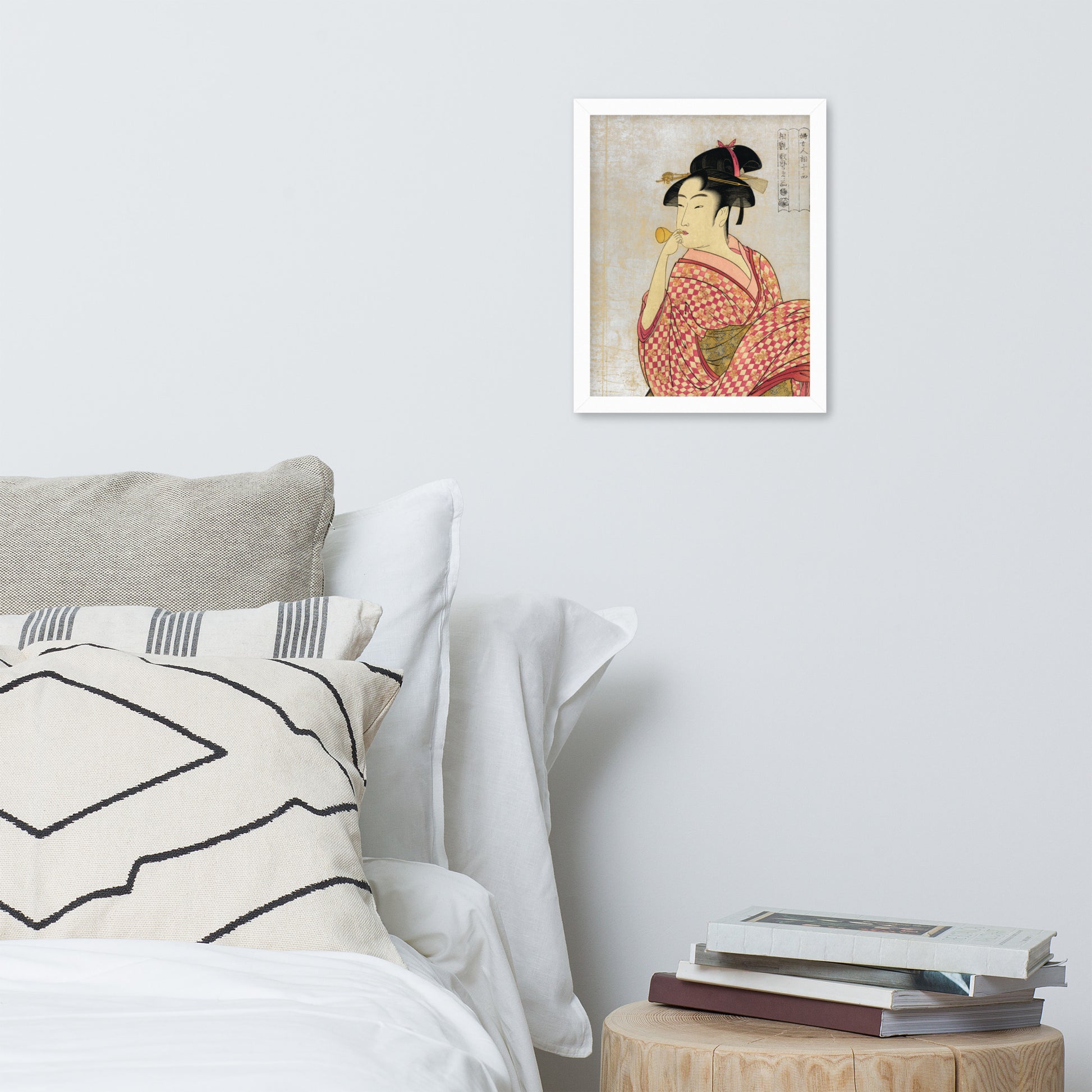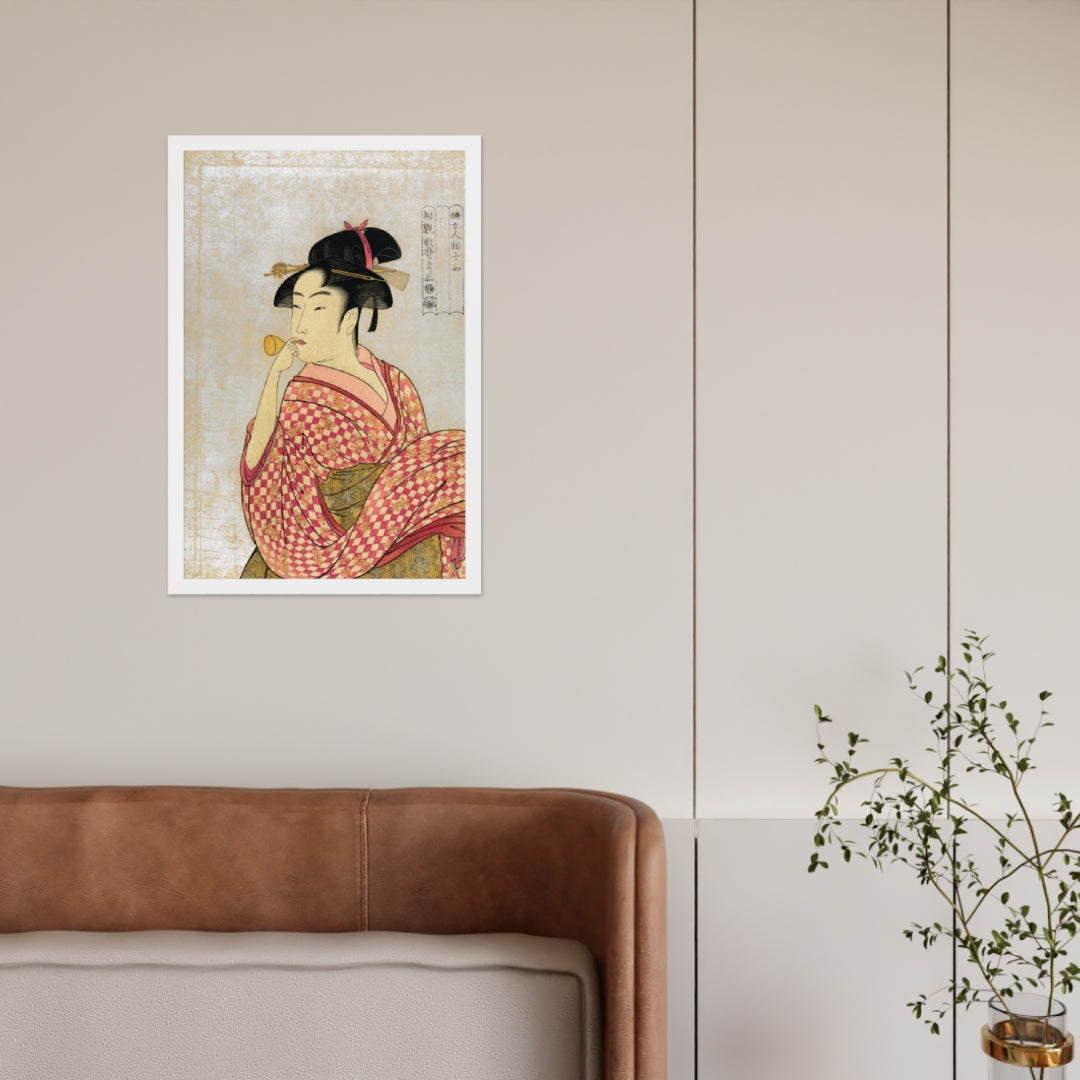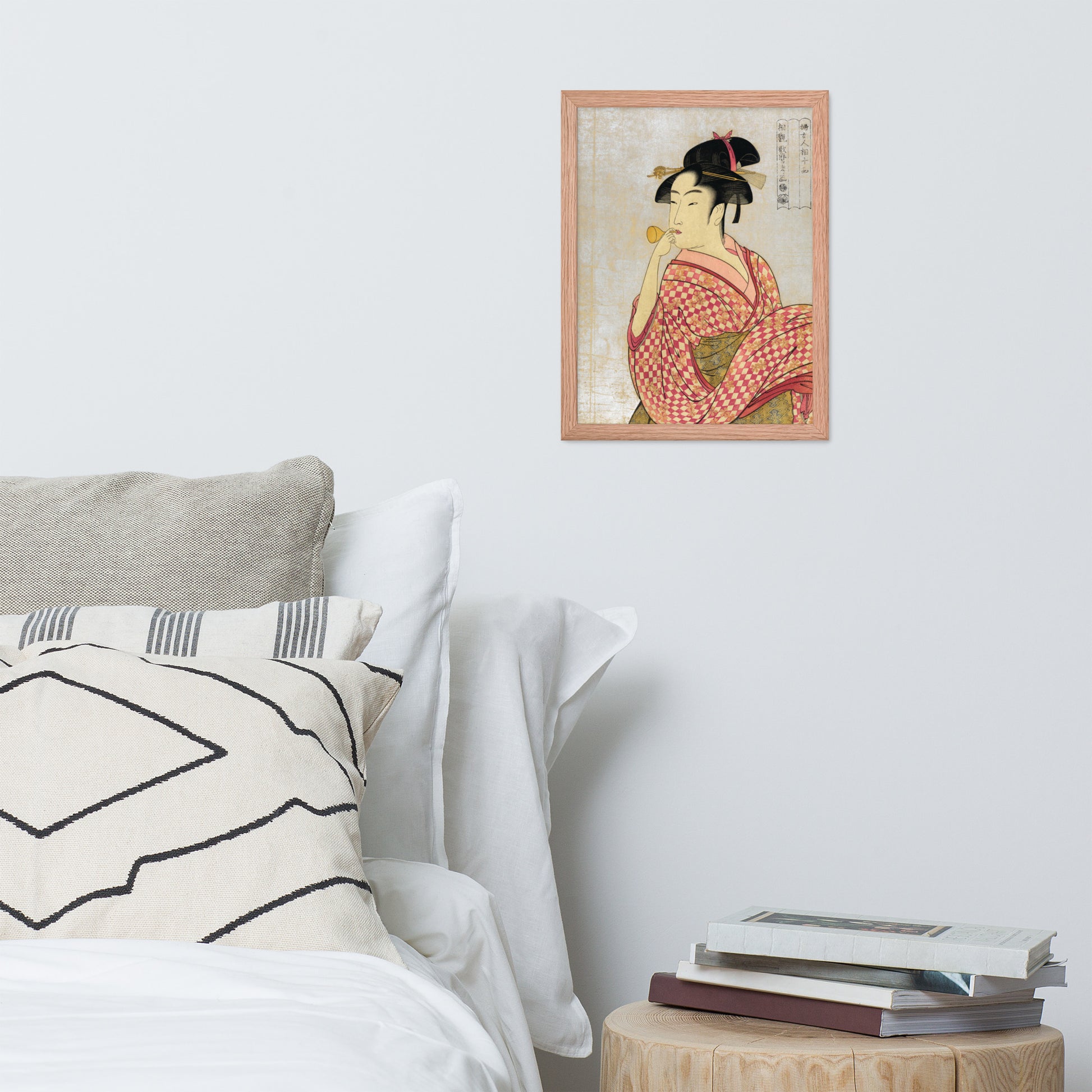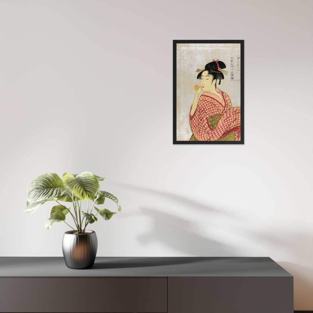 Elevate your space with Young Lady Blowing on a Poppin by Kitagawa Utamaro, a captivating example of Japanese Woodblock Prints (Ukiyo-e). This framed artwork features a graceful young woman in a striking red and cream checkered kimono, delicately blowing on a poppin—a traditional glass toy that evokes playful charm and fleeting beauty. Her ornate hairstyle, adorned with hairpins and a crimson ribbon, reflects the refined fashion of Edo-period courtesans. The textured neutral background adds a timeless patina, enhancing the vintage allure of the piece.