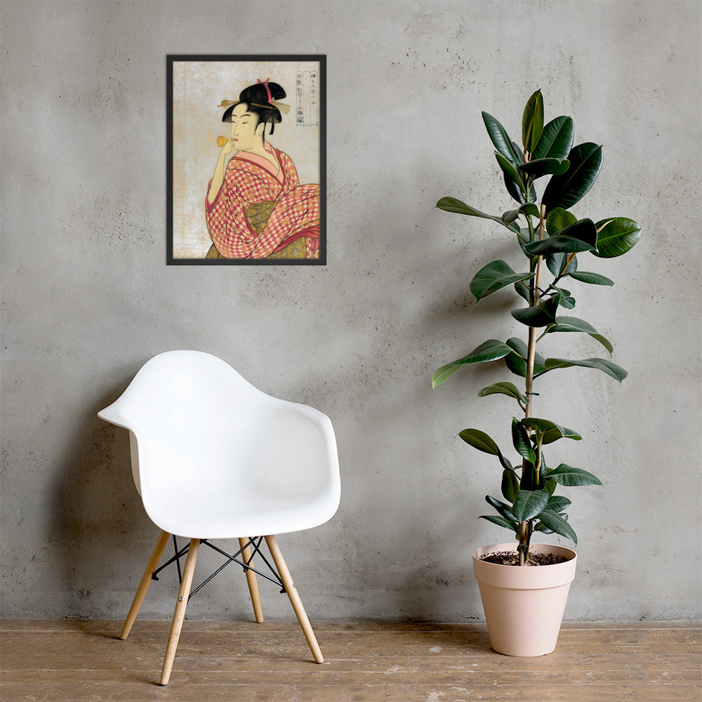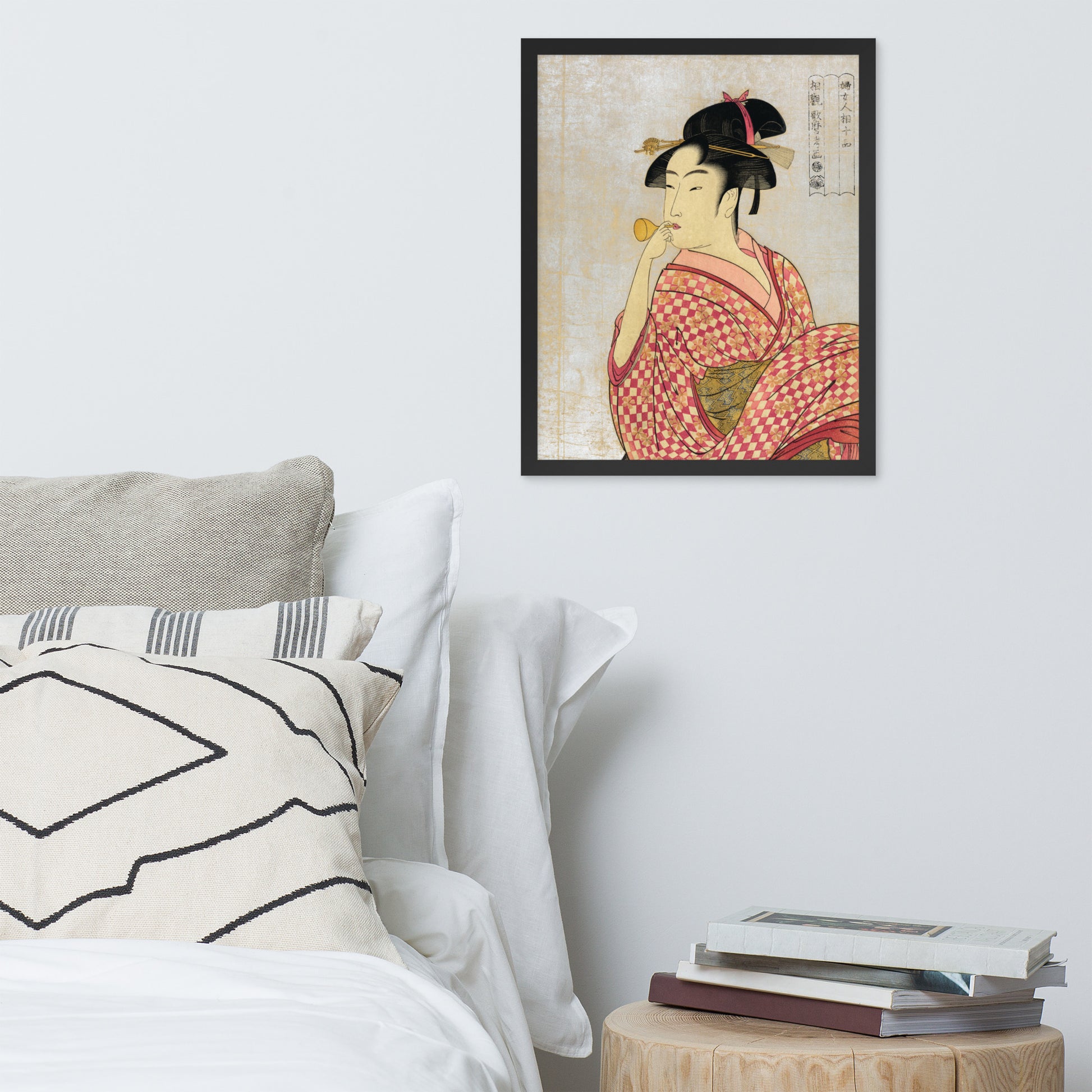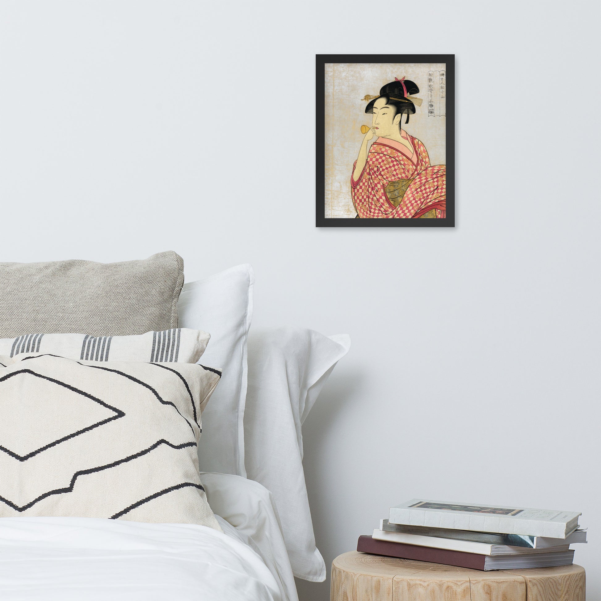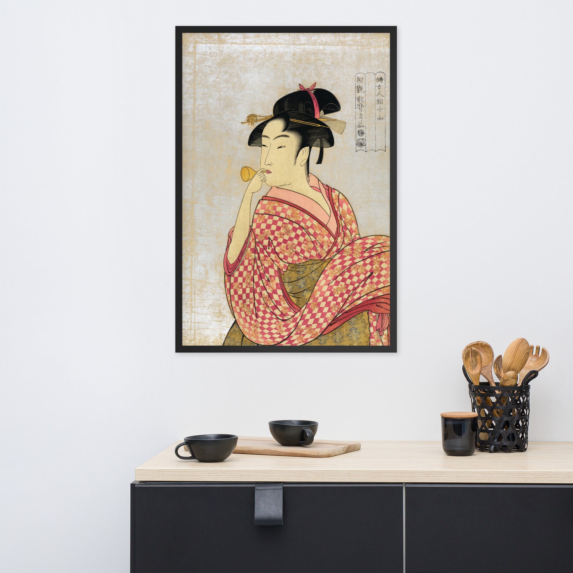 Elevate your space with Young Lady Blowing on a Poppin by Kitagawa Utamaro, a captivating example of Japanese Woodblock Prints (Ukiyo-e). This framed artwork features a graceful young woman in a striking red and cream checkered kimono, delicately blowing on a poppin—a traditional glass toy that evokes playful charm and fleeting beauty. Her ornate hairstyle, adorned with hairpins and a crimson ribbon, reflects the refined fashion of Edo-period courtesans. The textured neutral background adds a timeless patina, enhancing the vintage allure of the piece.