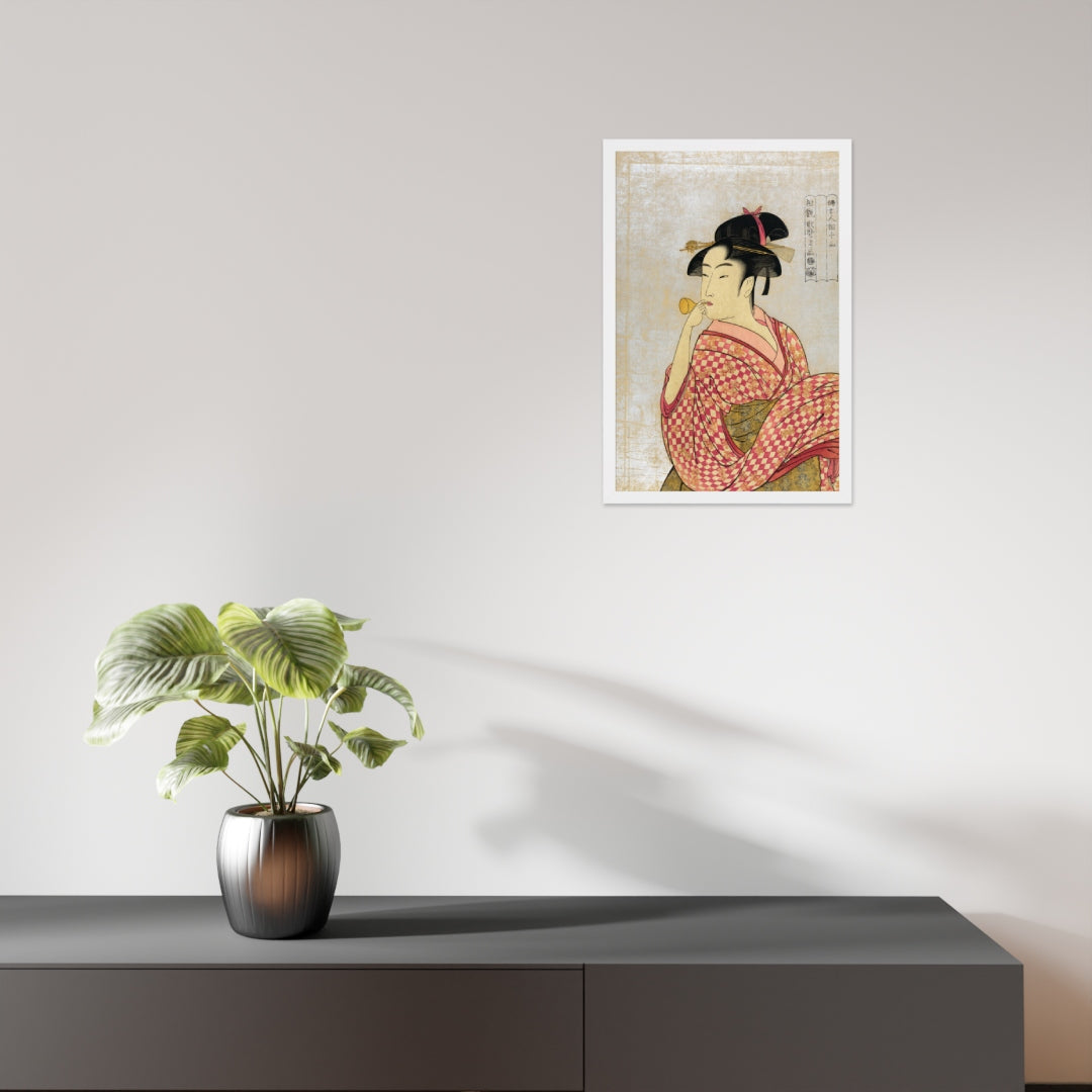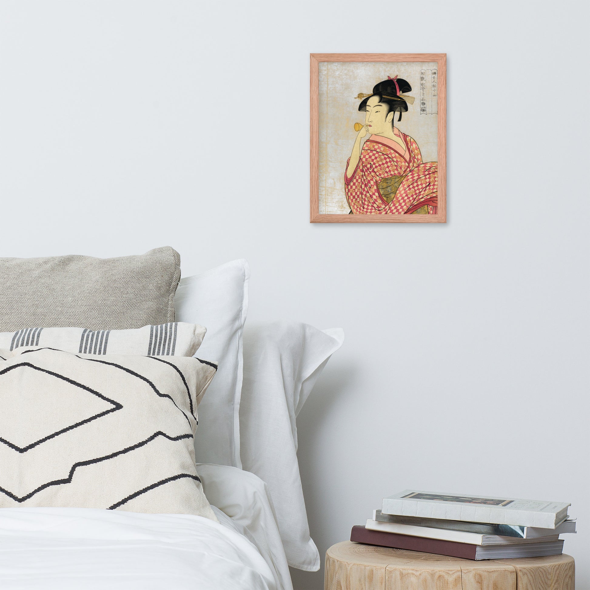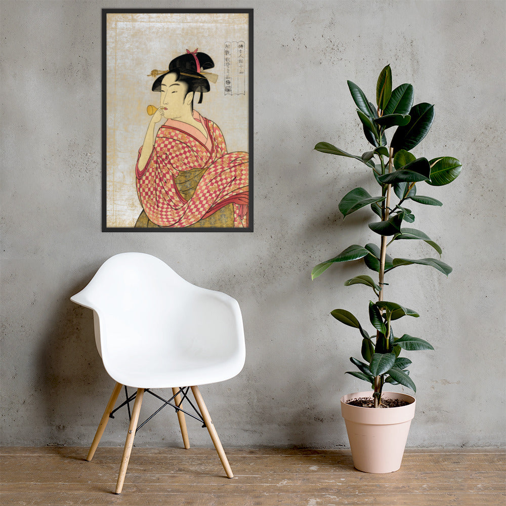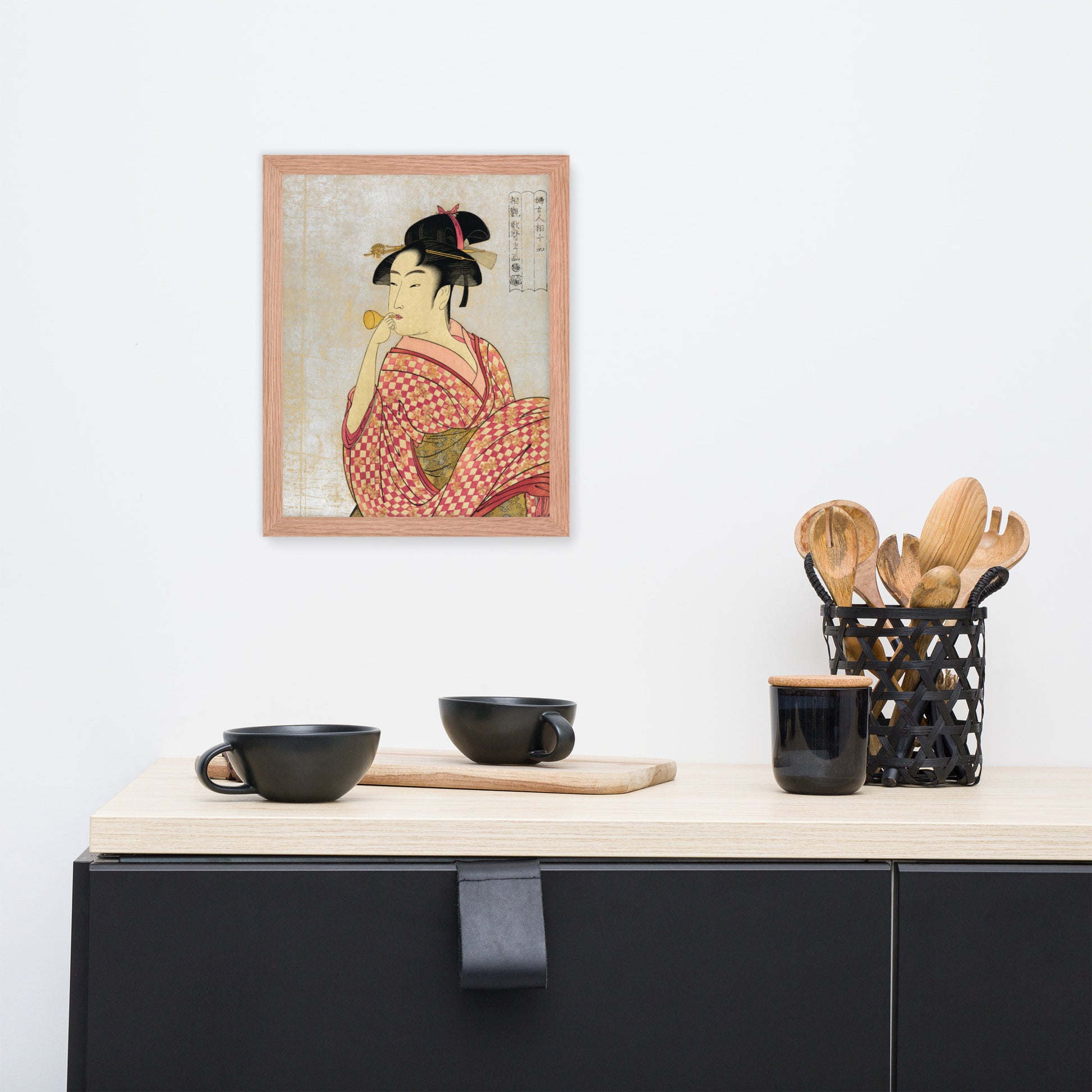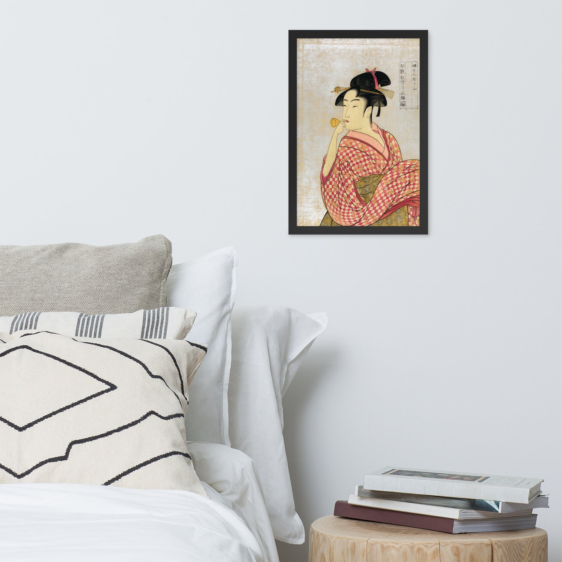 Elevate your space with Young Lady Blowing on a Poppin by Kitagawa Utamaro, a captivating example of Japanese Woodblock Prints (Ukiyo-e). This framed artwork features a graceful young woman in a striking red and cream checkered kimono, delicately blowing on a poppin—a traditional glass toy that evokes playful charm and fleeting beauty. Her ornate hairstyle, adorned with hairpins and a crimson ribbon, reflects the refined fashion of Edo-period courtesans. The textured neutral background adds a timeless patina, enhancing the vintage allure of the piece.