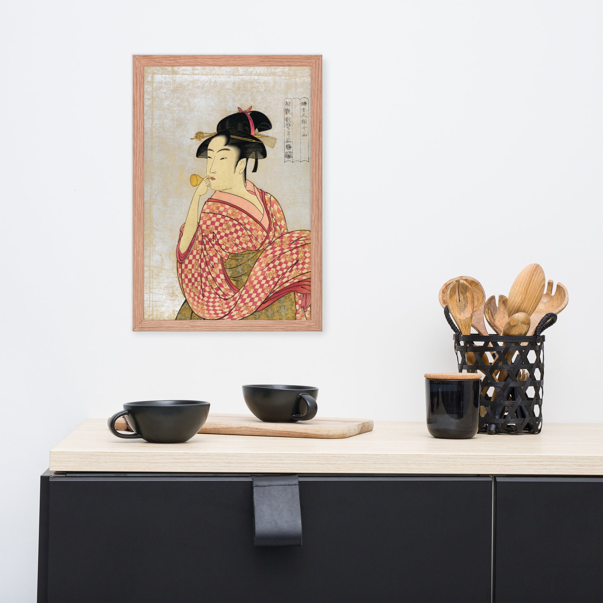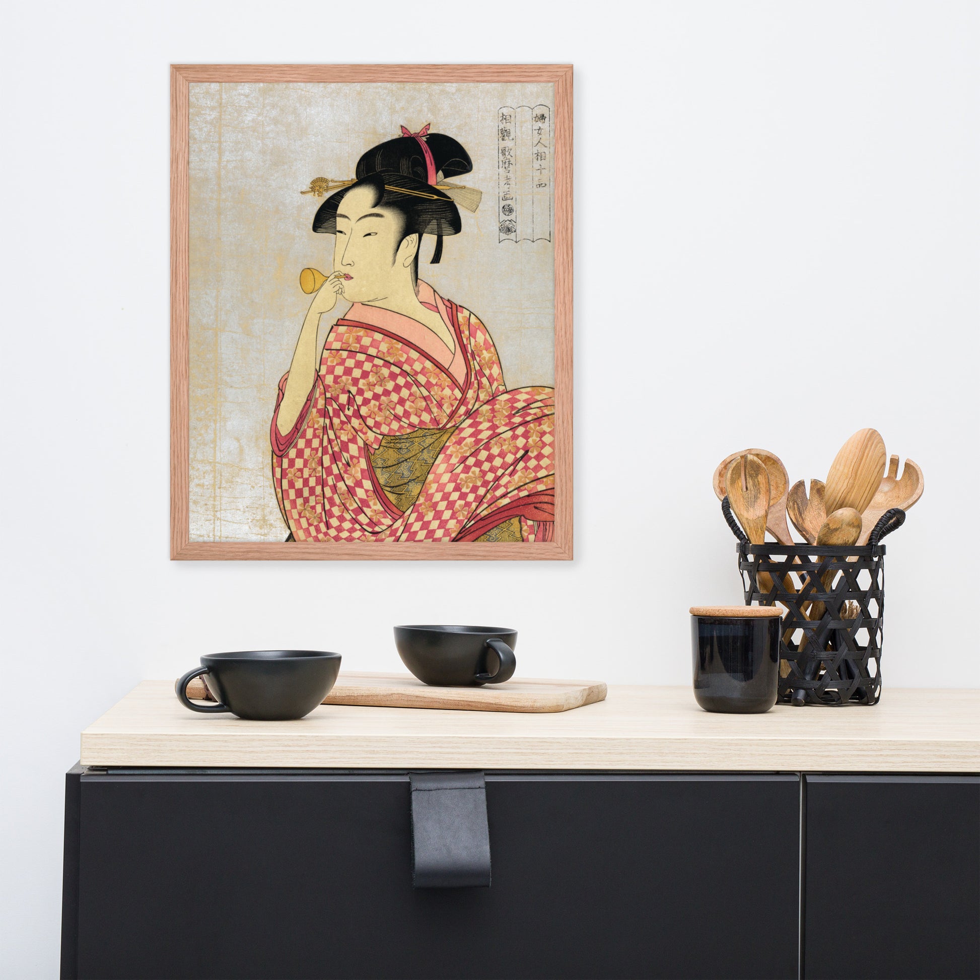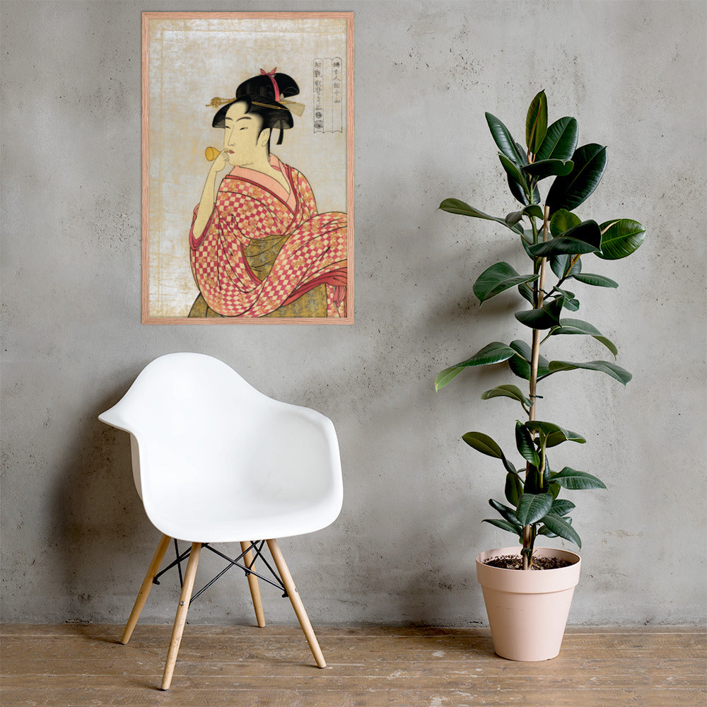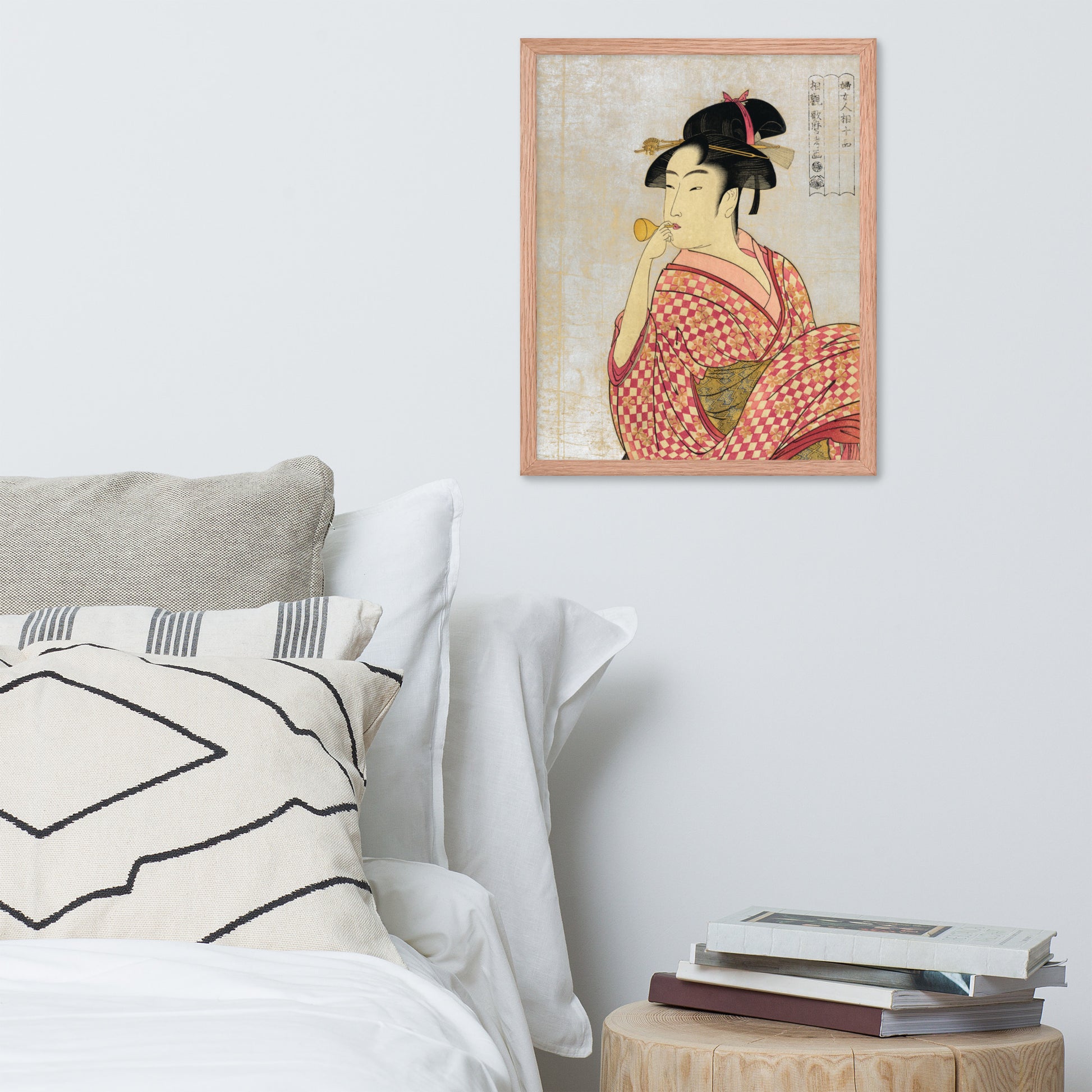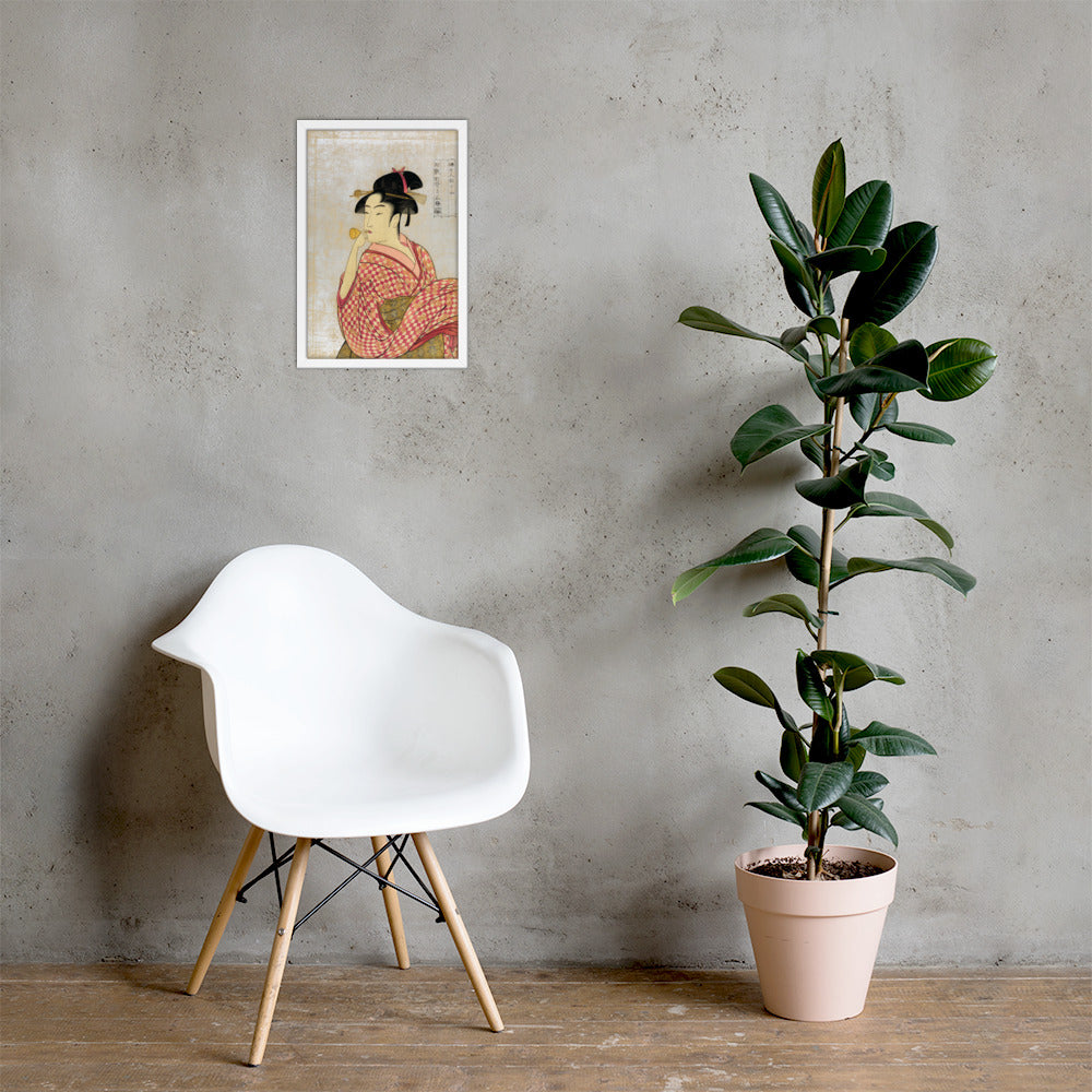 Elevate your space with Young Lady Blowing on a Poppin by Kitagawa Utamaro, a captivating example of Japanese Woodblock Prints (Ukiyo-e). This framed artwork features a graceful young woman in a striking red and cream checkered kimono, delicately blowing on a poppin—a traditional glass toy that evokes playful charm and fleeting beauty. Her ornate hairstyle, adorned with hairpins and a crimson ribbon, reflects the refined fashion of Edo-period courtesans. The textured neutral background adds a timeless patina, enhancing the vintage allure of the piece.