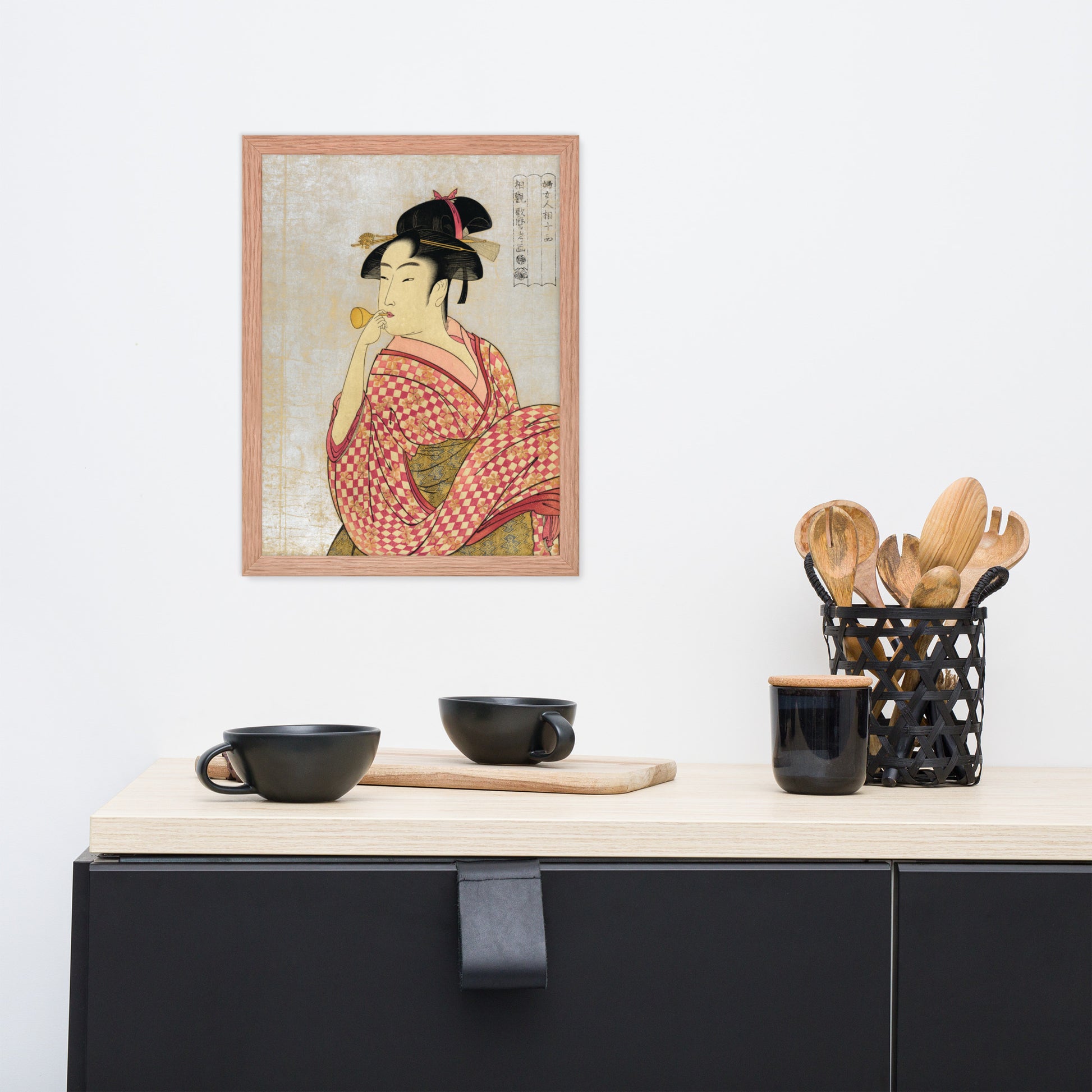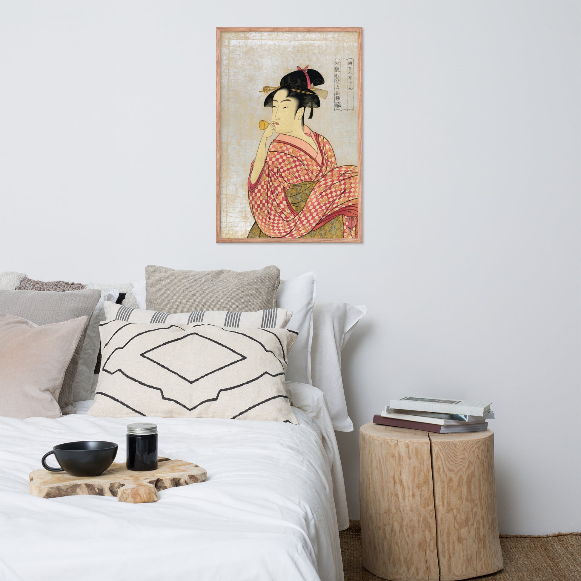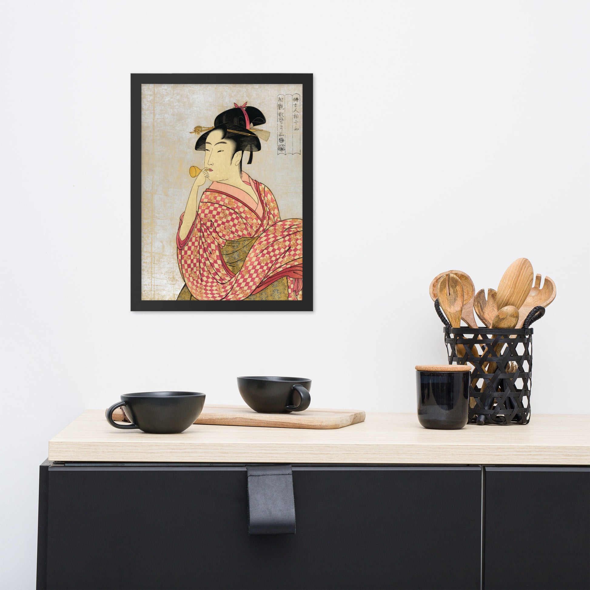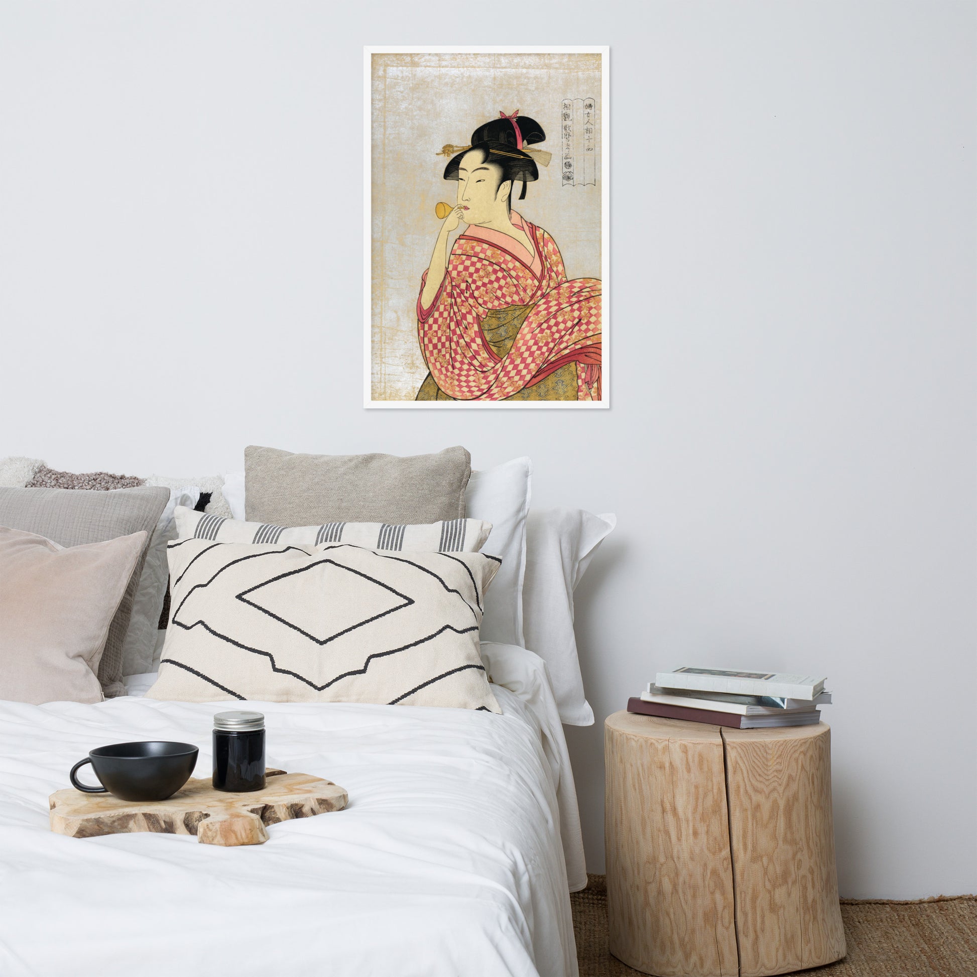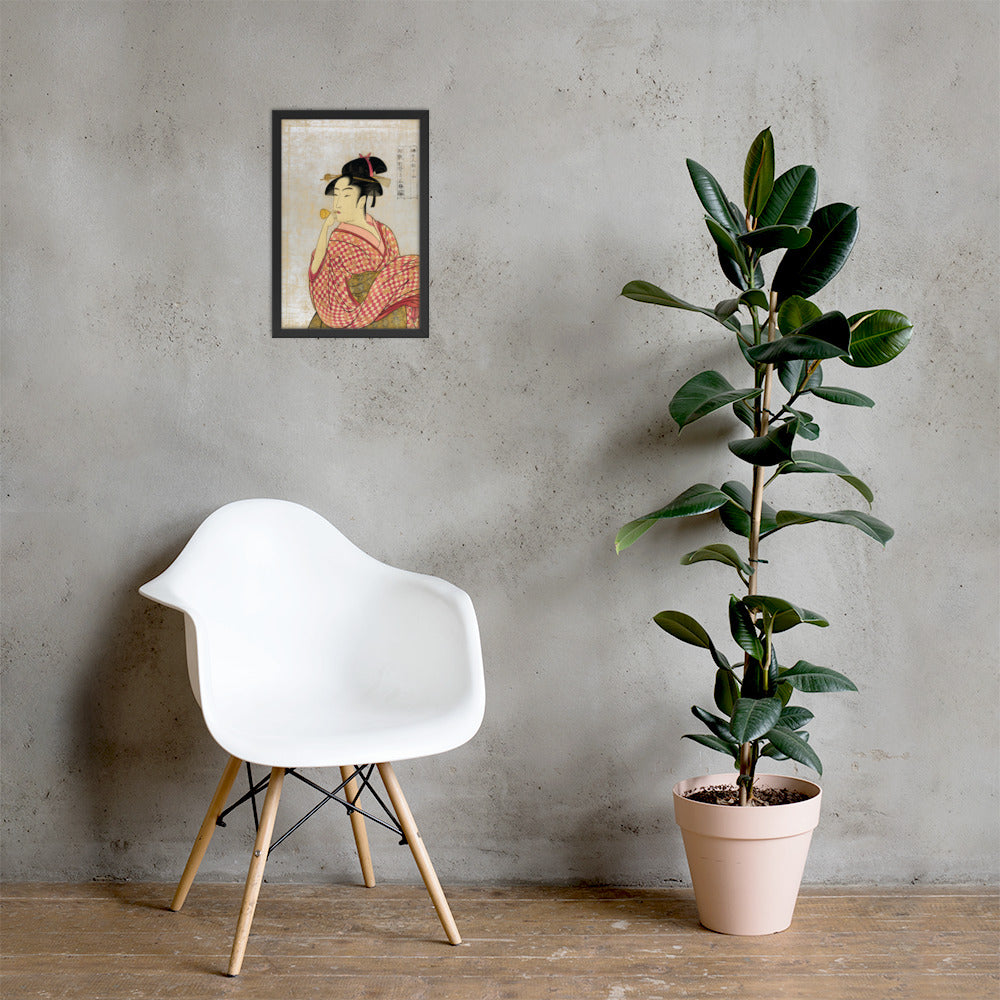 Elevate your space with Young Lady Blowing on a Poppin by Kitagawa Utamaro, a captivating example of Japanese Woodblock Prints (Ukiyo-e). This framed artwork features a graceful young woman in a striking red and cream checkered kimono, delicately blowing on a poppin—a traditional glass toy that evokes playful charm and fleeting beauty. Her ornate hairstyle, adorned with hairpins and a crimson ribbon, reflects the refined fashion of Edo-period courtesans. The textured neutral background adds a timeless patina, enhancing the vintage allure of the piece.