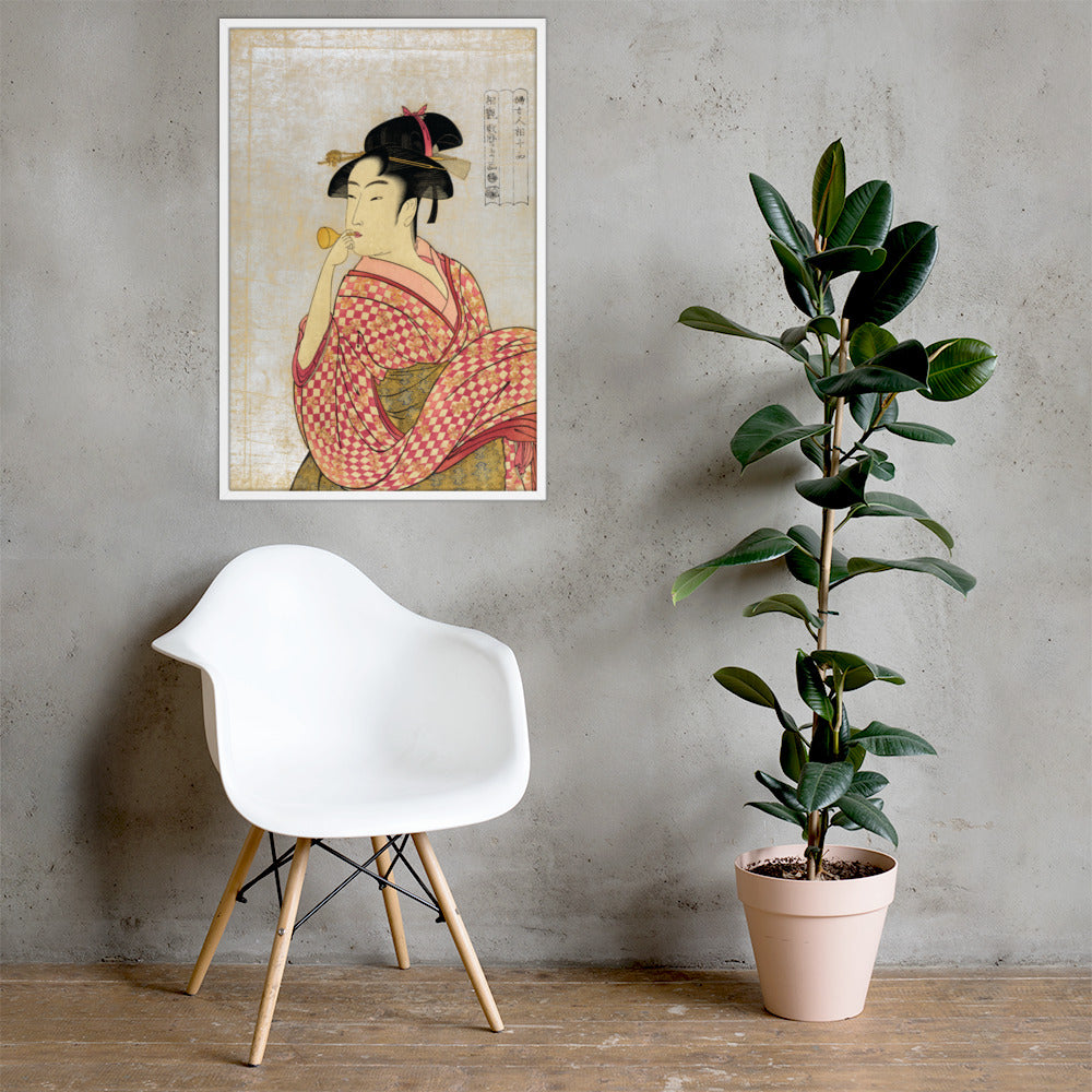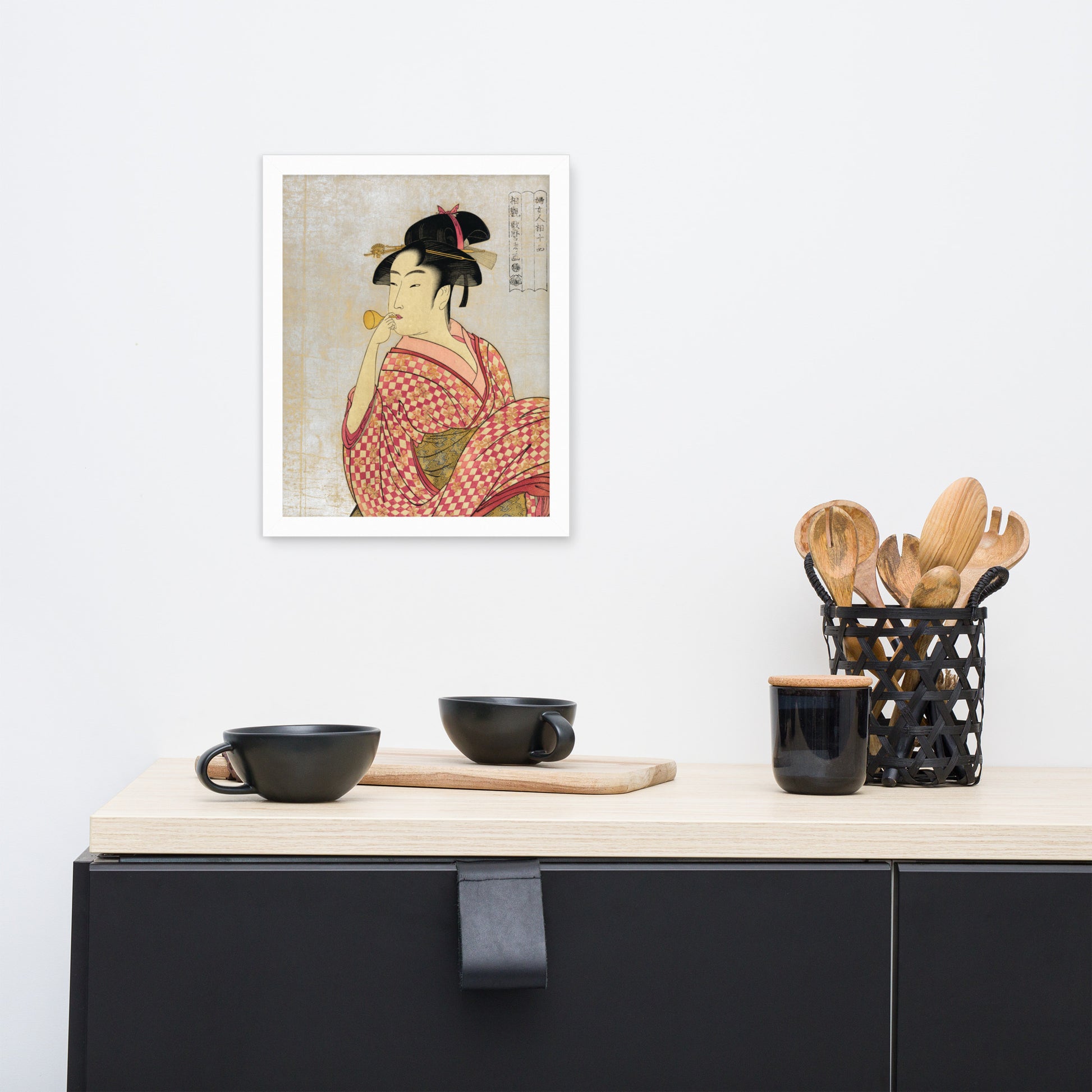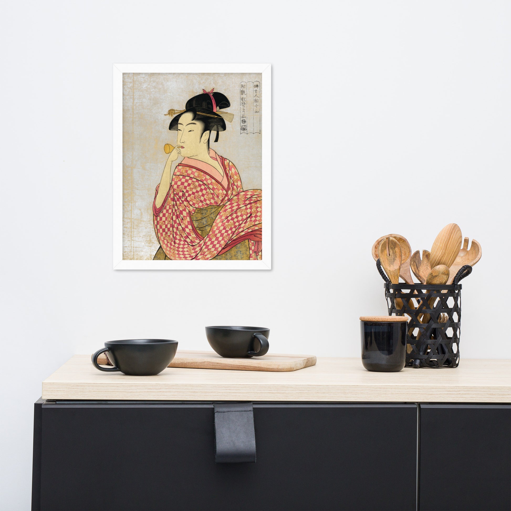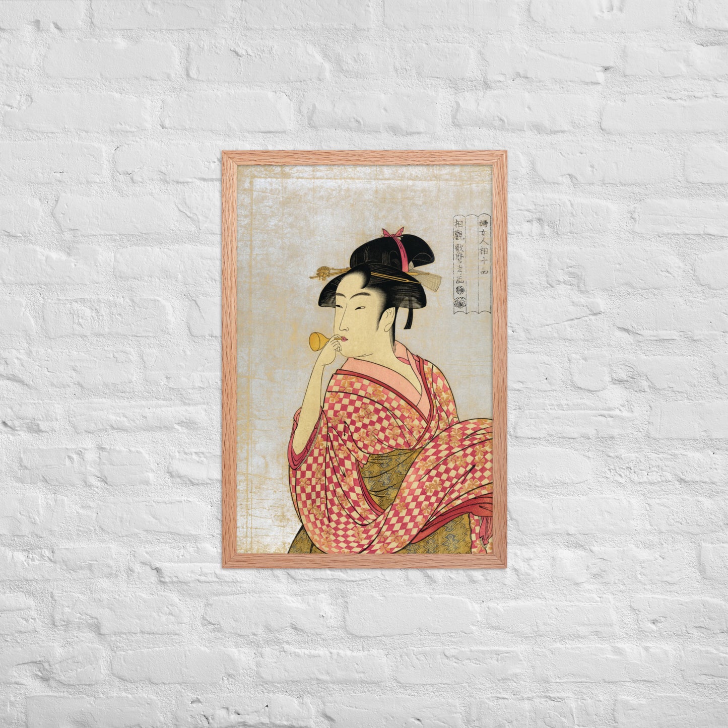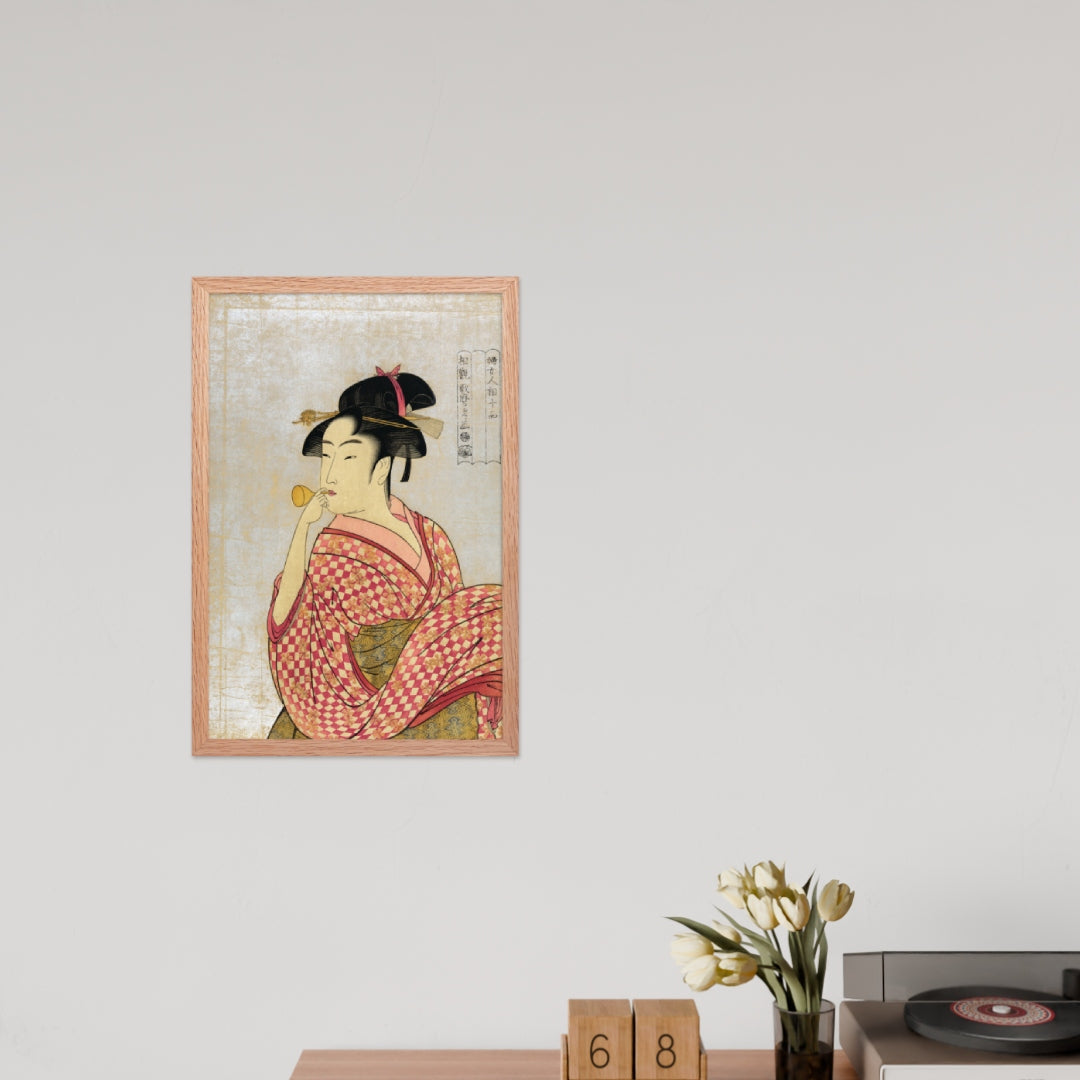 Elevate your space with Young Lady Blowing on a Poppin by Kitagawa Utamaro, a captivating example of Japanese Woodblock Prints (Ukiyo-e). This framed artwork features a graceful young woman in a striking red and cream checkered kimono, delicately blowing on a poppin—a traditional glass toy that evokes playful charm and fleeting beauty. Her ornate hairstyle, adorned with hairpins and a crimson ribbon, reflects the refined fashion of Edo-period courtesans. The textured neutral background adds a timeless patina, enhancing the vintage allure of the piece.